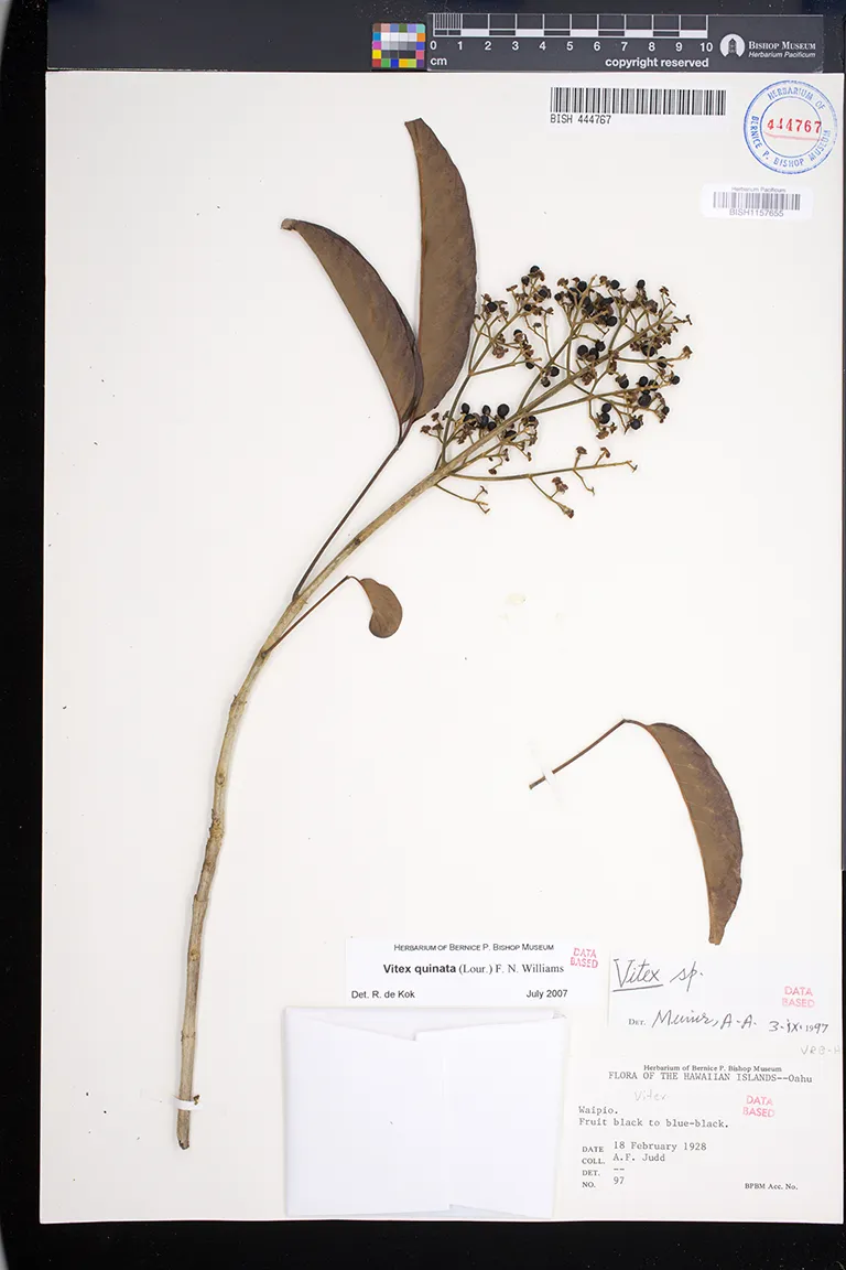 | 1 | Vitex quinata | (Lour.) F.N.Williams | Waipio | PRESERVED_SPECIMEN | Judd Jr., A.F. | 97 | Oahu | BISH | 2/18/1928 | |