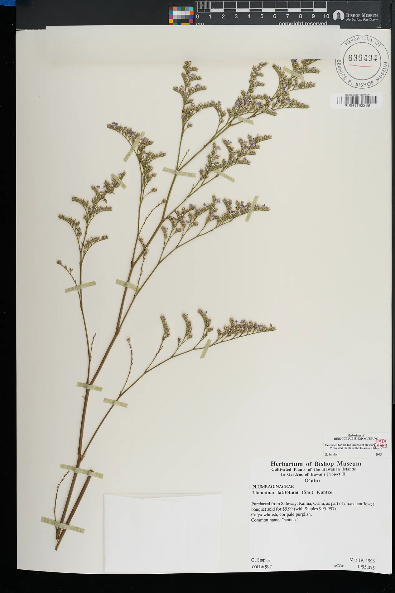 | 4 | Goniolimon tataricum | (L.) Boiss. | Kailua | PRESERVED_SPECIMEN | Staples, G.W. | Collector Number: 997 | Oahu | BISH | 3/19/1995 | |