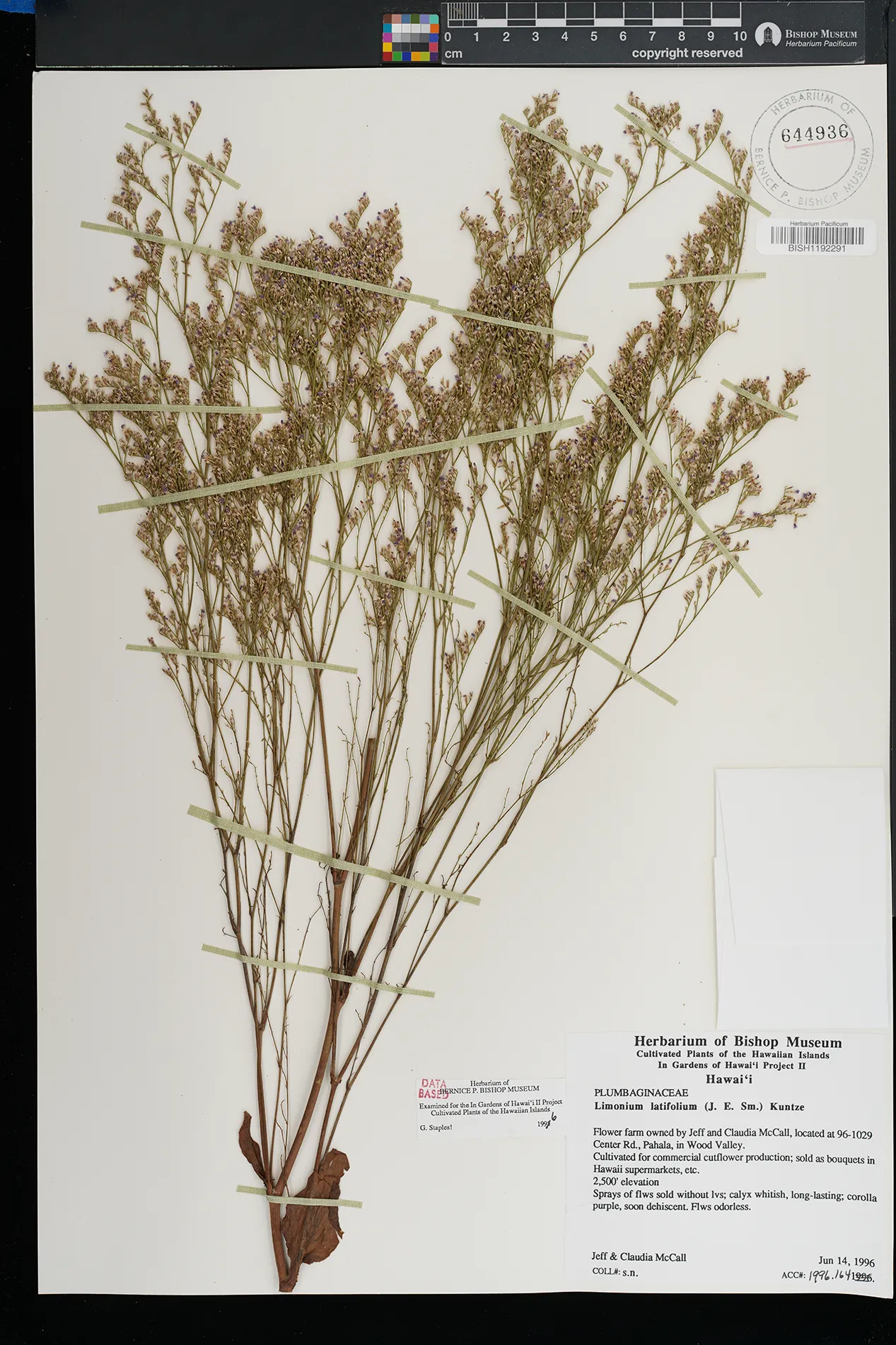 | 9 | Goniolimon tataricum | (L.) Boiss. | Pahala; in Wood Valley, 96-1029 Center Road, home of Jeff & Claudia McCall | PRESERVED_SPECIMEN | McCall, J. | s.n. | Hawaii | BISH | 6/14/1996 | |