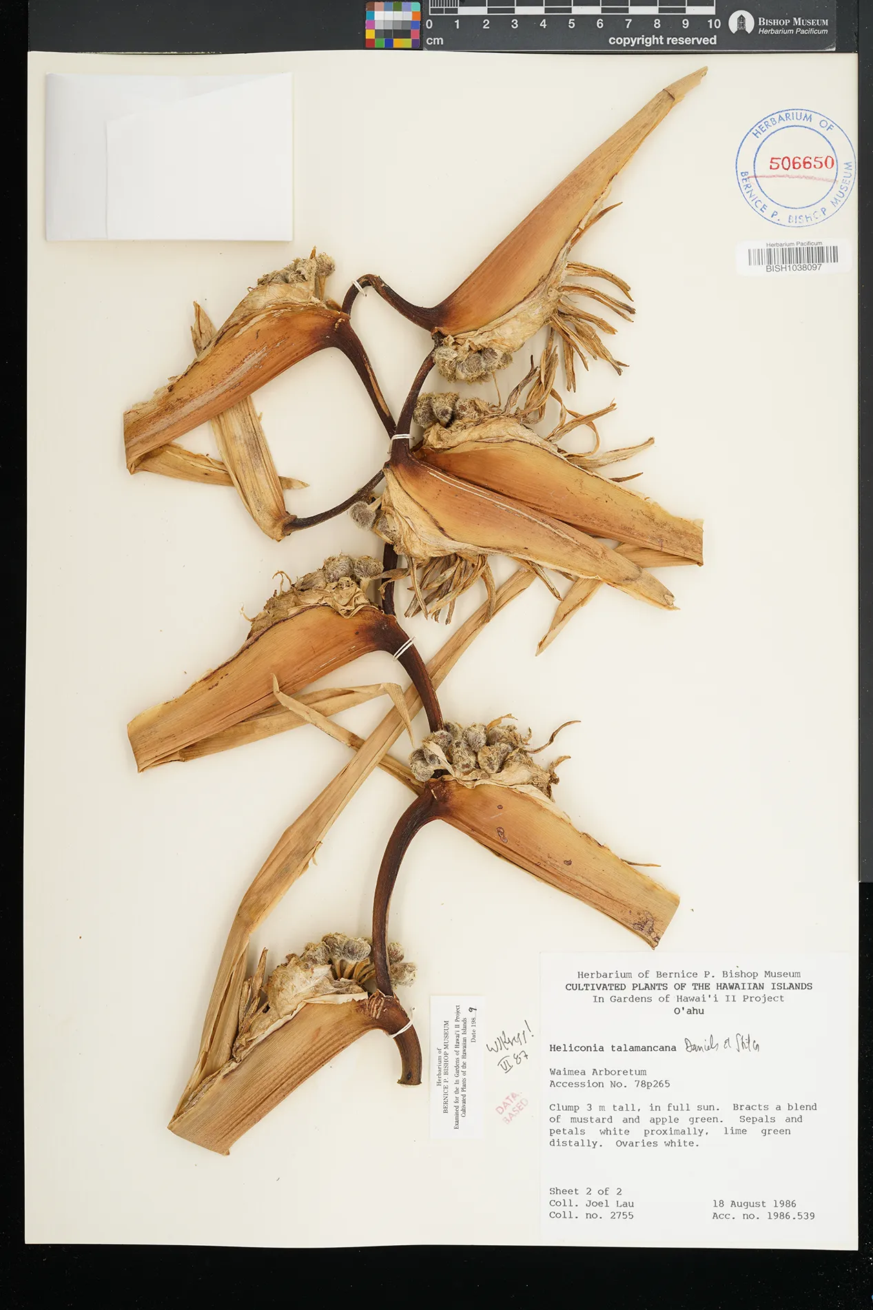 | 2 | Heliconia talamancana | Waimea Arboretum | In full sun. | Preserved_Specimen | Clump 3 m ht; bracts a blend of mustard & apple grn; sepals & petals white proximally, lime grn distally; ovaries white. | Lau, J. | 2755 | Oahu | BISH | 1986-08-18 |