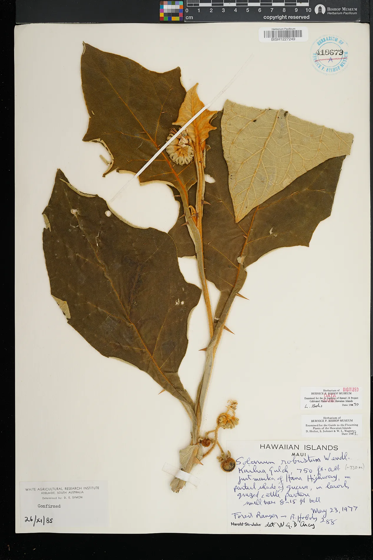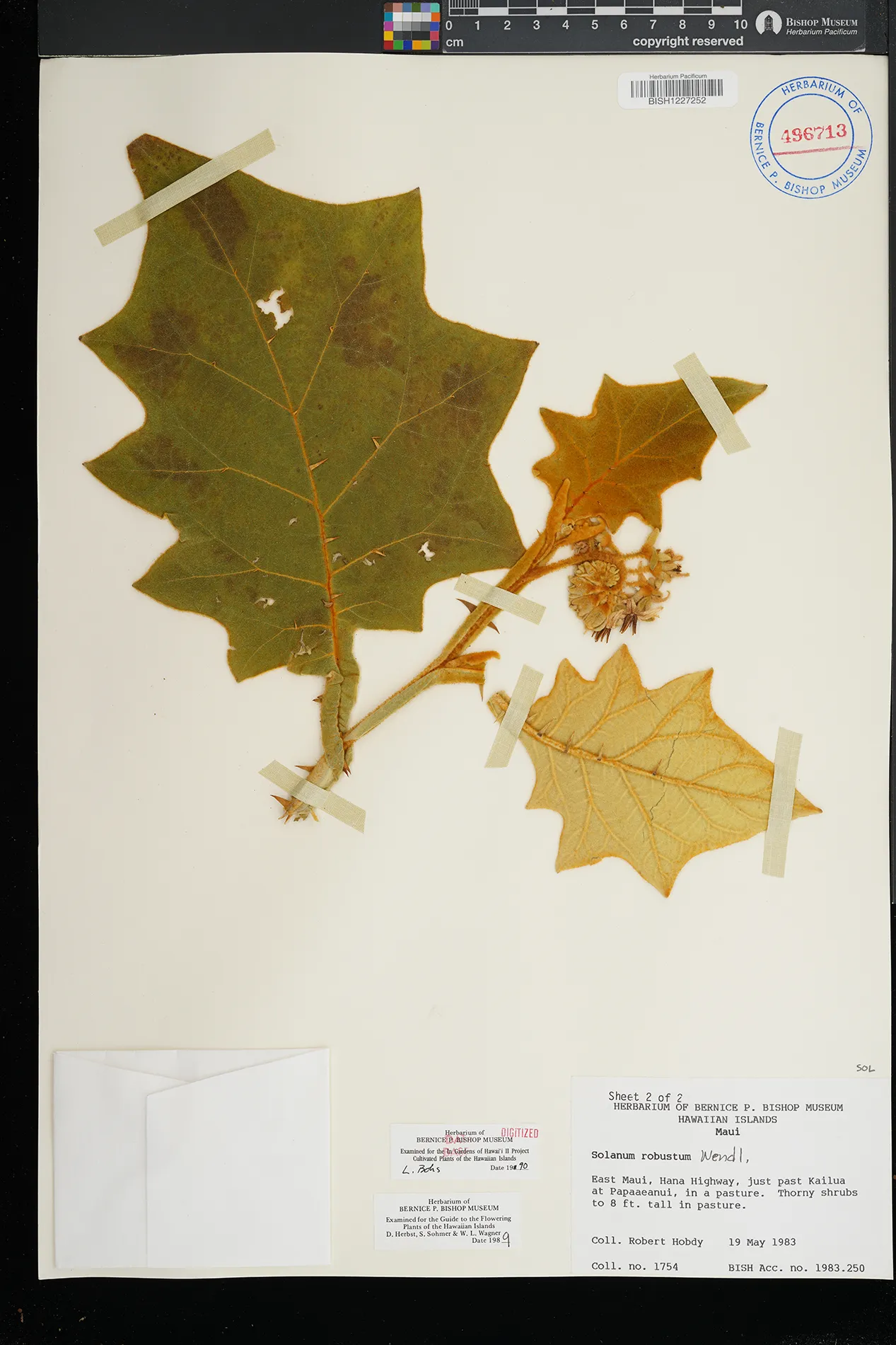 7 Solanum robustum H.Wendl. East Maui, Makawao District, Hana Hwy., just past Kailua at Papaaeanui In pasture. PRESERVED_SPECIMEN Hobdy, R.W. 1754 Maui BISH 5/19/1983