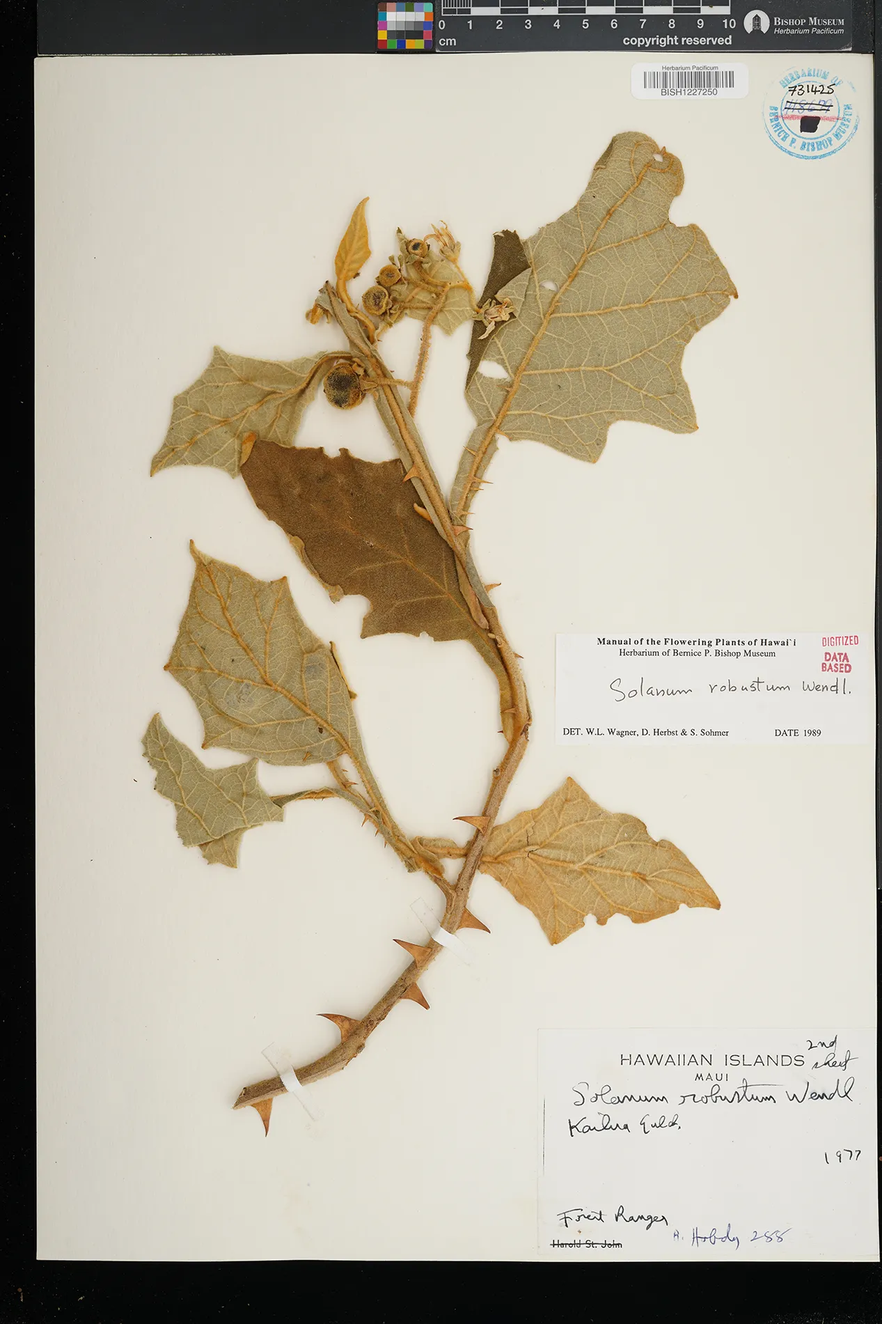 3 Solanum robustum H.Wendl. MAUI: E. Maui, Makawao District, Papaaea. PRESERVED_SPECIMEN Hank Oppenheimer H110111 Maui PTBG 11/12/2001
