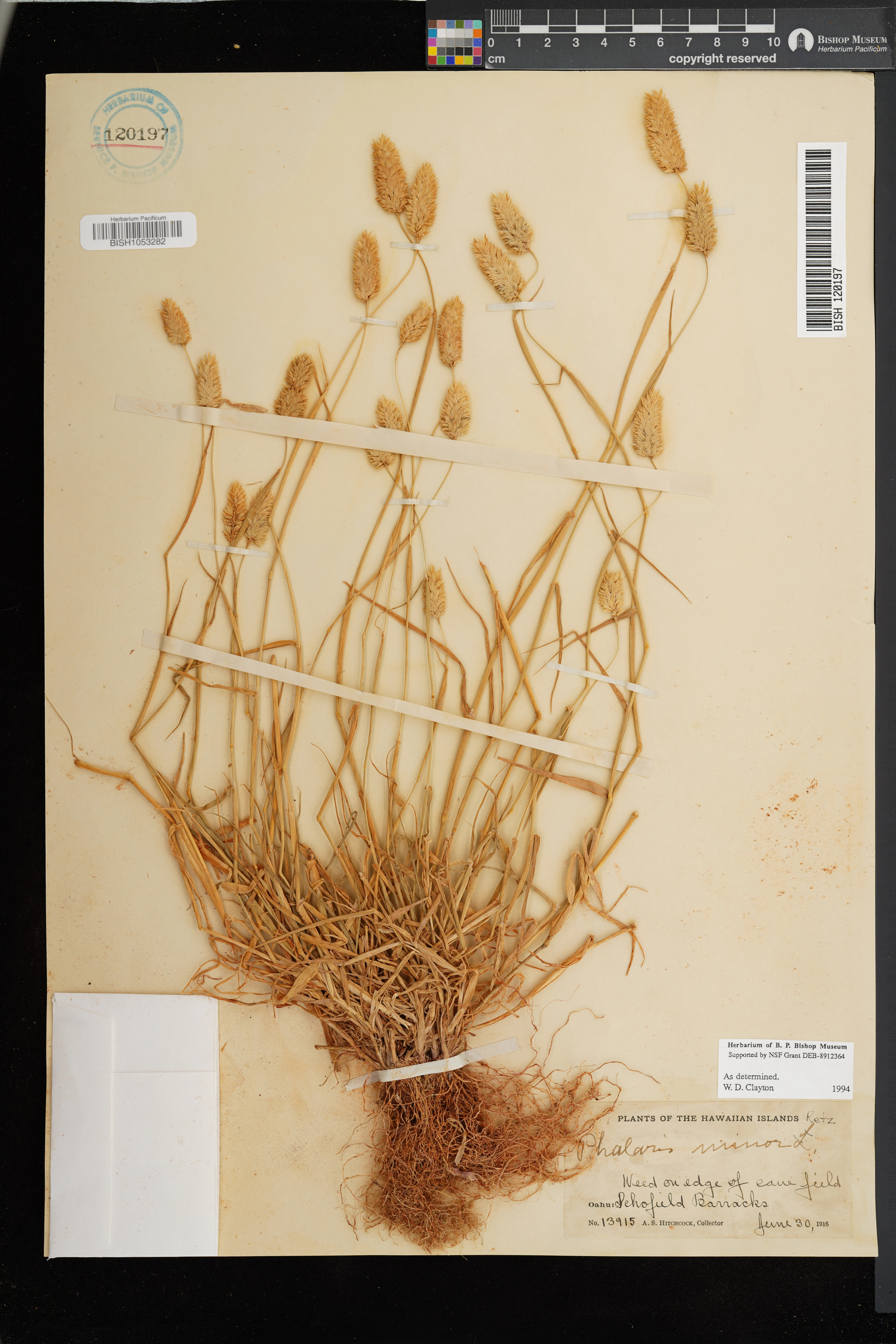 | 11 | Phalaris minor | Retz. | Schofield Barracks | Weed on edge of canefield. | PRESERVED_SPECIMEN | Hitchcock, A.S. | 13915 | Oahu | BISH | 6/30/1916 |