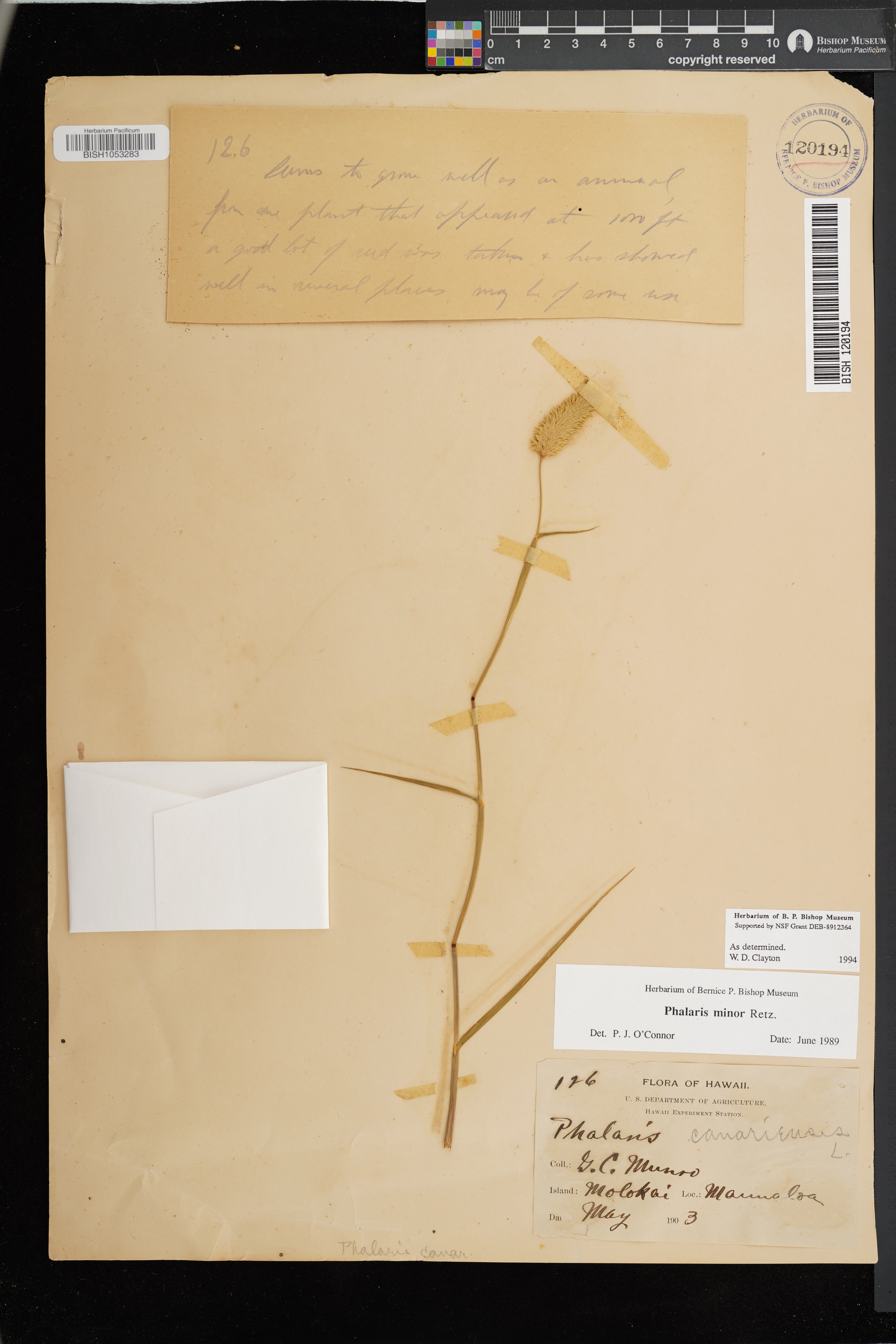 | 14 | Phalaris minor | Retz. | maunaloa | forest, wet slopes | PRESERVED_SPECIMEN | munro, g.c. | collector number: 126 | Oahu | BISH | 5/1/1903 |