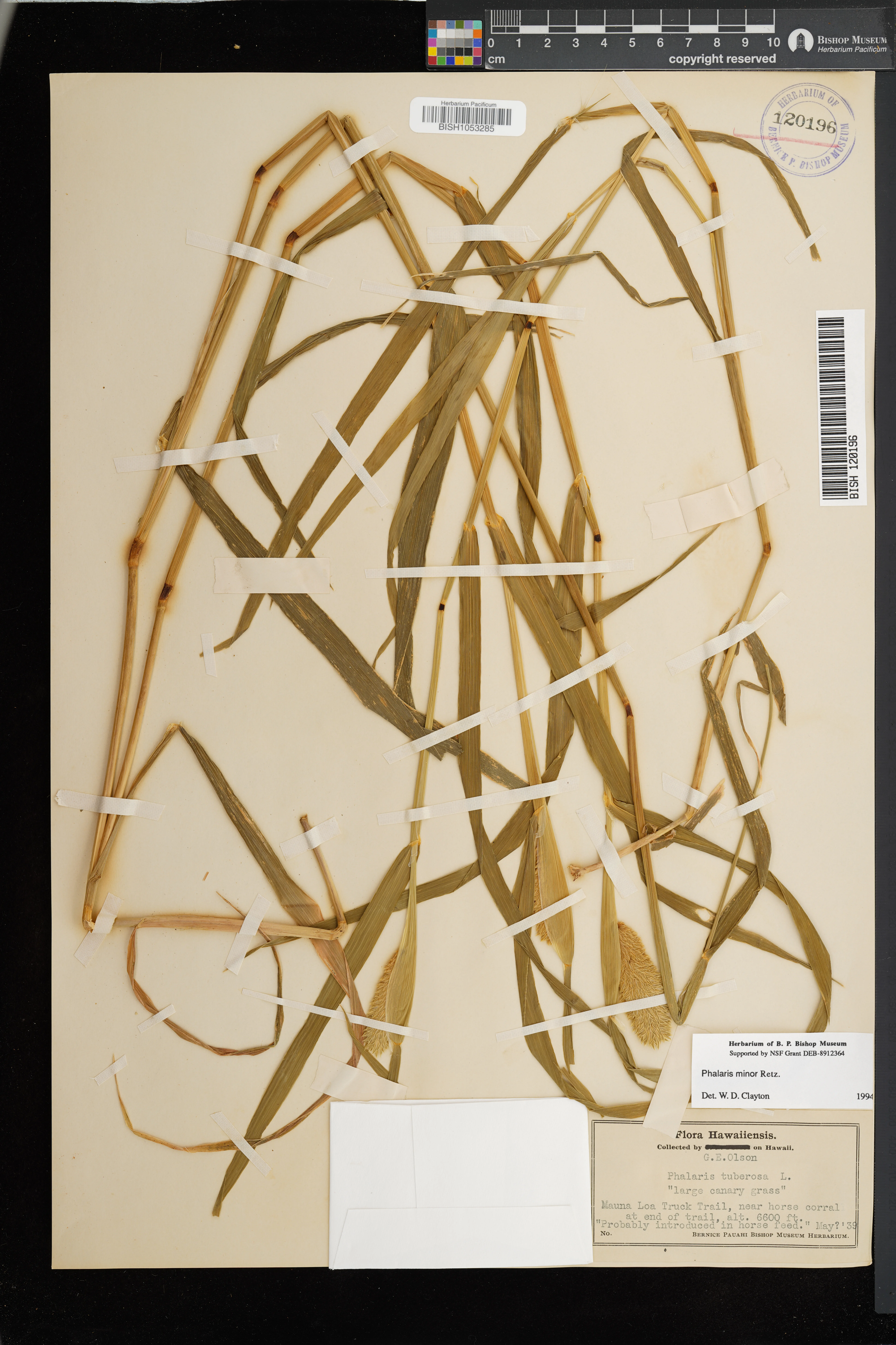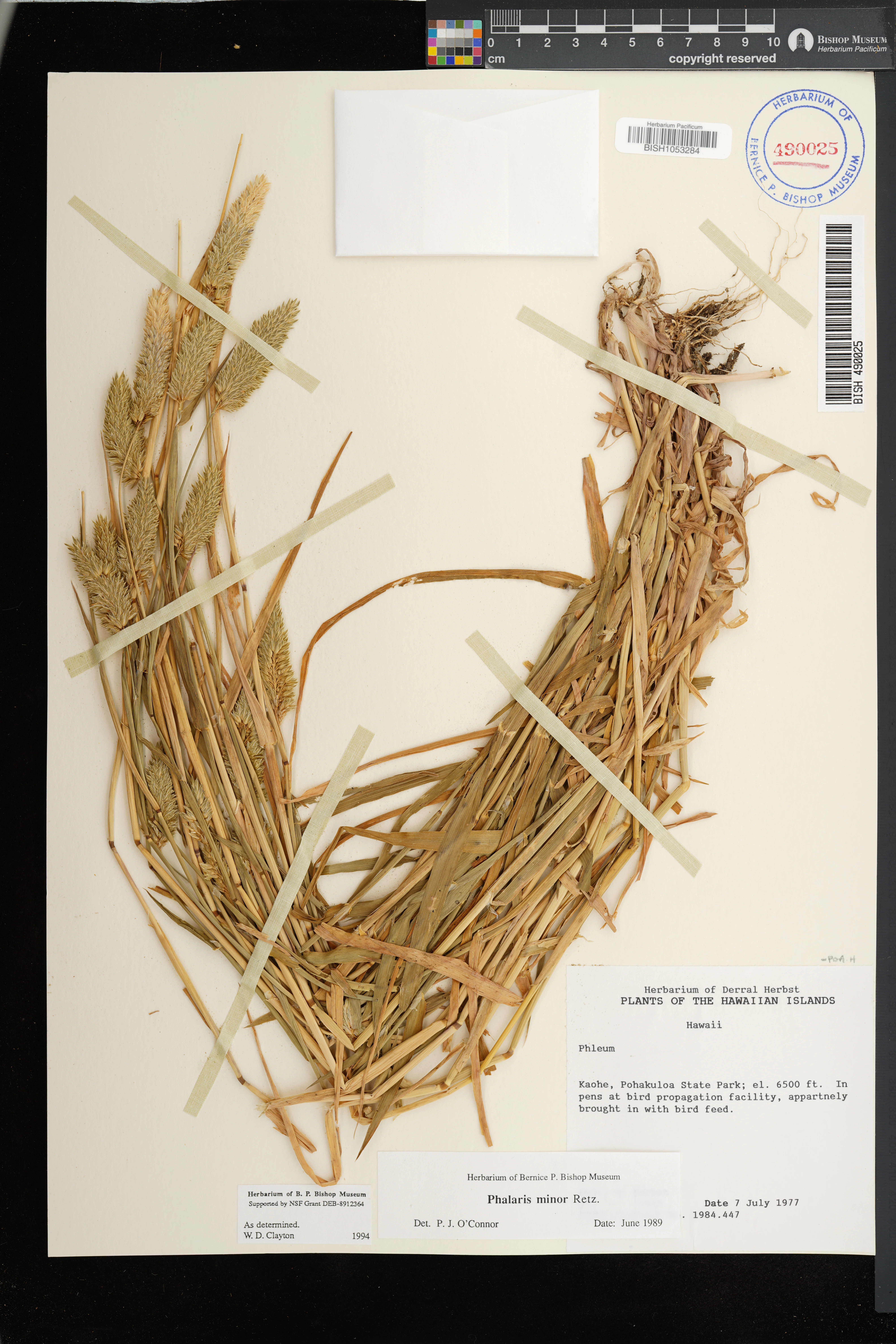 | 2 | Phalaris minor | Retz. | Kaohe, Pohakuloa State Park | In pens at bird propagation facility. | PRESERVED_SPECIMEN | Herbst, D.R. | 5945 | Hawaii | BISH | 7/7/1977 |