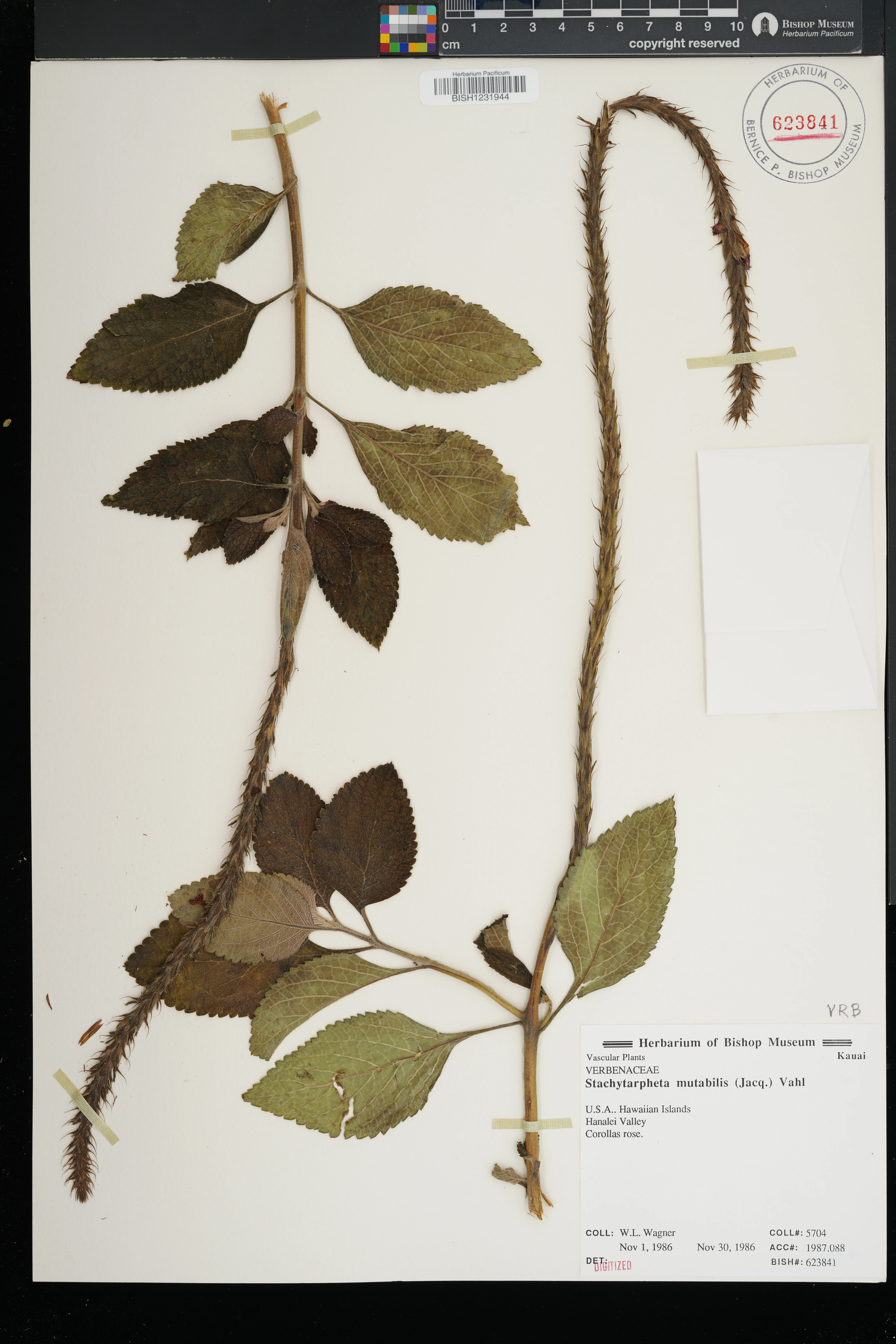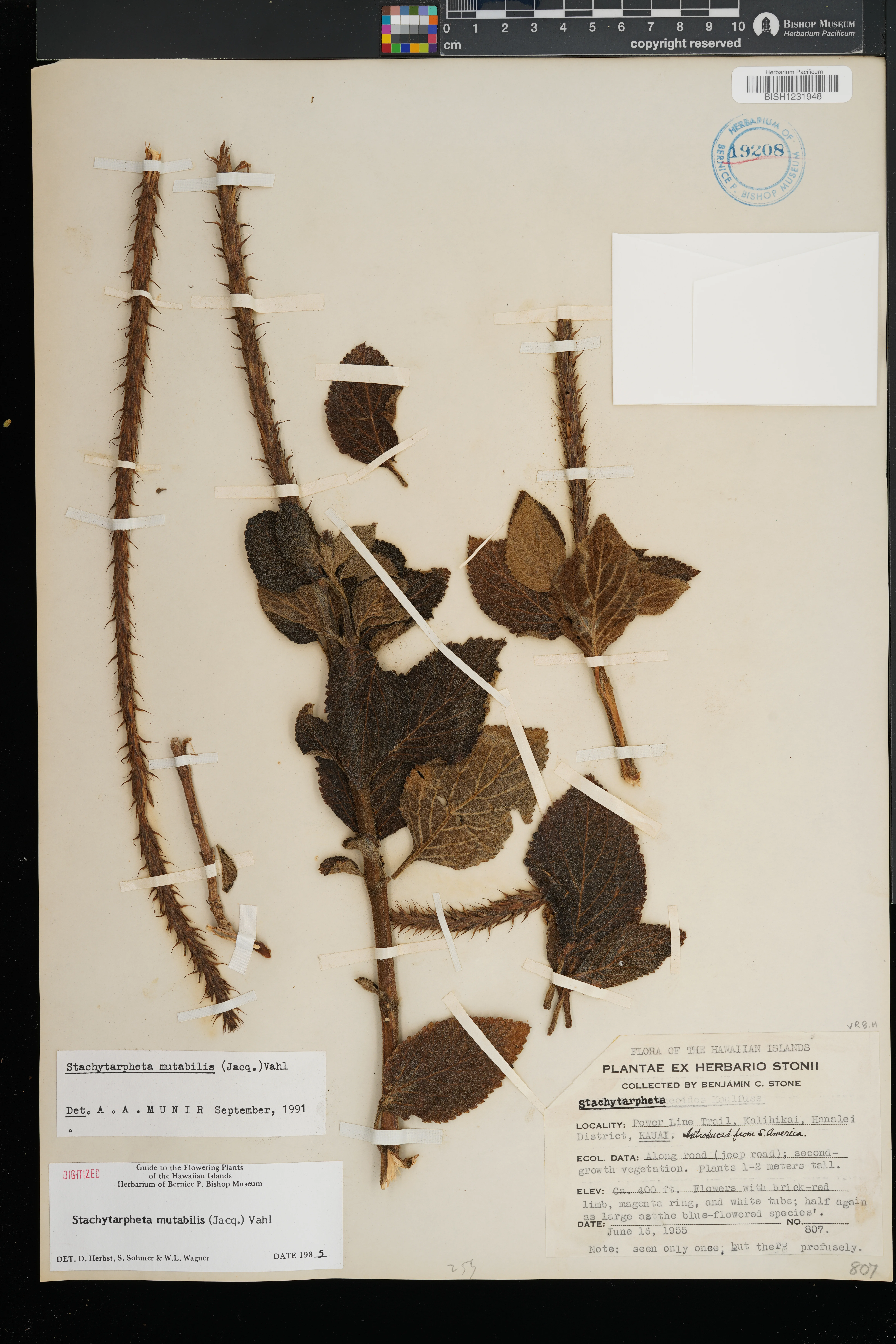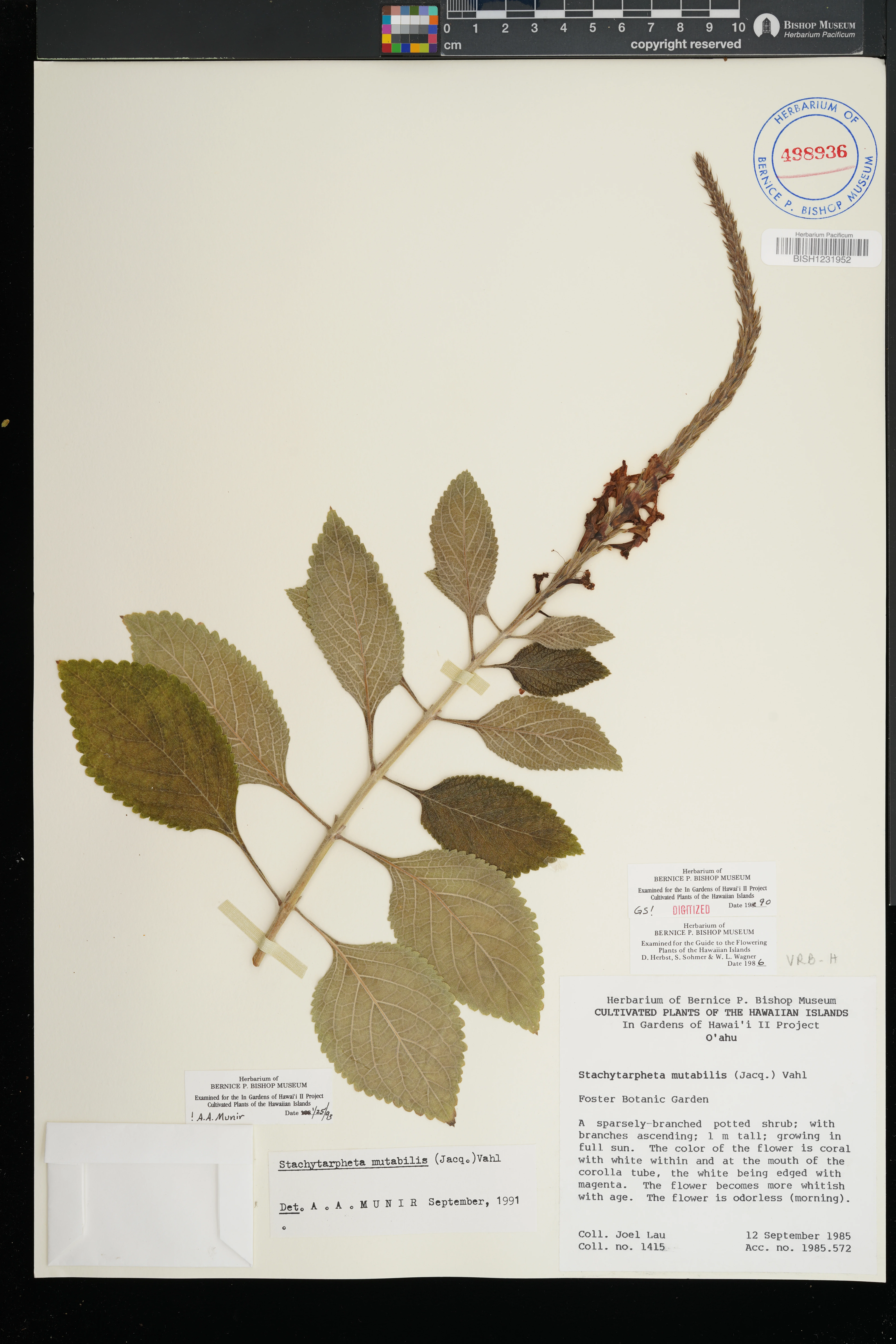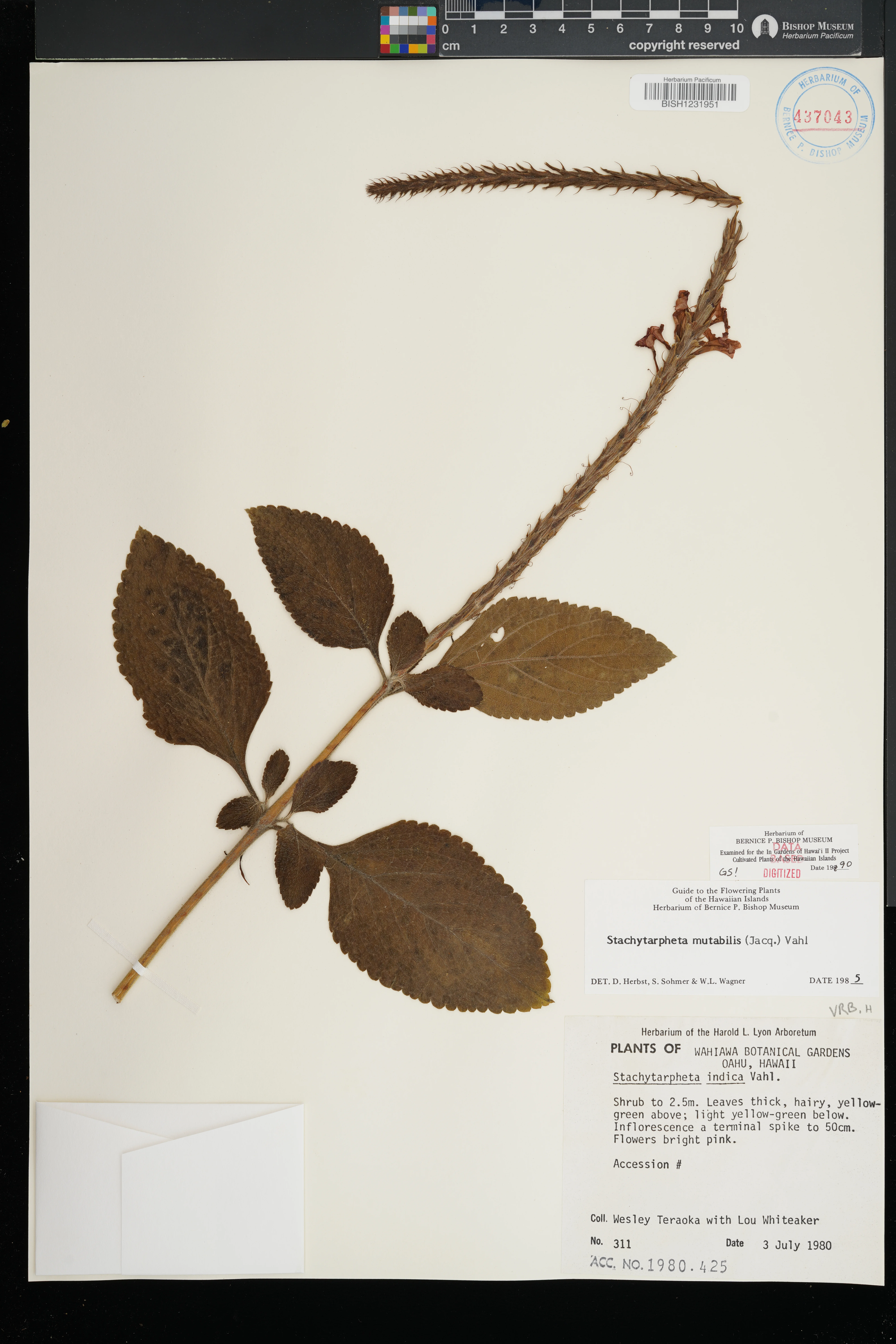 | 11 | Stachytarpheta mutabilis | (Jacq.) Vahl | Wahiawa Botanical Gardens | PRESERVED_SPECIMEN | Teraoka, W. | 311 | Oahu | BISH | 7/3/1980 | |