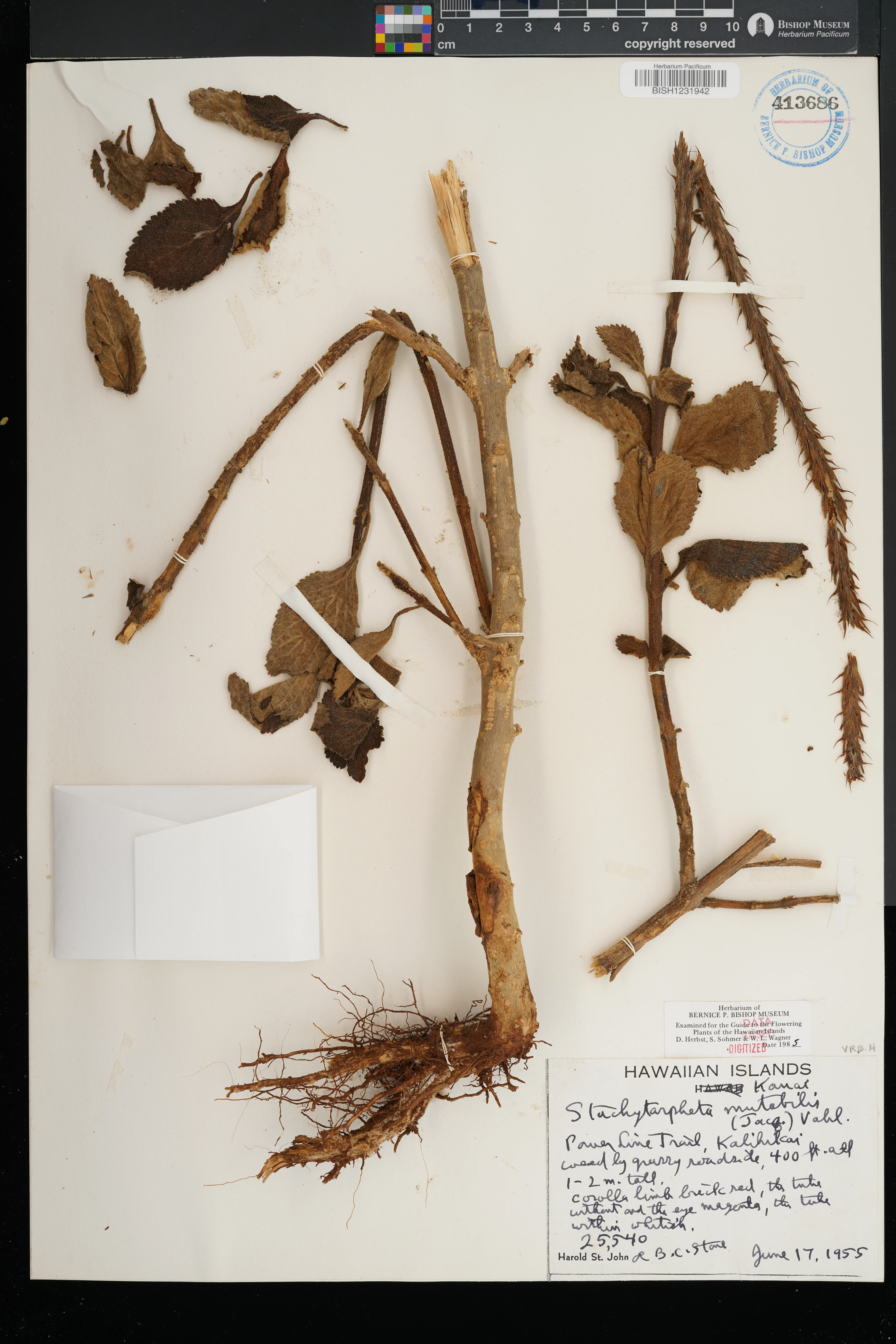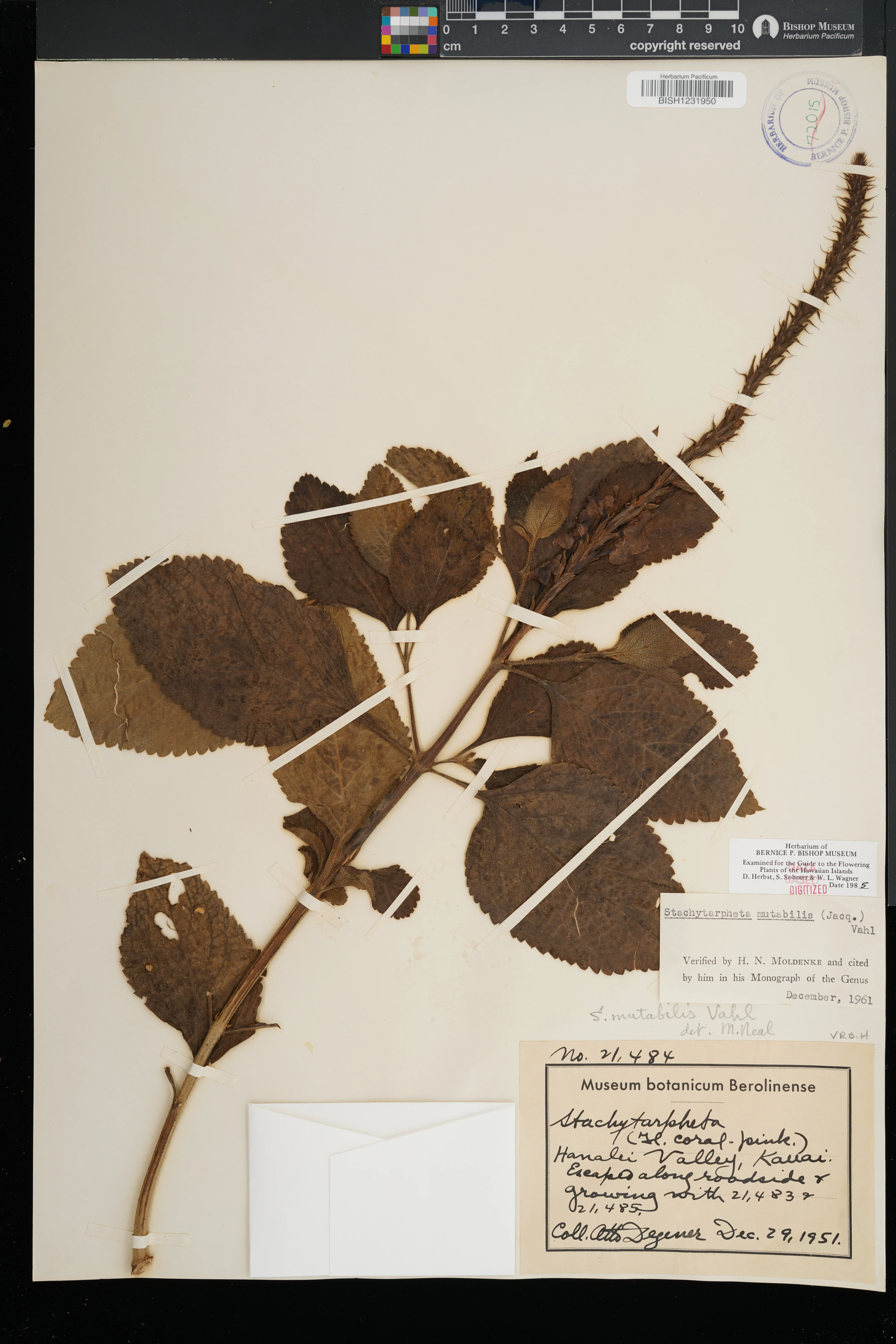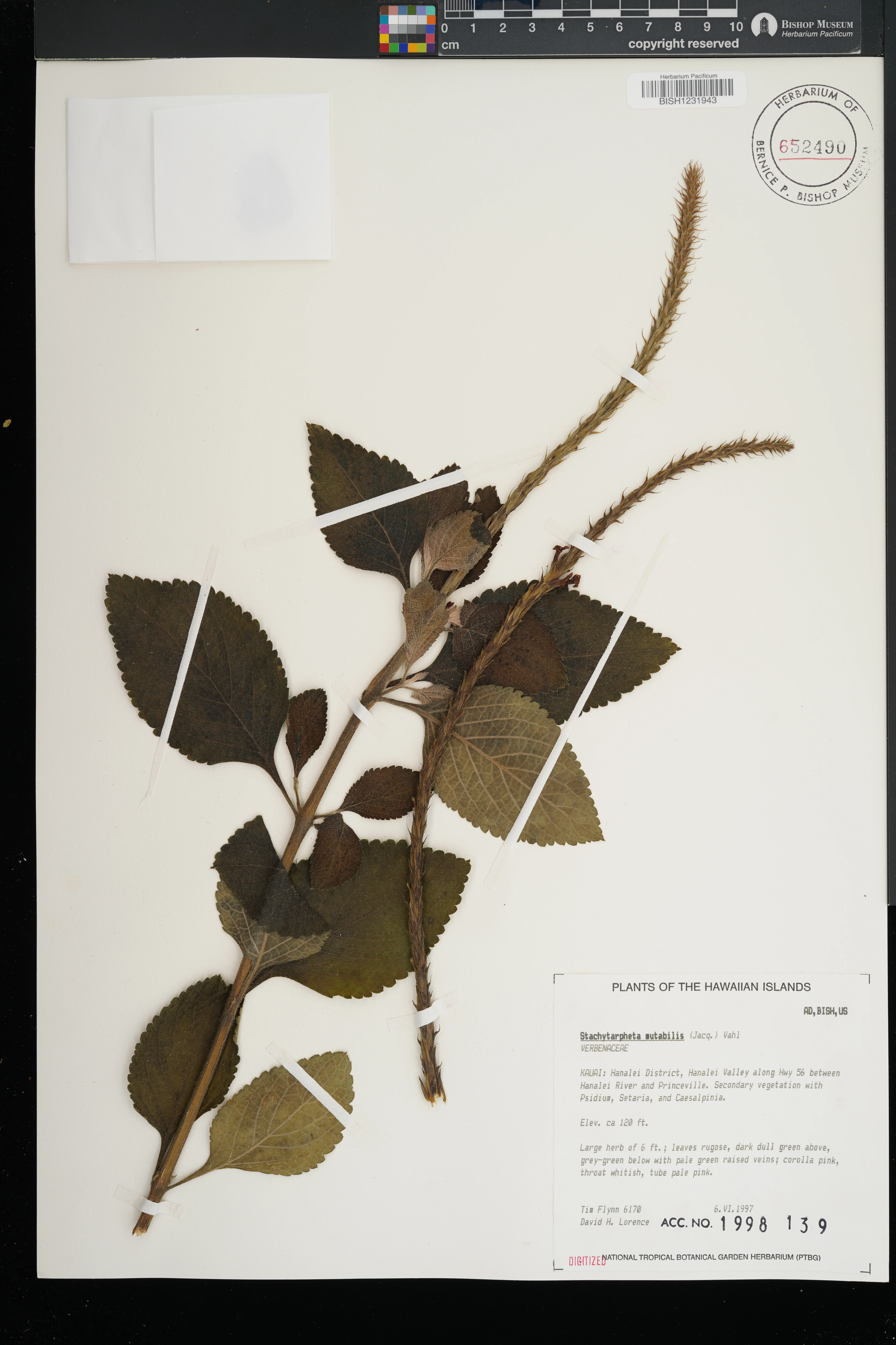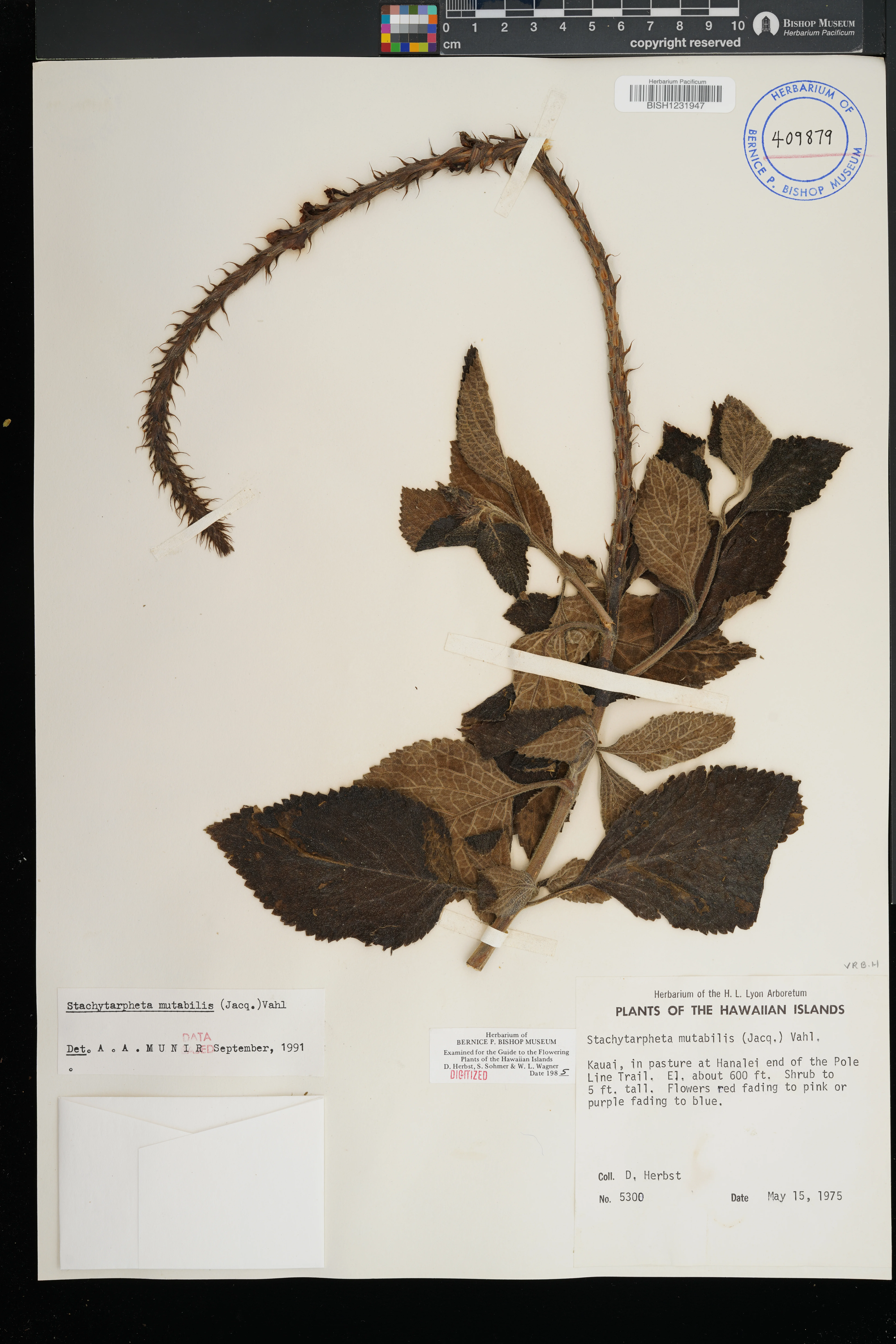 | 11 | Stachytarpheta mutabilis | (Jacq.) Vahl | Wahiawa Botanical Gardens | PRESERVED_SPECIMEN | Teraoka, W. | 311 | Oahu | BISH | 7/3/1980 | |