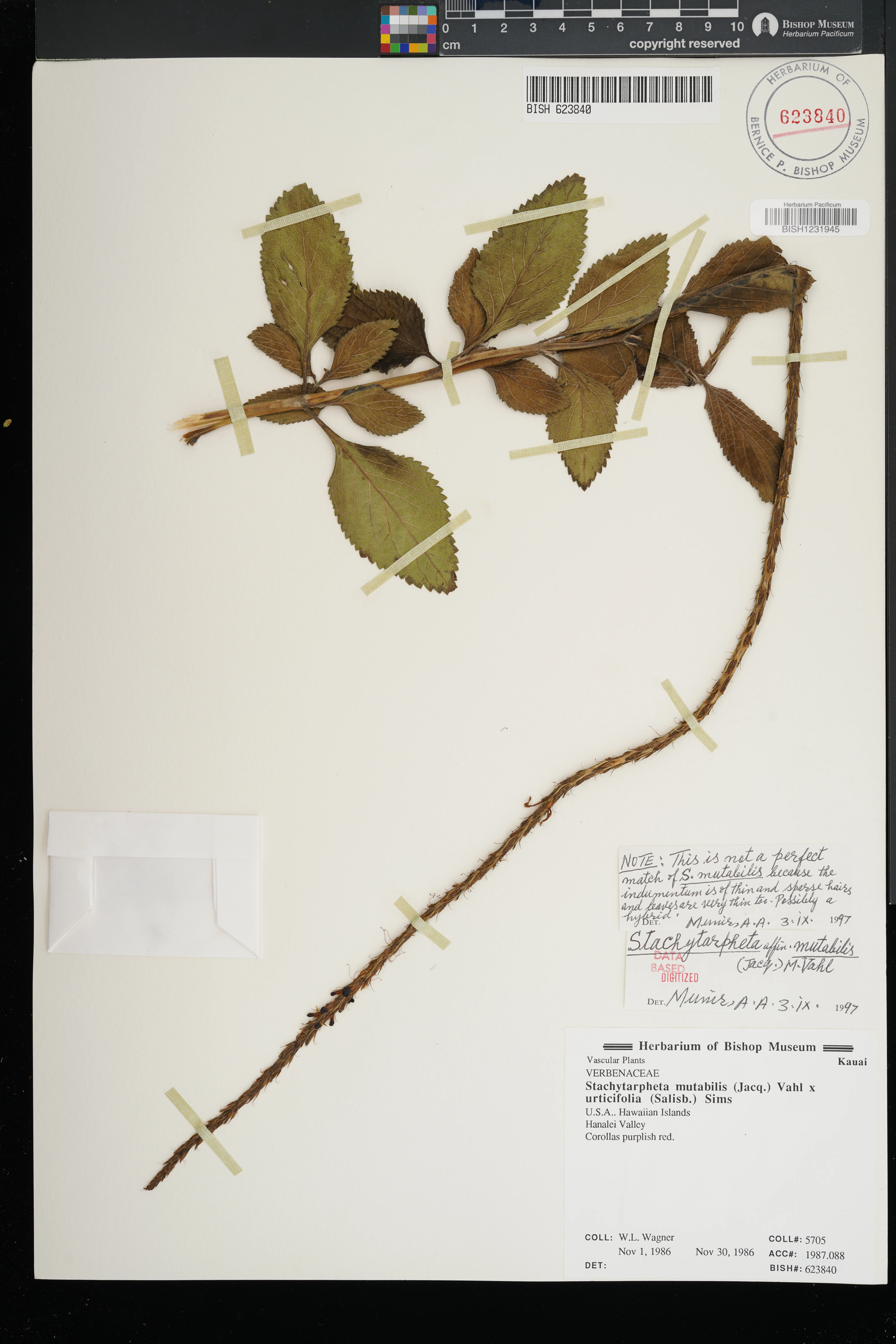 | 7 | Stachytarpheta mutabilis | (Jacq.) Vahl | Hanalei Valley | PRESERVED_SPECIMEN | Wagner, W.L. | 5704 | Kauai | BISH | 11/1/1986 | |