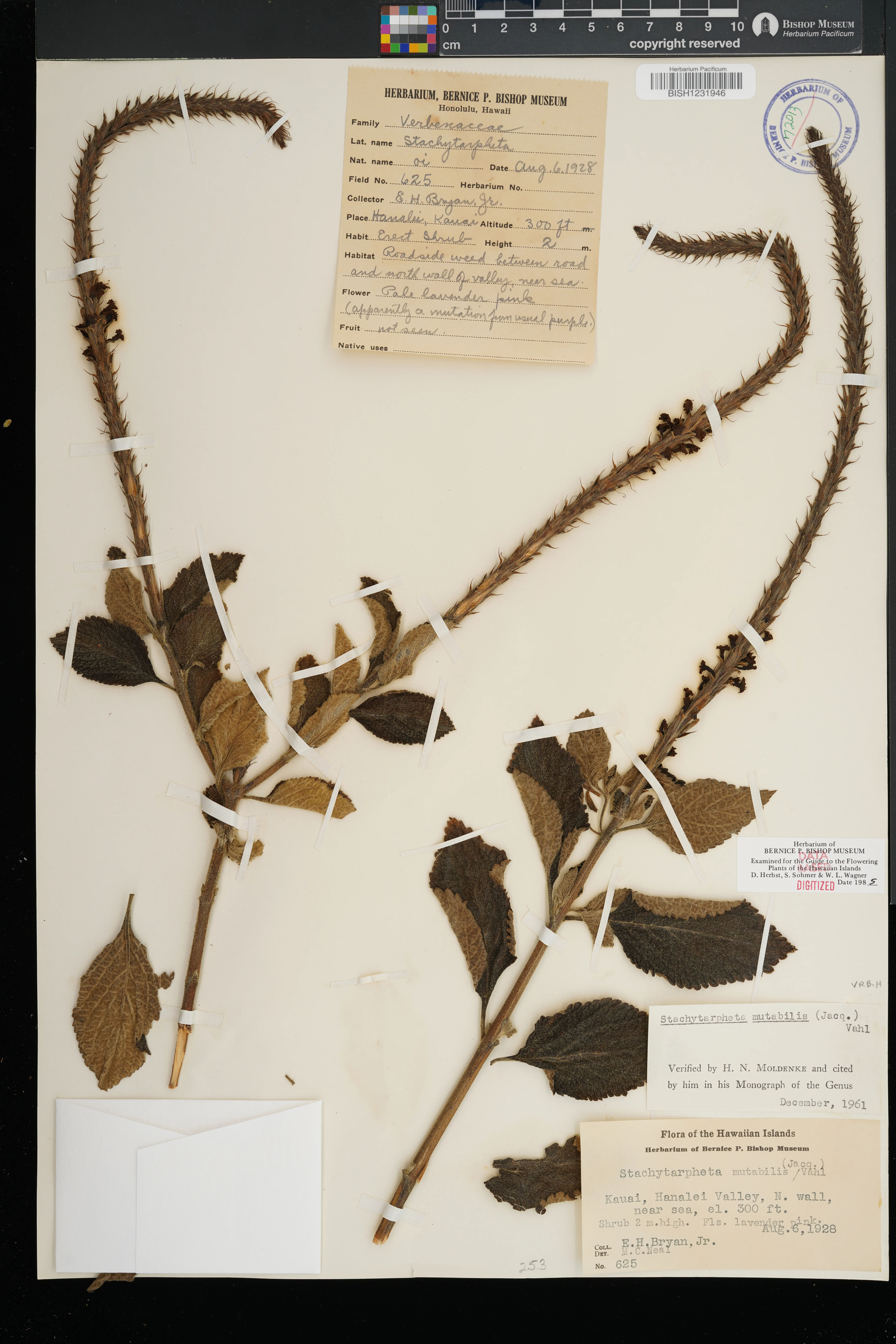 | 6 | Stachytarpheta mutabilis | (Jacq.) Vahl | hanalei valley, n wall, near sea | PRESERVED_SPECIMEN | bryan jr., e.h. | collector number: 625 | Kauai | BISH | 8/6/1928 | |