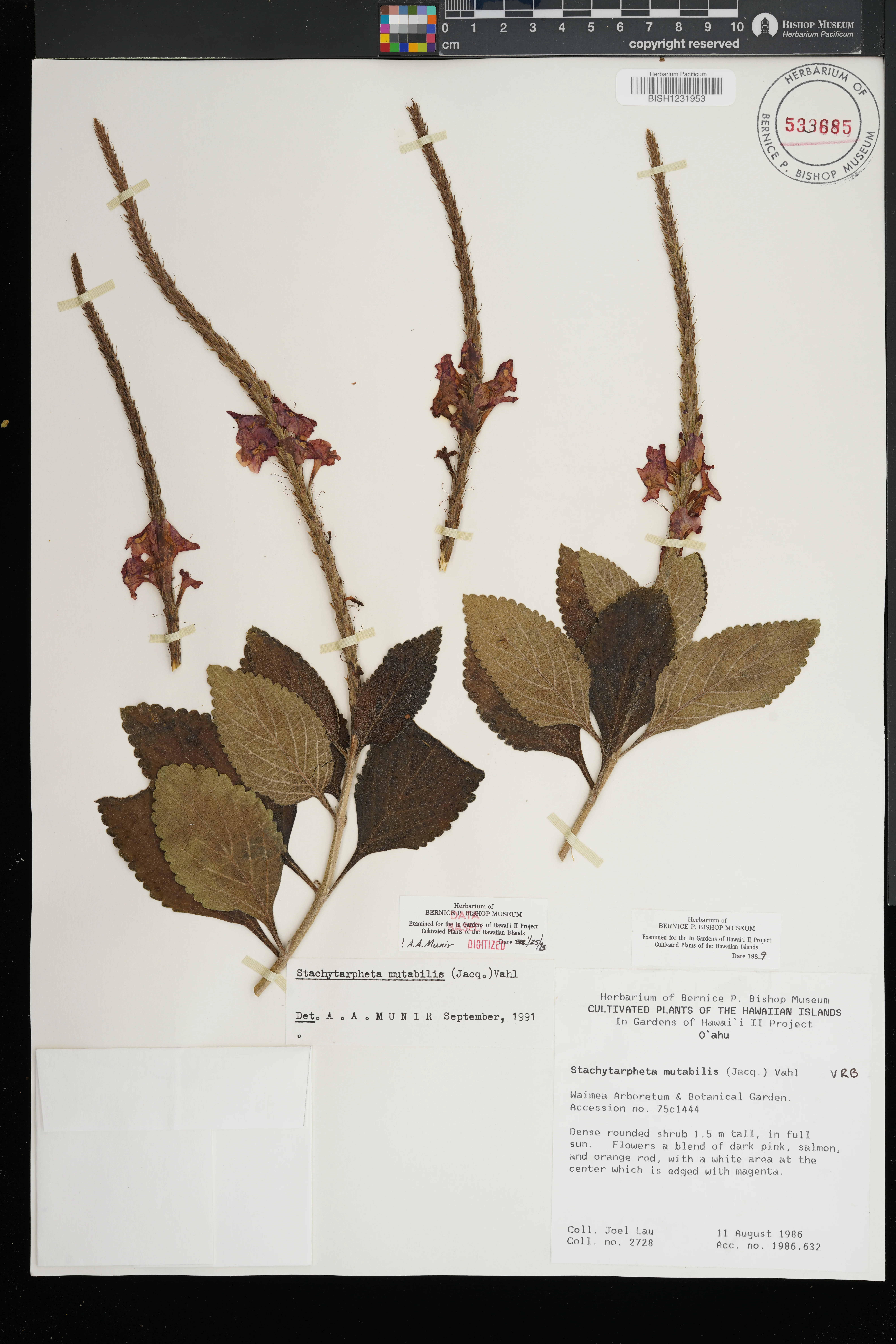 | 28 | Stachytarpheta mutabilis | (Jacq.) Vahl | Wahiawa Botanical Gardens | PRESERVED_SPECIMEN | Teraoka, W.; Whiteaker, L. | 311 | Maui | US | 7/3/1980 | |