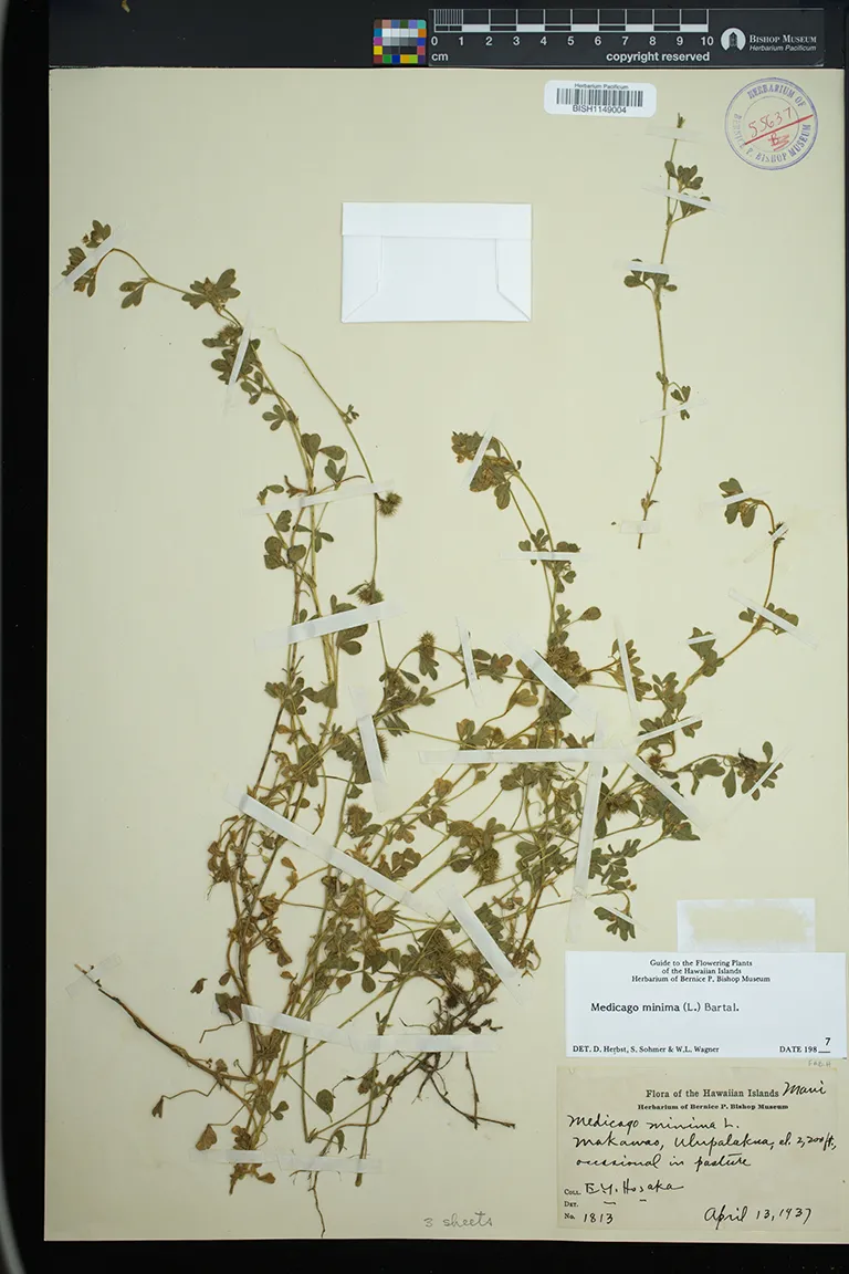 1 Medicago minima (L.) Bartal. N. Kohala, Keamoku dry pasture PRESERVED_SPECIMEN Hosaka, E.Y. 3583 Hawaii BISH 2/23/1948