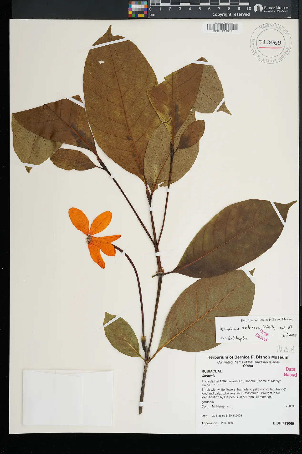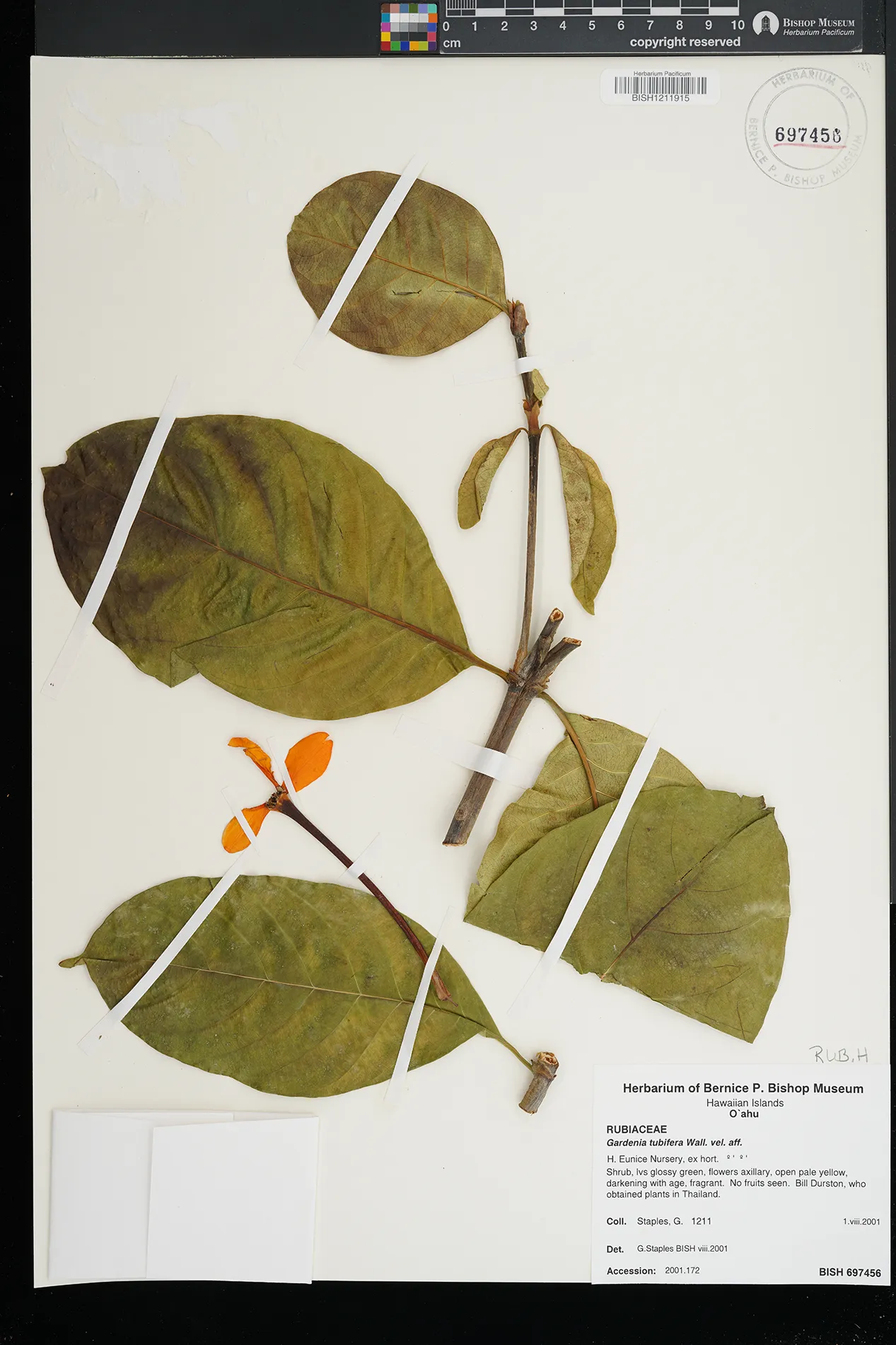 | 9 | Gardenia tubifera | Wall. ex Roxb. | h. eunice nursery, ex hort | PRESERVED_SPECIMEN | staples, g.w. | collector number: 1211 | Oahu | BISH | 8/1/2001 | |