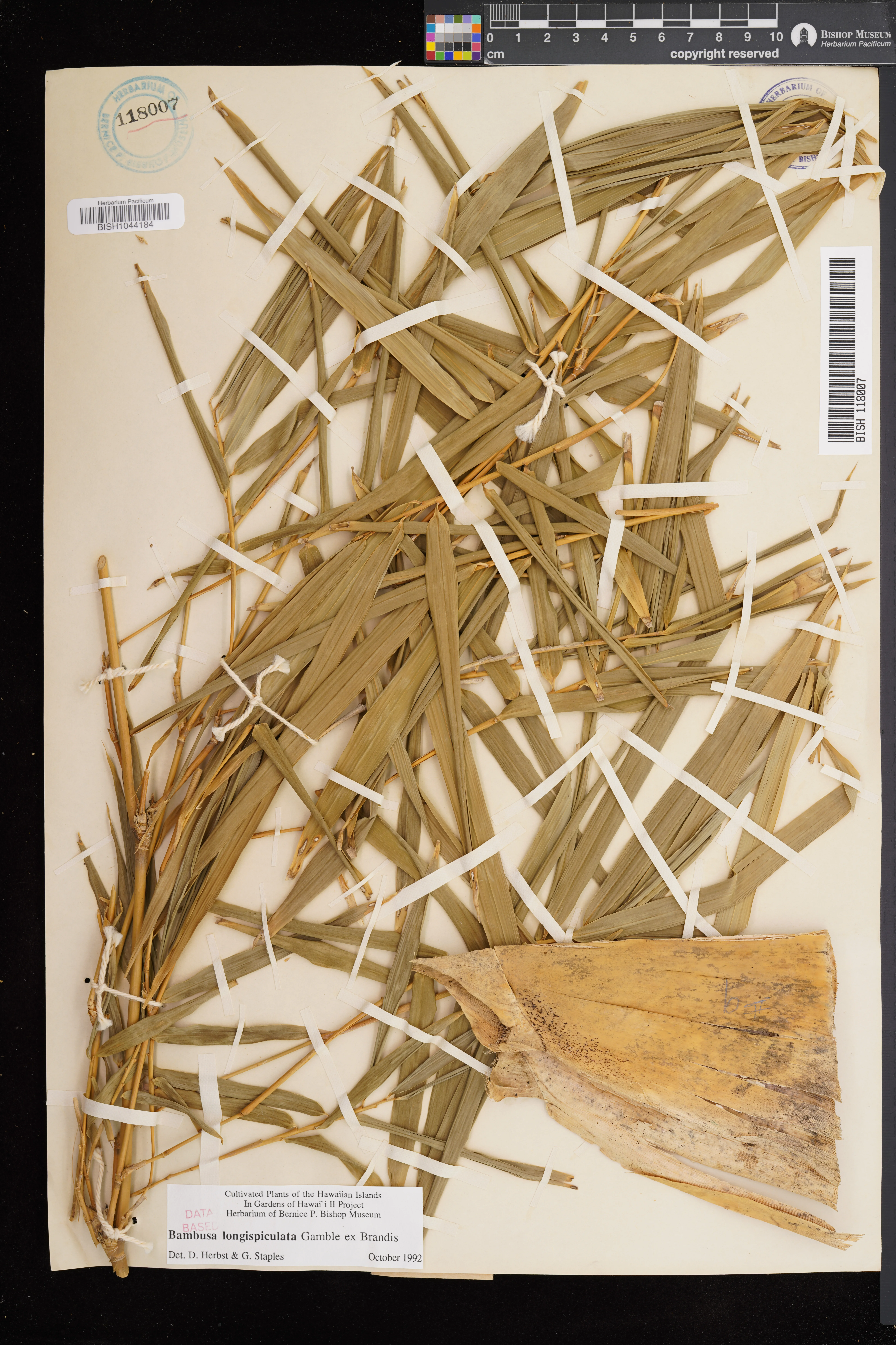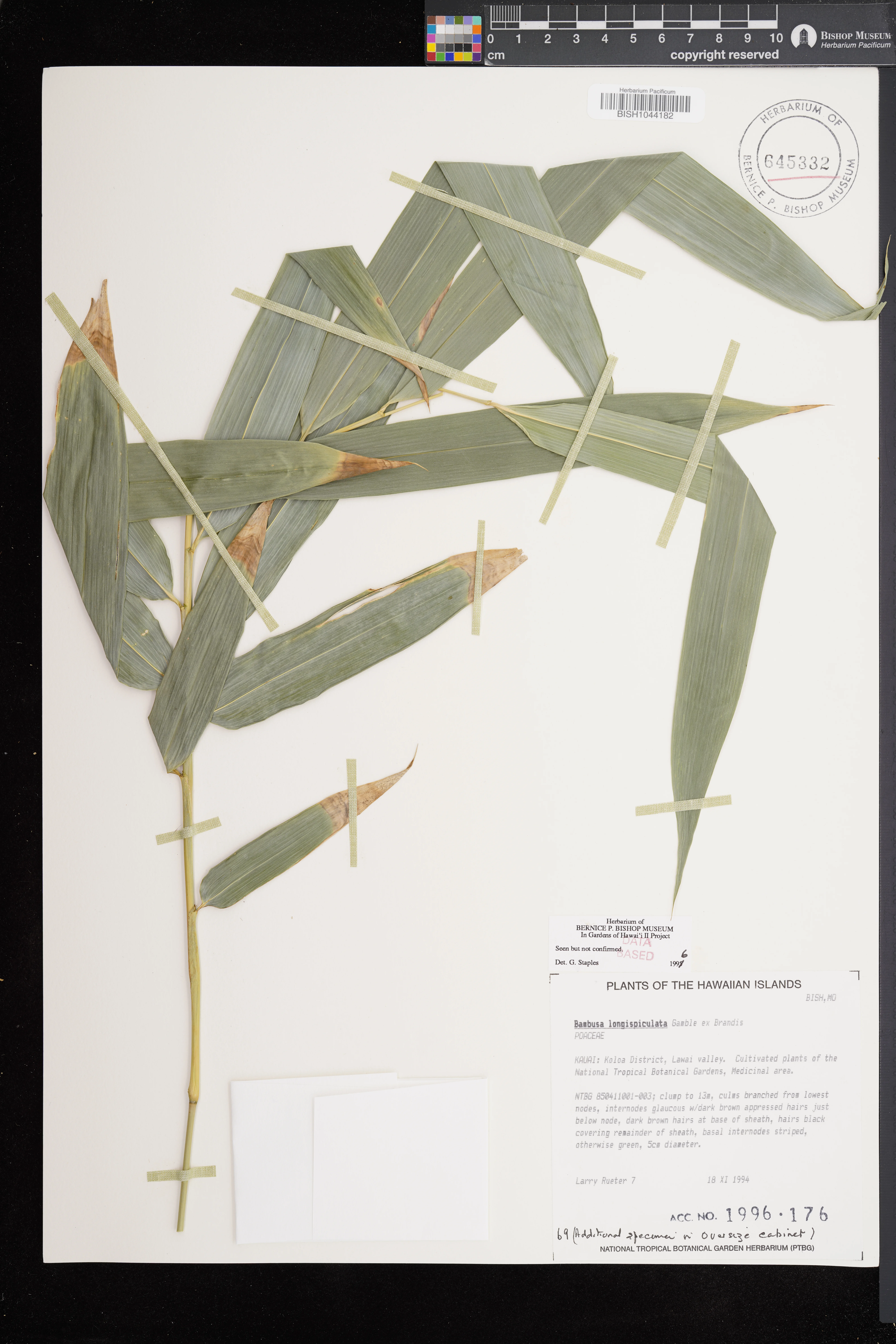 | 1 | Bambusa longispiculata | Gamble | Koloa Dist.; Lawai Valley, NTBG Medicinal area | PRESERVED_SPECIMEN | Rueter, L. | 7 | Kauai | BISH | 9/18/1994 | |