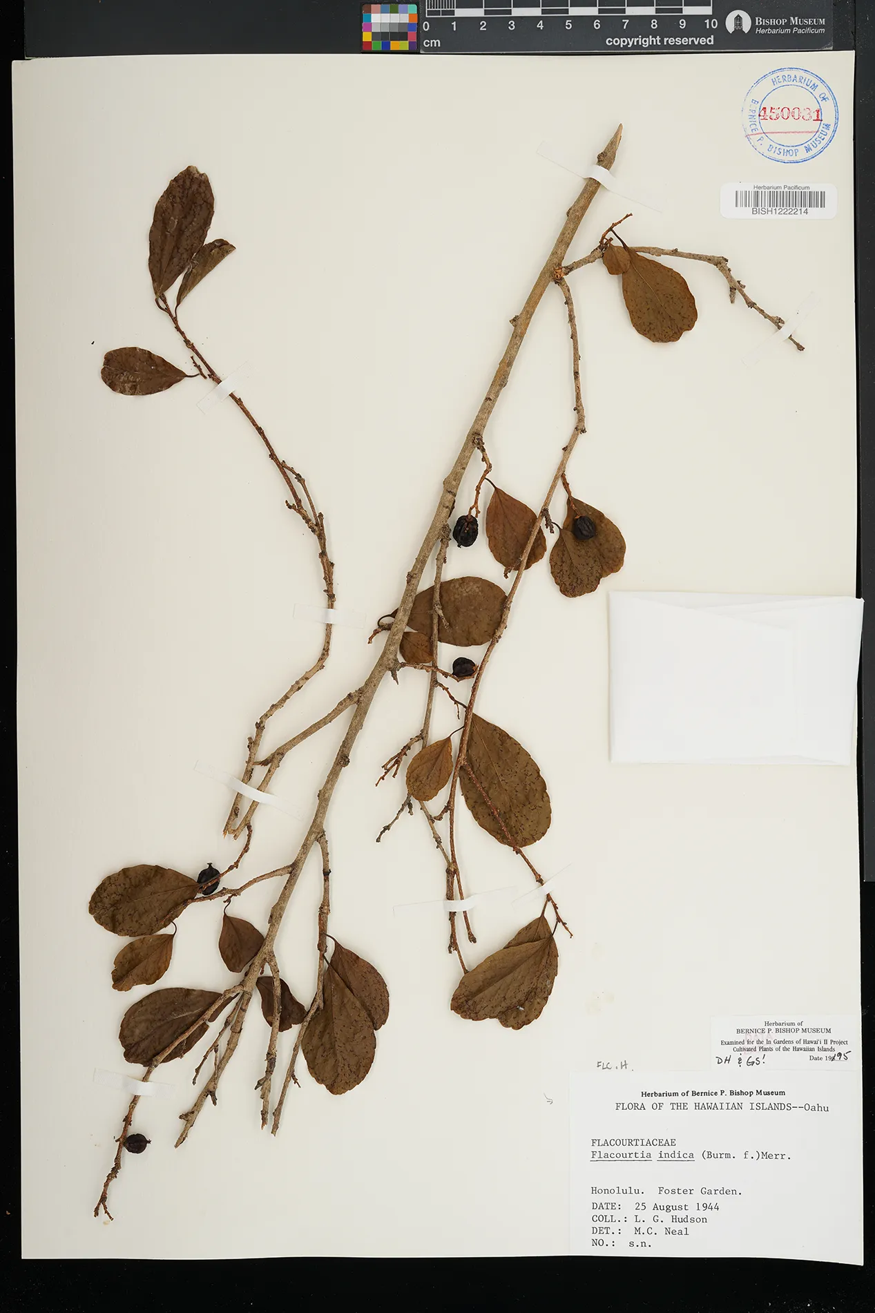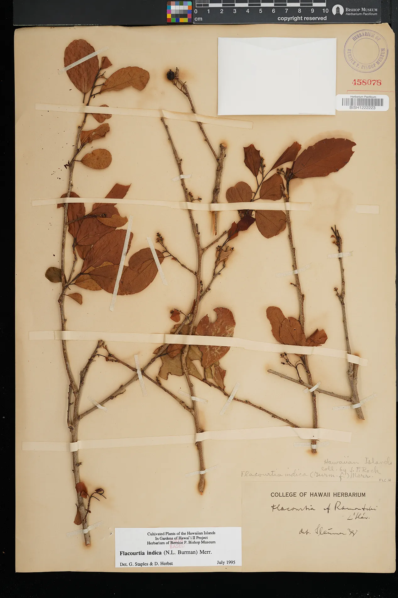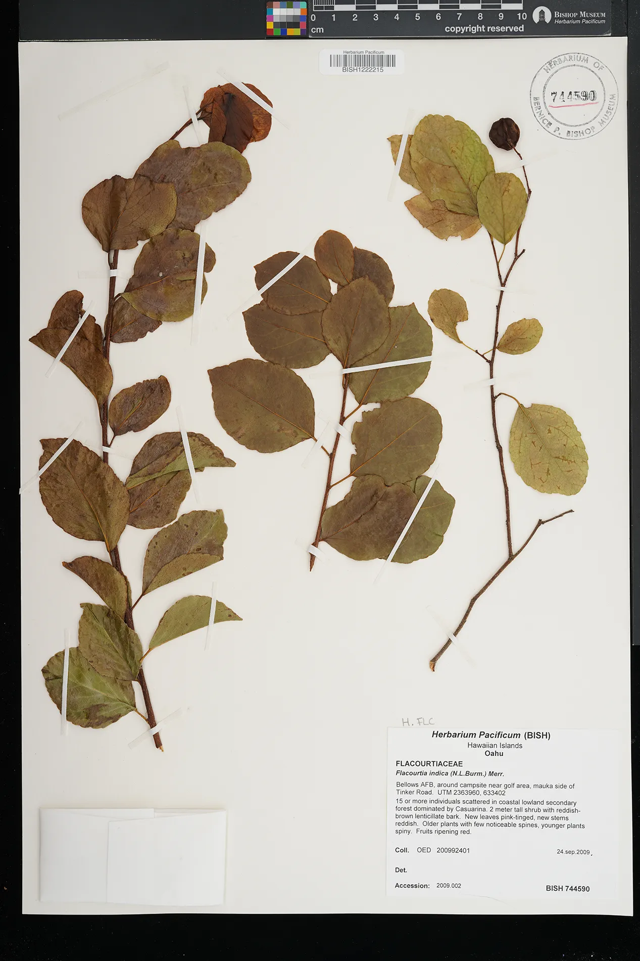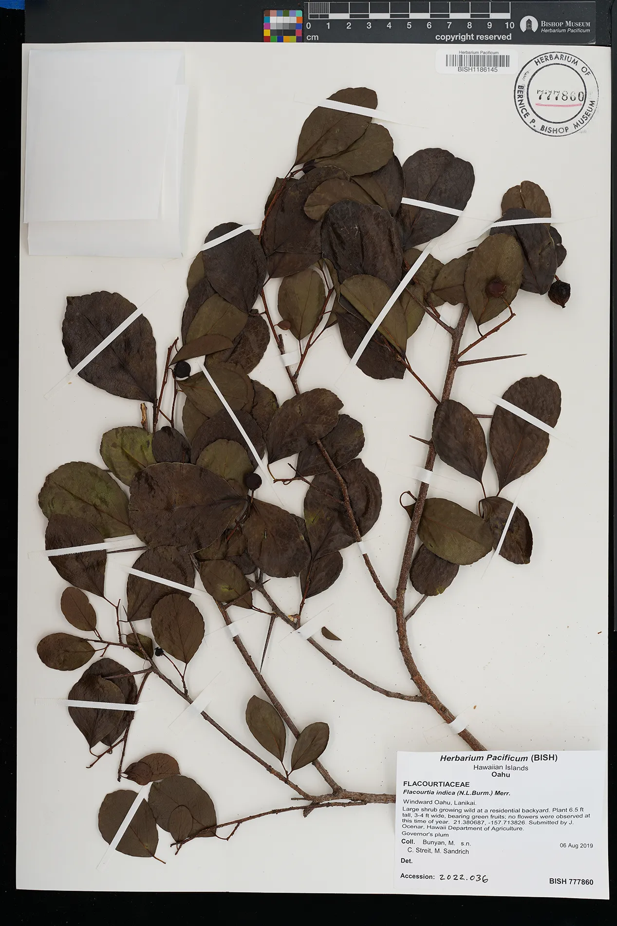 | 4 | Flacourtia indica | (Burm.f.) Merr. | Honolulu, Foster Garden | PRESERVED_SPECIMEN | Hudson, L.G. | s.n. | Oahu | BISH | 8/25/1944 | |