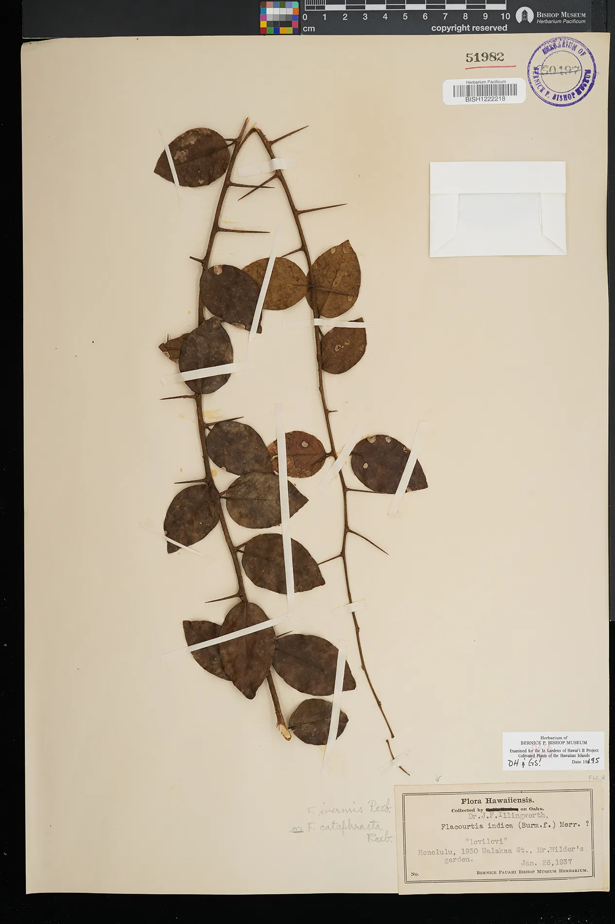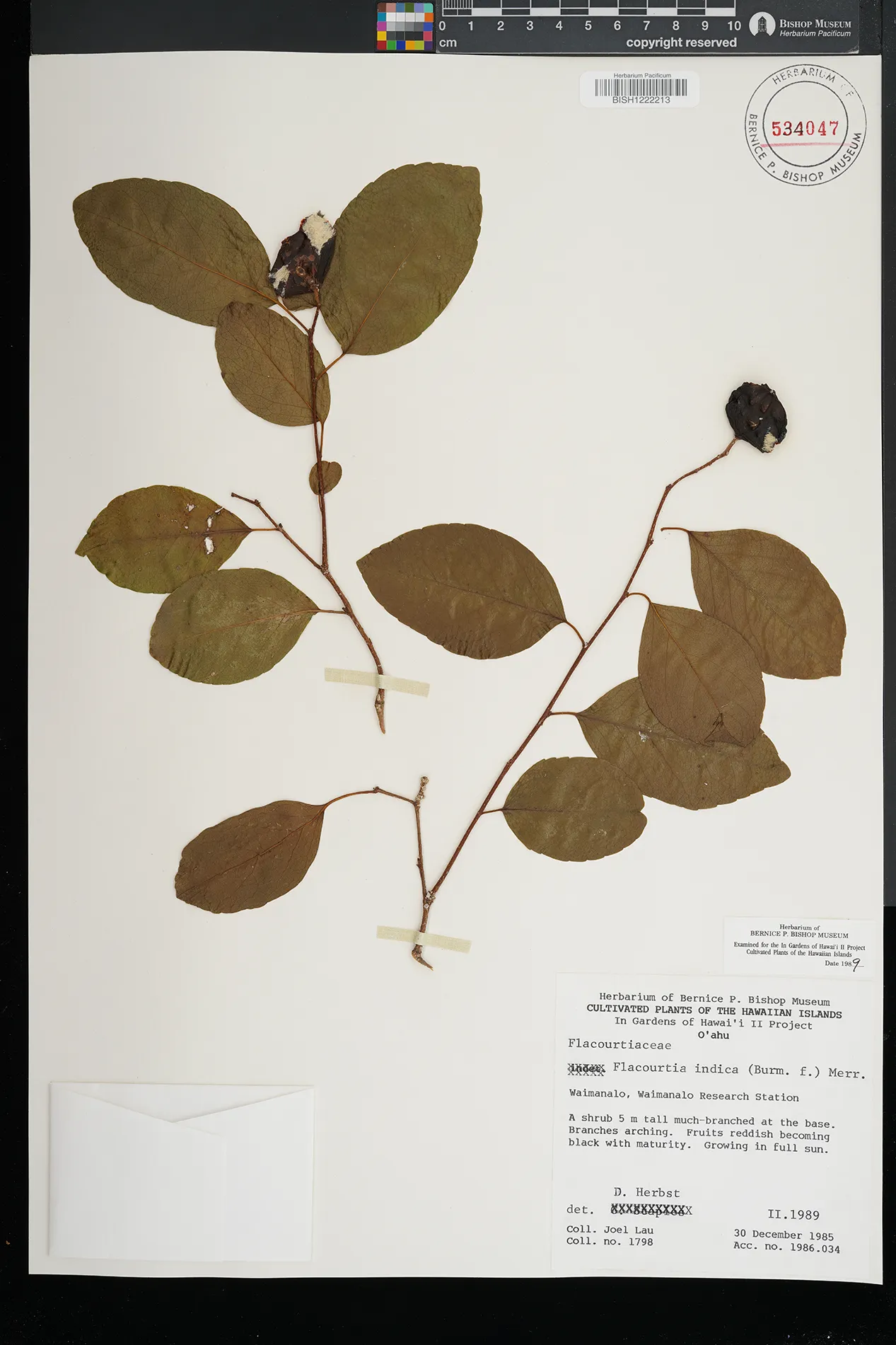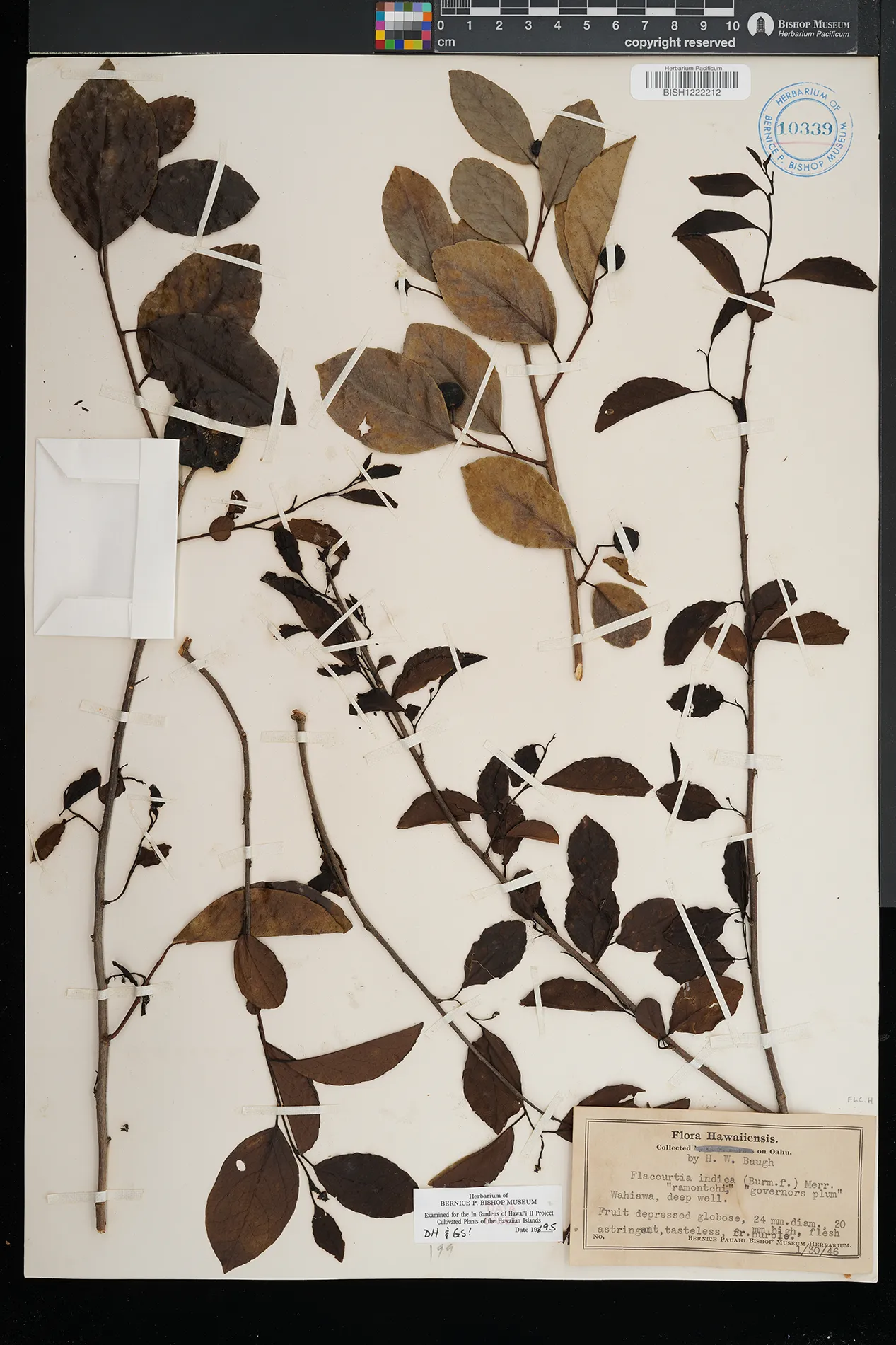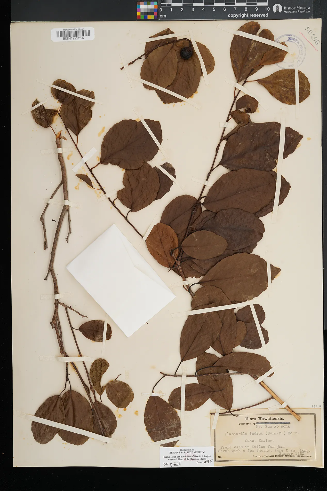 | 4 | Flacourtia indica | (Burm.f.) Merr. | Honolulu, Foster Garden | PRESERVED_SPECIMEN | Hudson, L.G. | s.n. | Oahu | BISH | 8/25/1944 | |