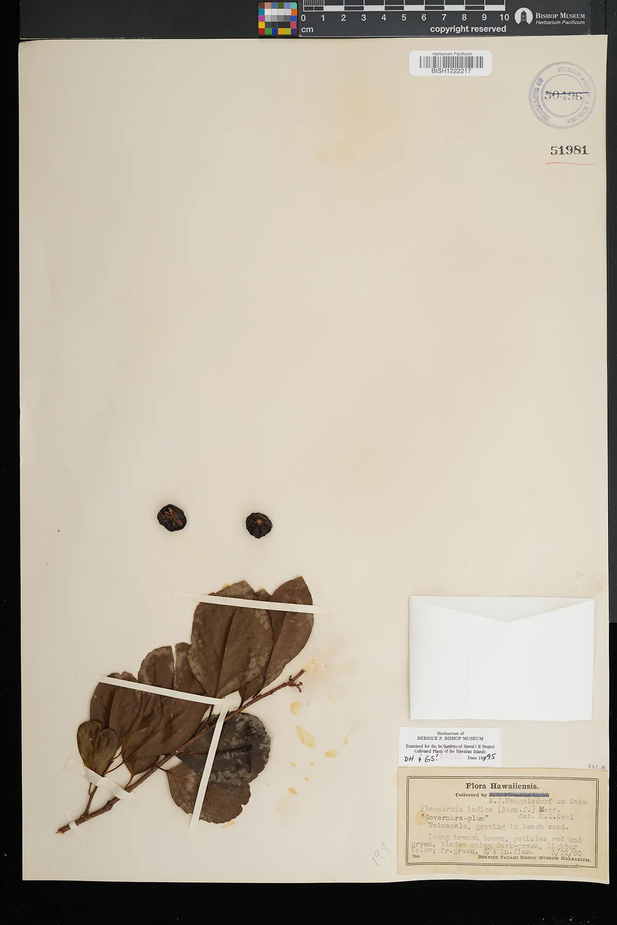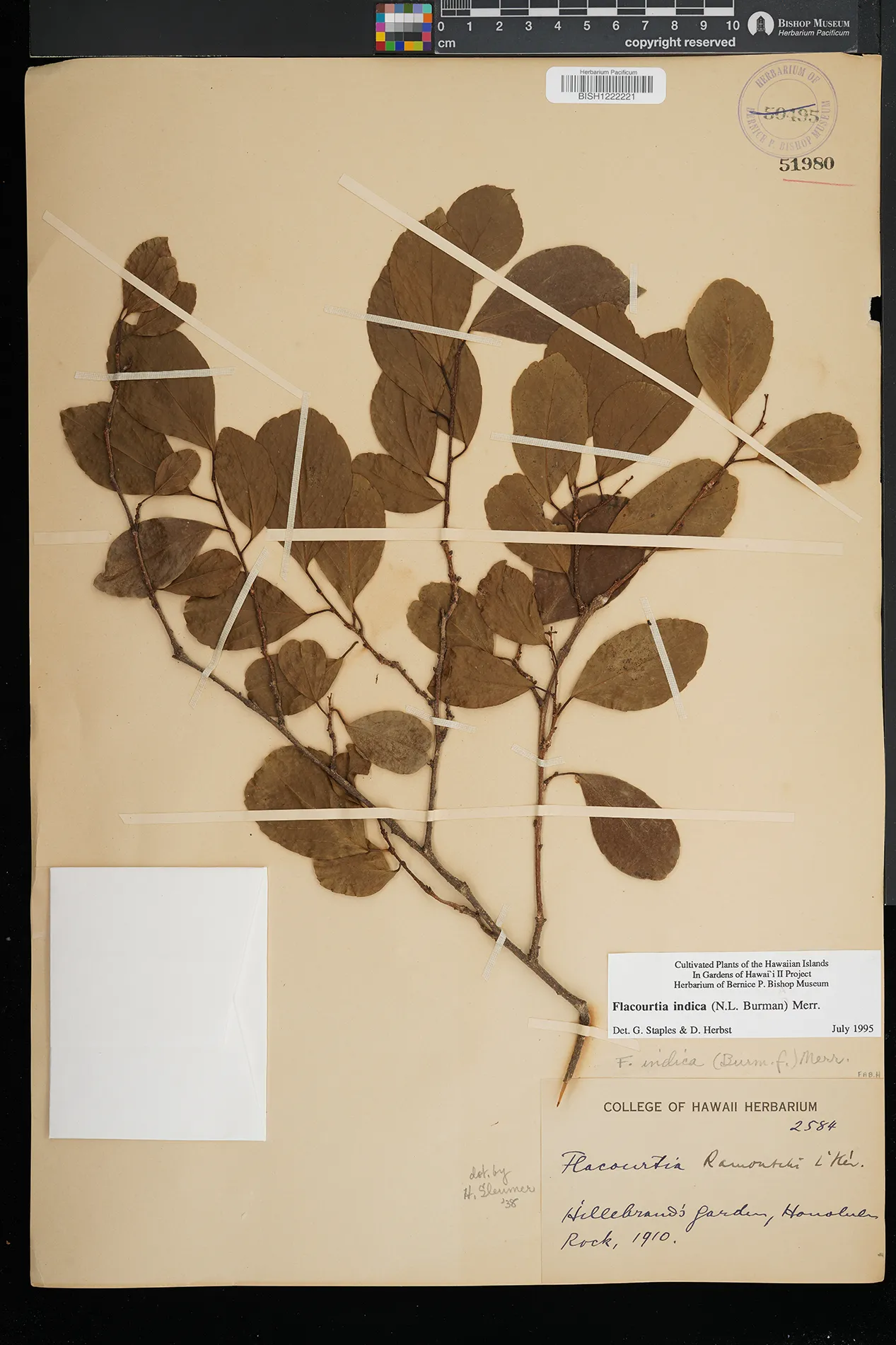 | 11 | Flacourtia indica | (Burm.f.) Merr. | Honolulu, Hillebrand's garden | PRESERVED_SPECIMEN | Rock, J.F.C. | 2584 | Oahu | BISH | 3/24/1905 | |