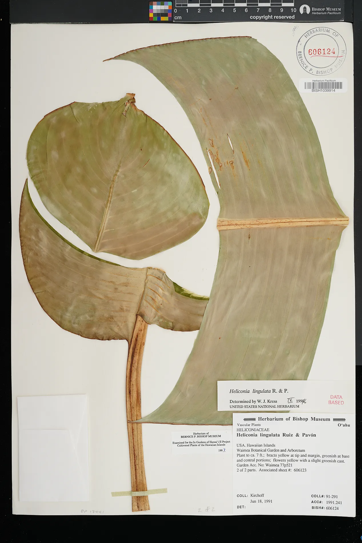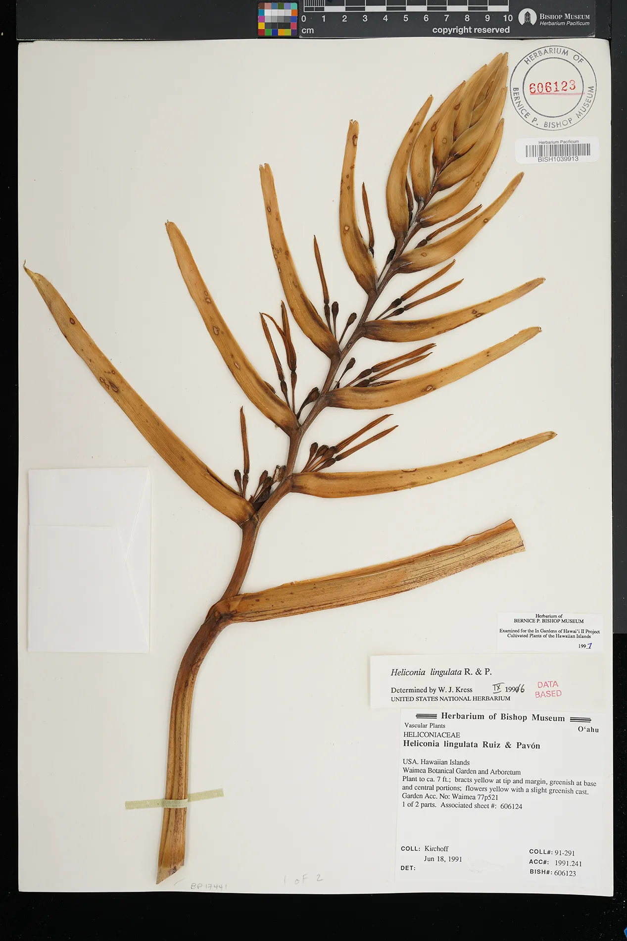 | 9 | Heliconia lingulata | Ruiz & Pav. | Waimea Botanical Garden and Arboretum | PRESERVED_SPECIMEN | Kirchoff, B.K. | 91-291 | Oahu | BISH | 6/18/1991 | |