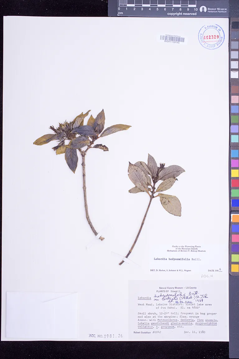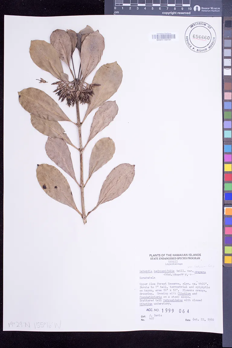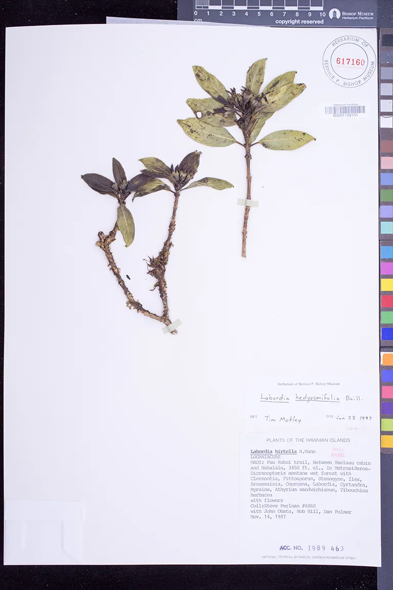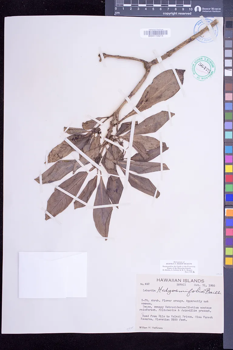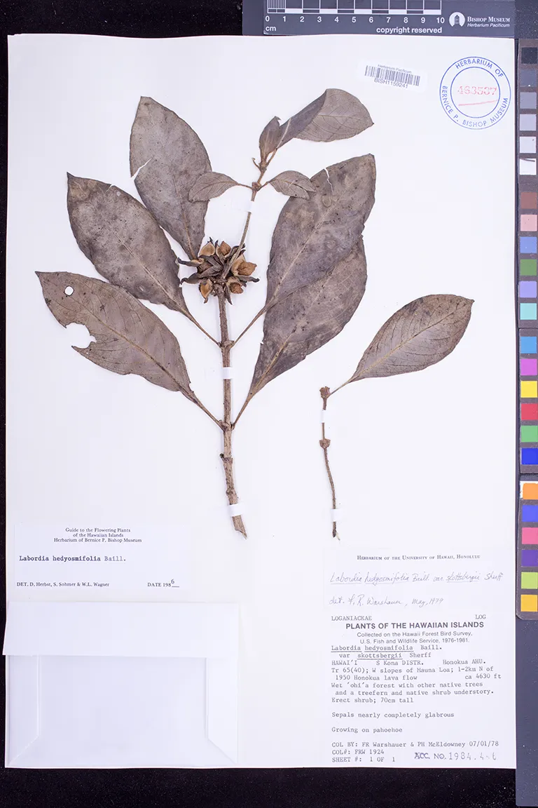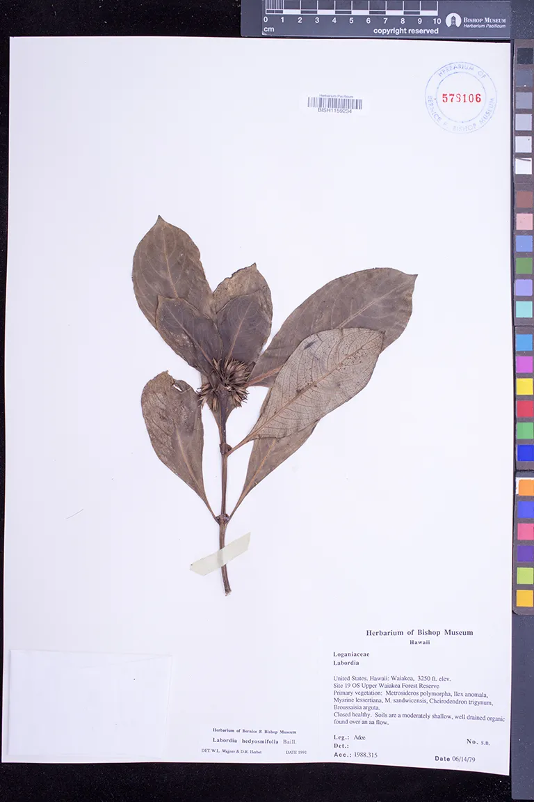 Montane Wet Shrubland at 4100 ft near the summit of Lihau with Metrosideros, Clermontia arborescens, Coprosma, Vaccinium calycinum, Broussaisia, Dubautia spp. Hedyotis, native herbs, sedges and ferns |