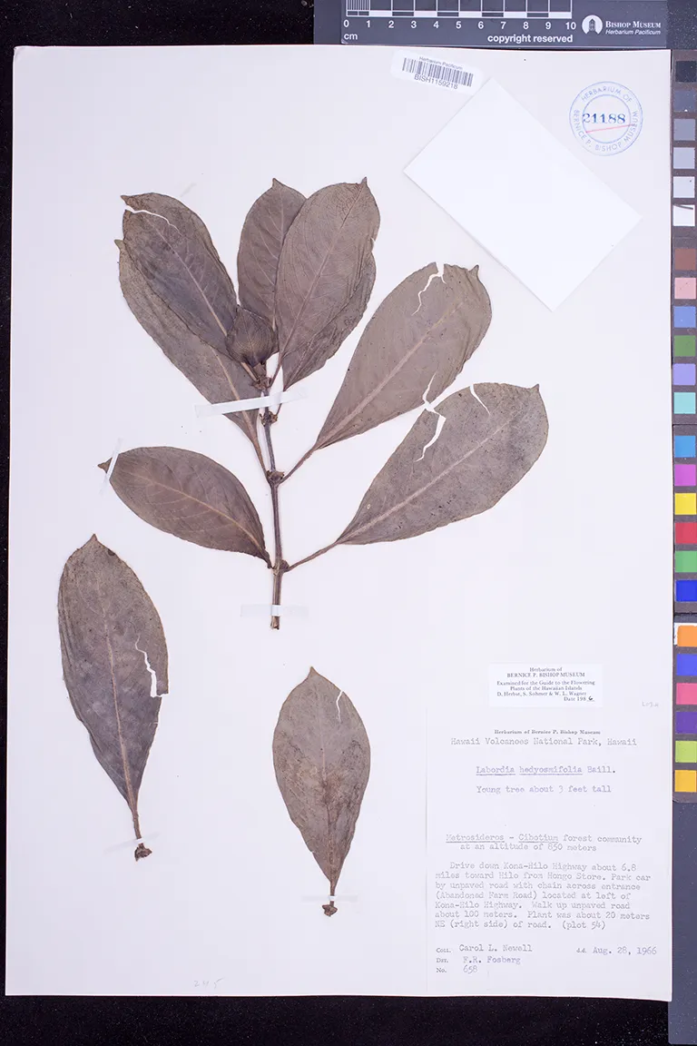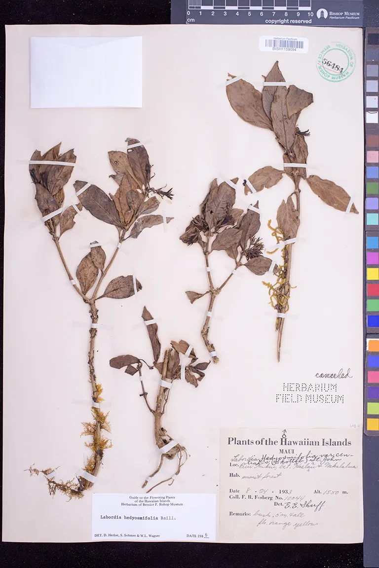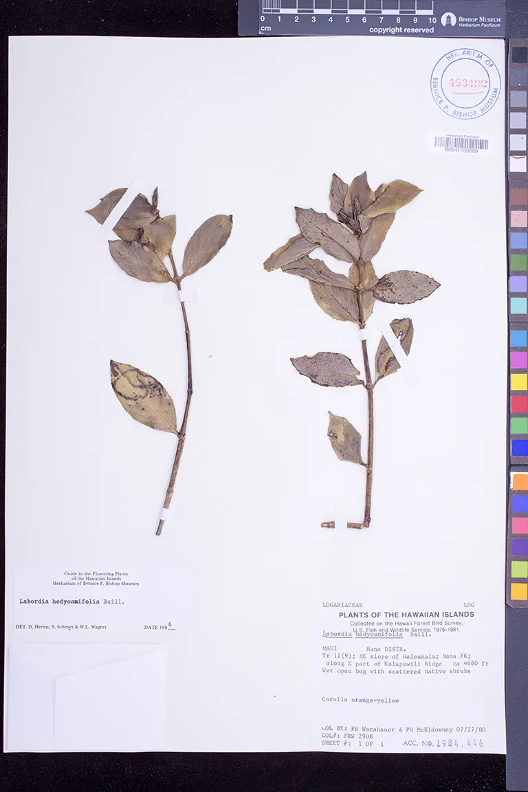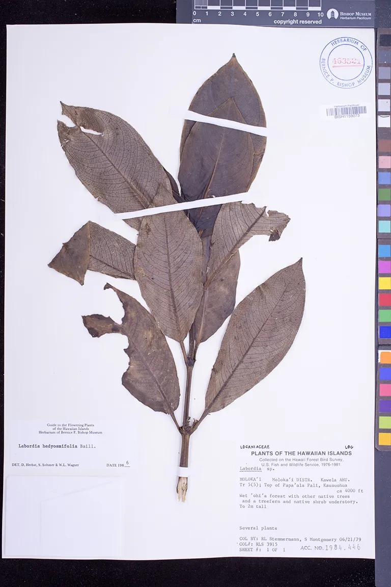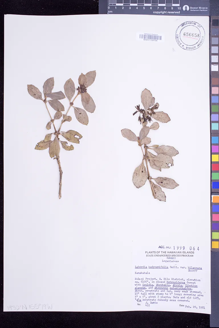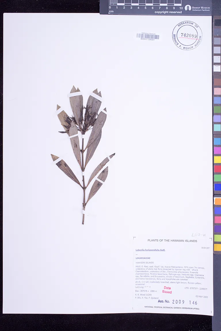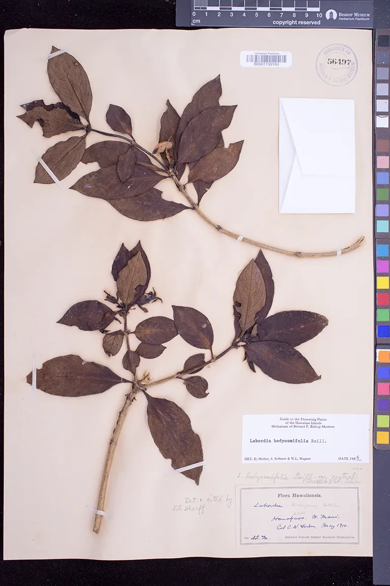 Montane Wet Shrubland at 4100 ft near the summit of Lihau with Metrosideros, Clermontia arborescens, Coprosma, Vaccinium calycinum, Broussaisia, Dubautia spp. Hedyotis, native herbs, sedges and ferns |