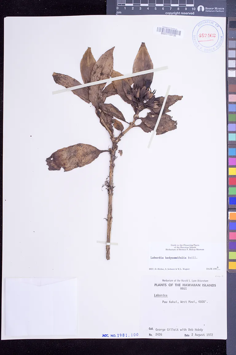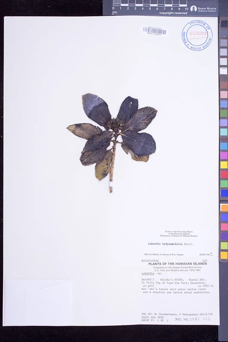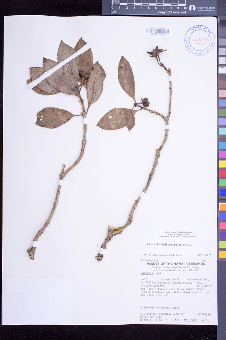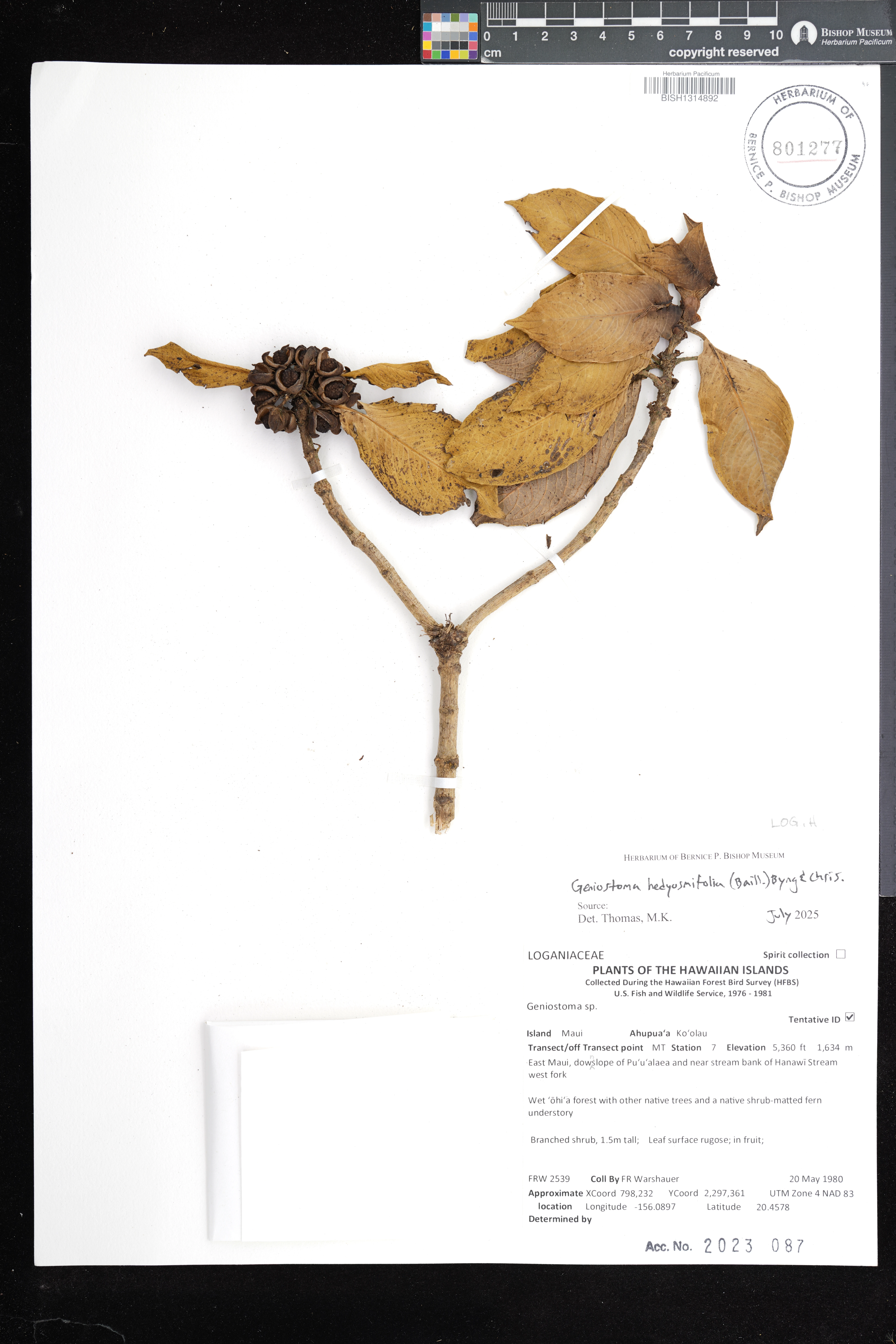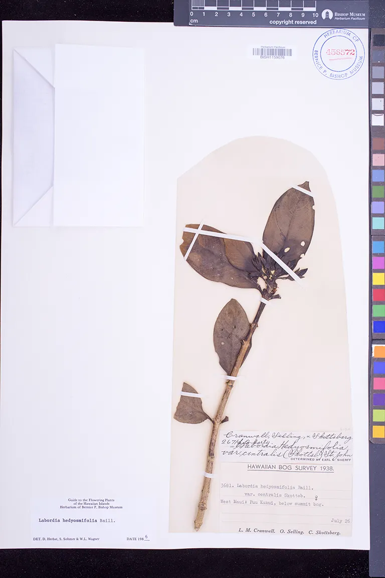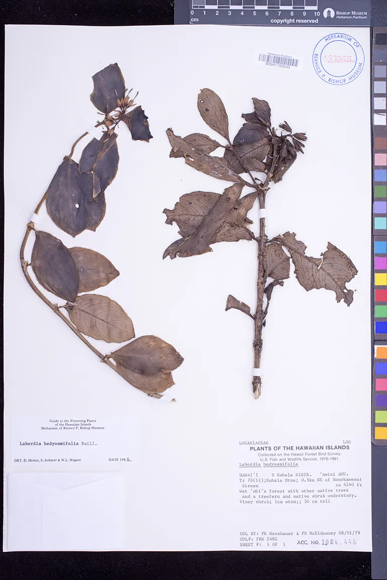 Montane Wet Shrubland at 4100 ft near the summit of Lihau with Metrosideros, Clermontia arborescens, Coprosma, Vaccinium calycinum, Broussaisia, Dubautia spp. Hedyotis, native herbs, sedges and ferns |