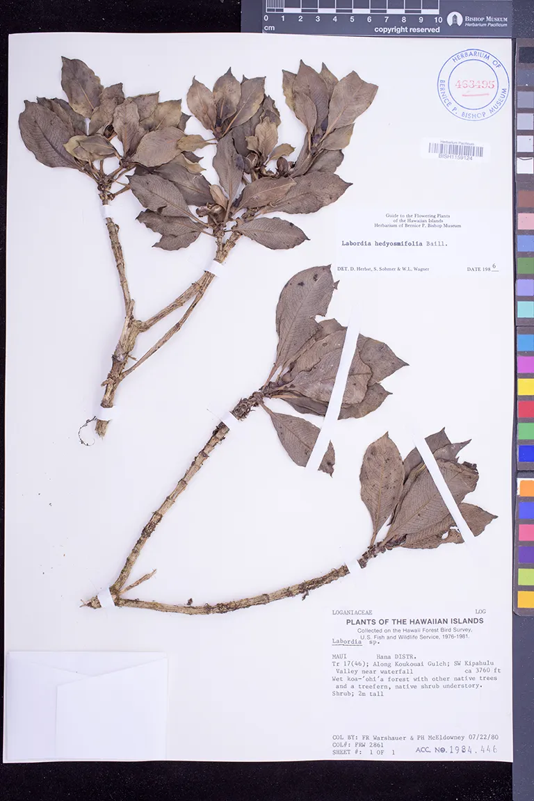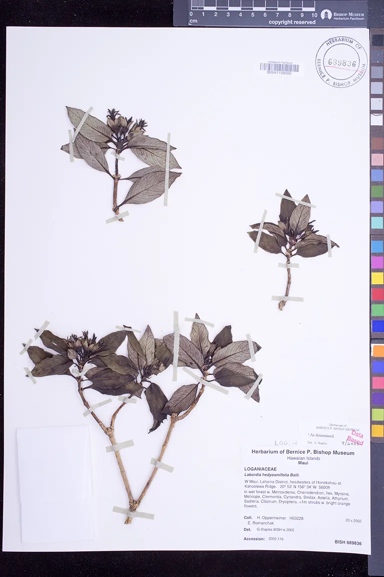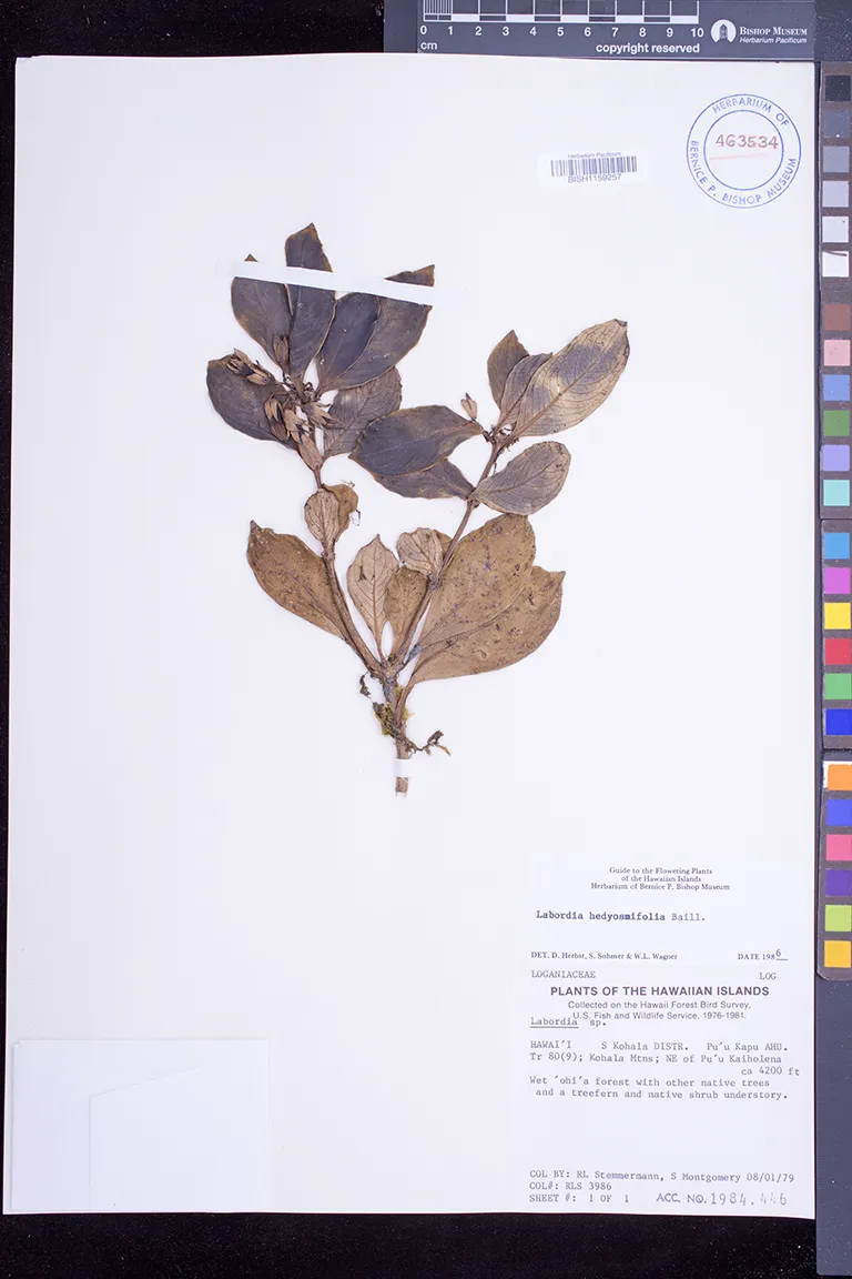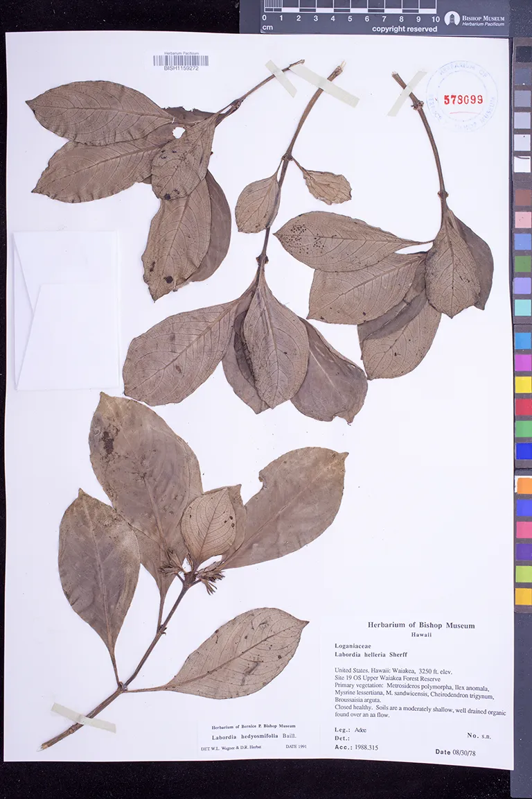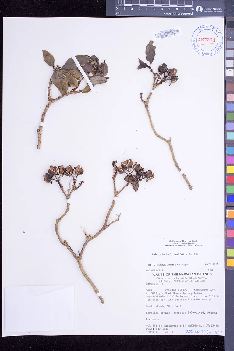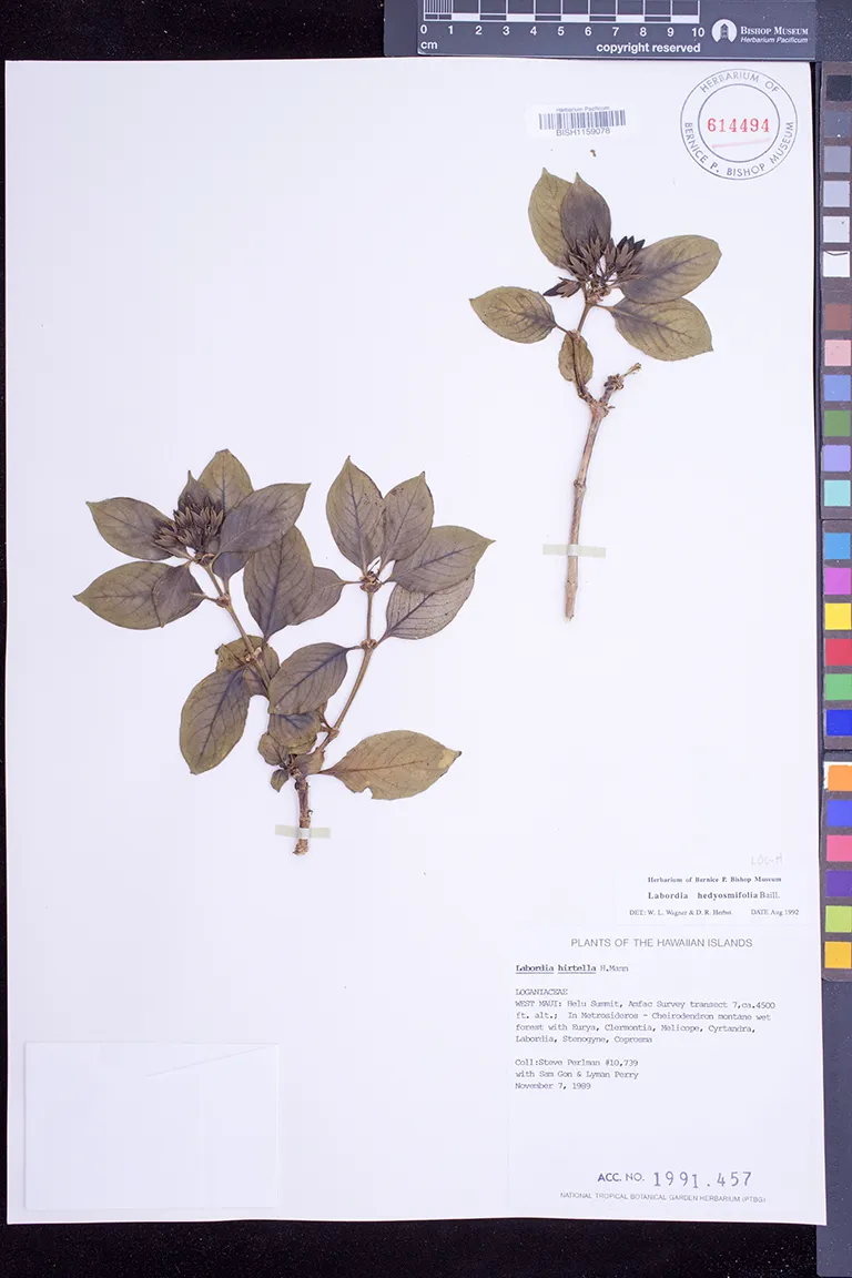 Montane Wet Shrubland at 4100 ft near the summit of Lihau with Metrosideros, Clermontia arborescens, Coprosma, Vaccinium calycinum, Broussaisia, Dubautia spp. Hedyotis, native herbs, sedges and ferns |