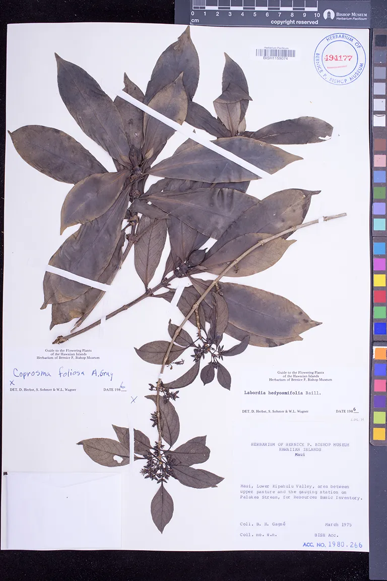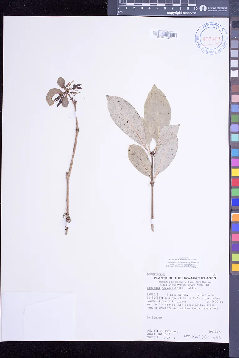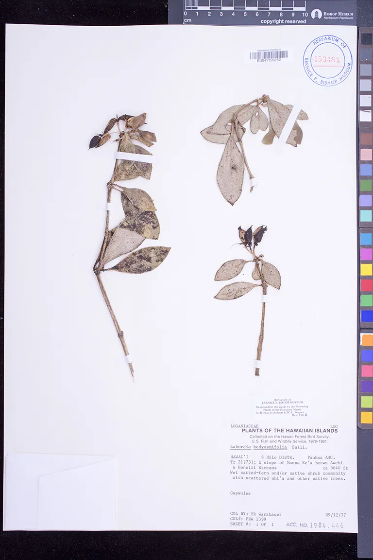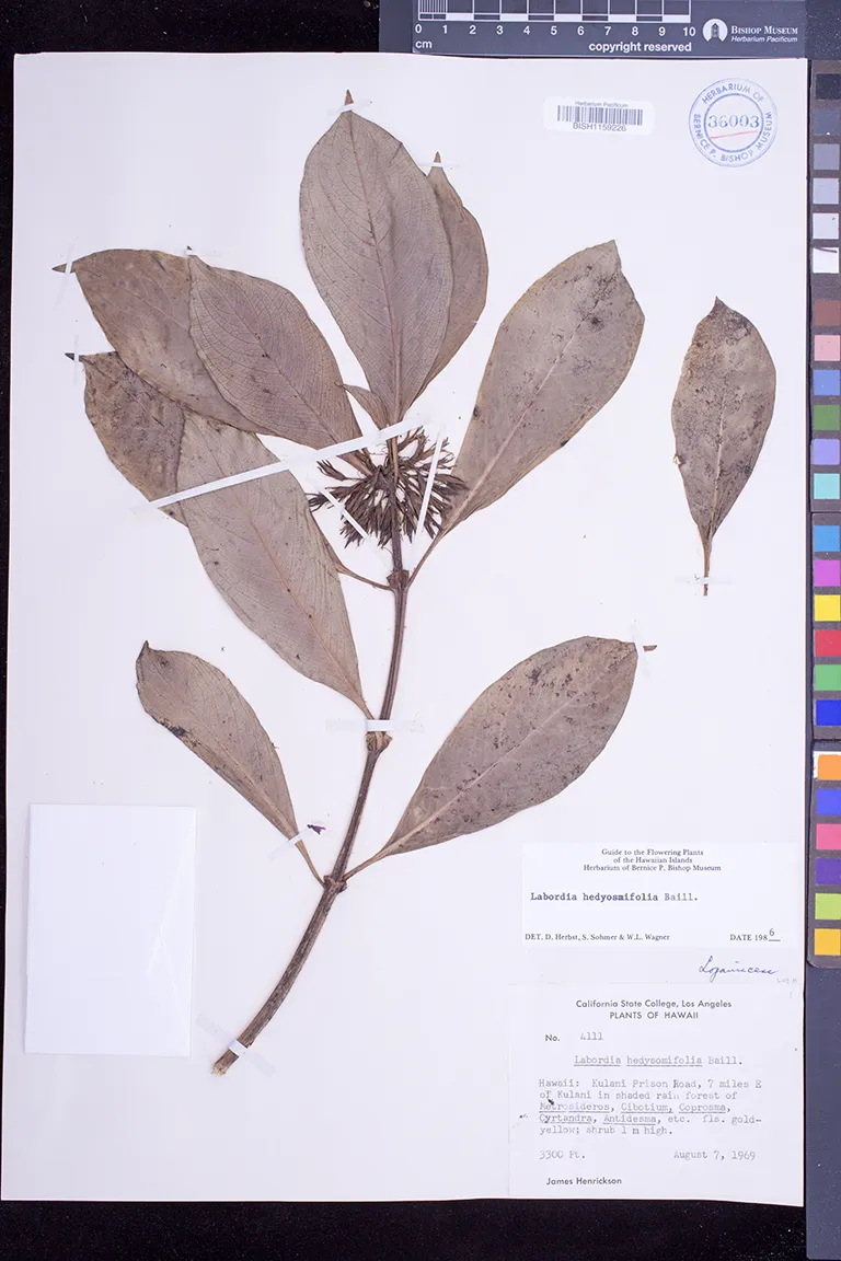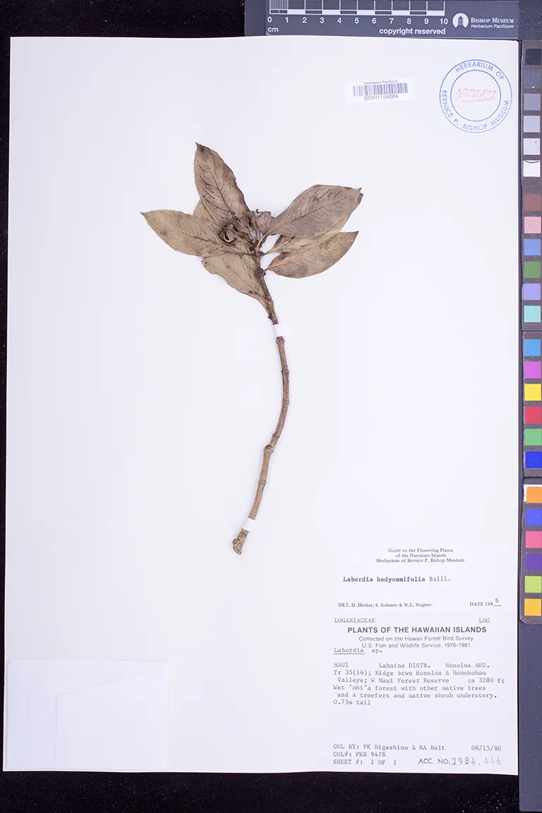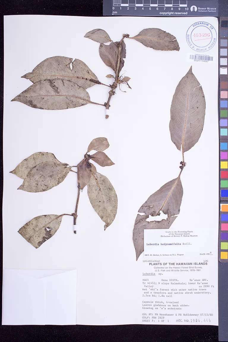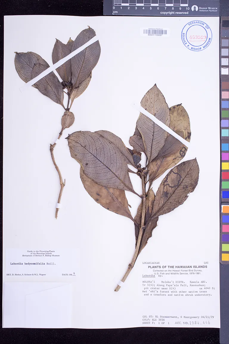 Montane Wet Shrubland at 4100 ft near the summit of Lihau with Metrosideros, Clermontia arborescens, Coprosma, Vaccinium calycinum, Broussaisia, Dubautia spp. Hedyotis, native herbs, sedges and ferns |