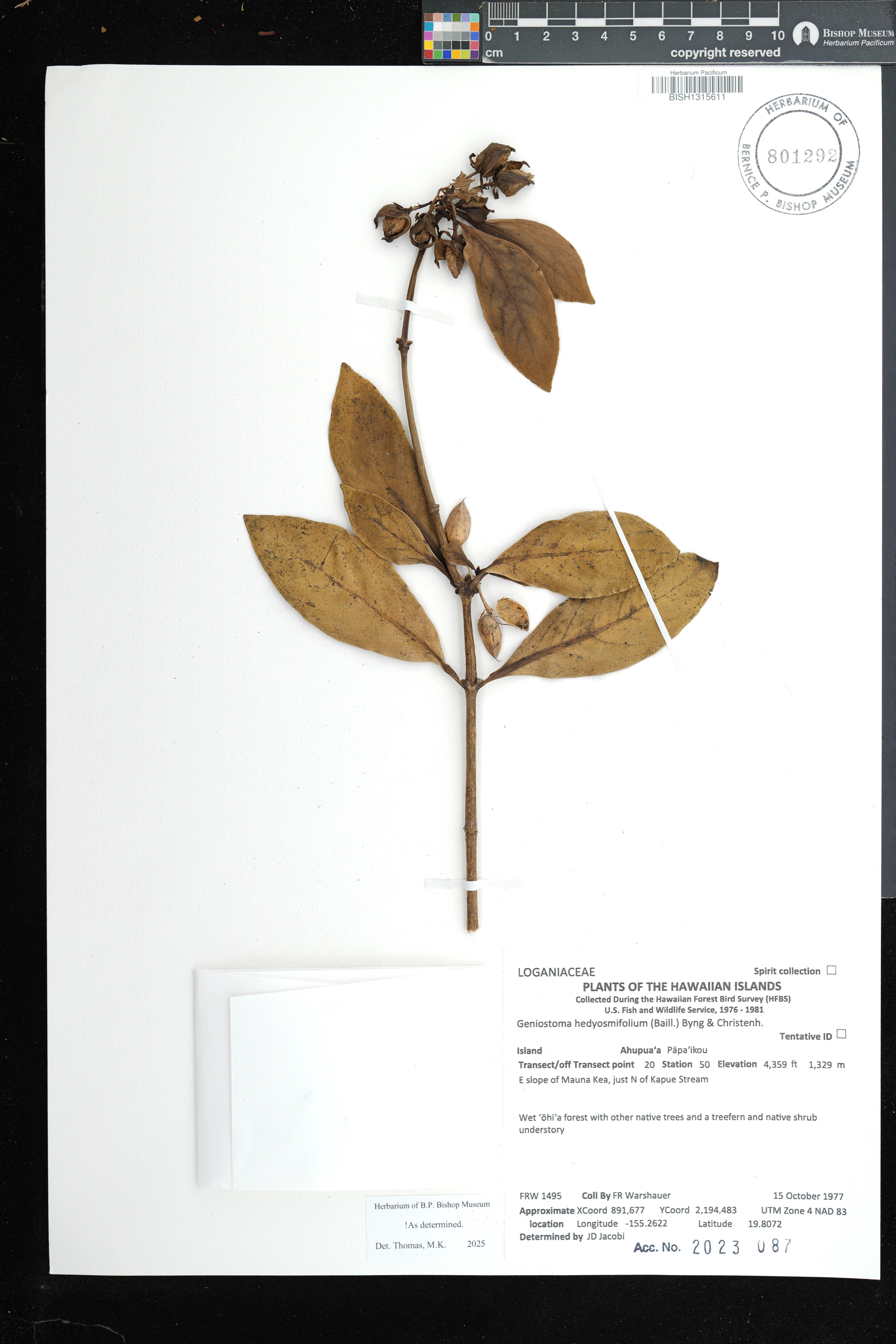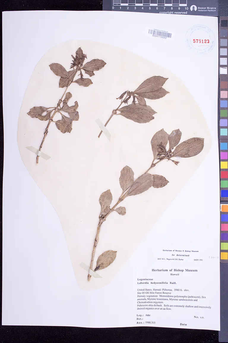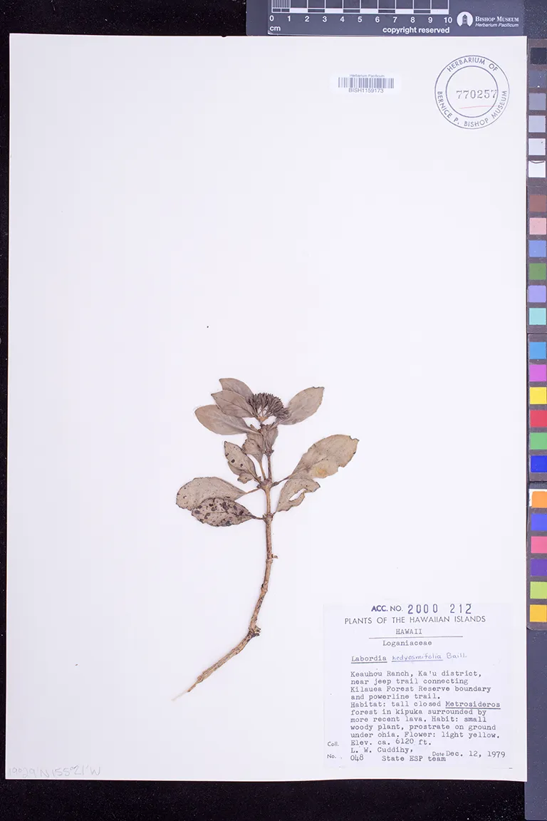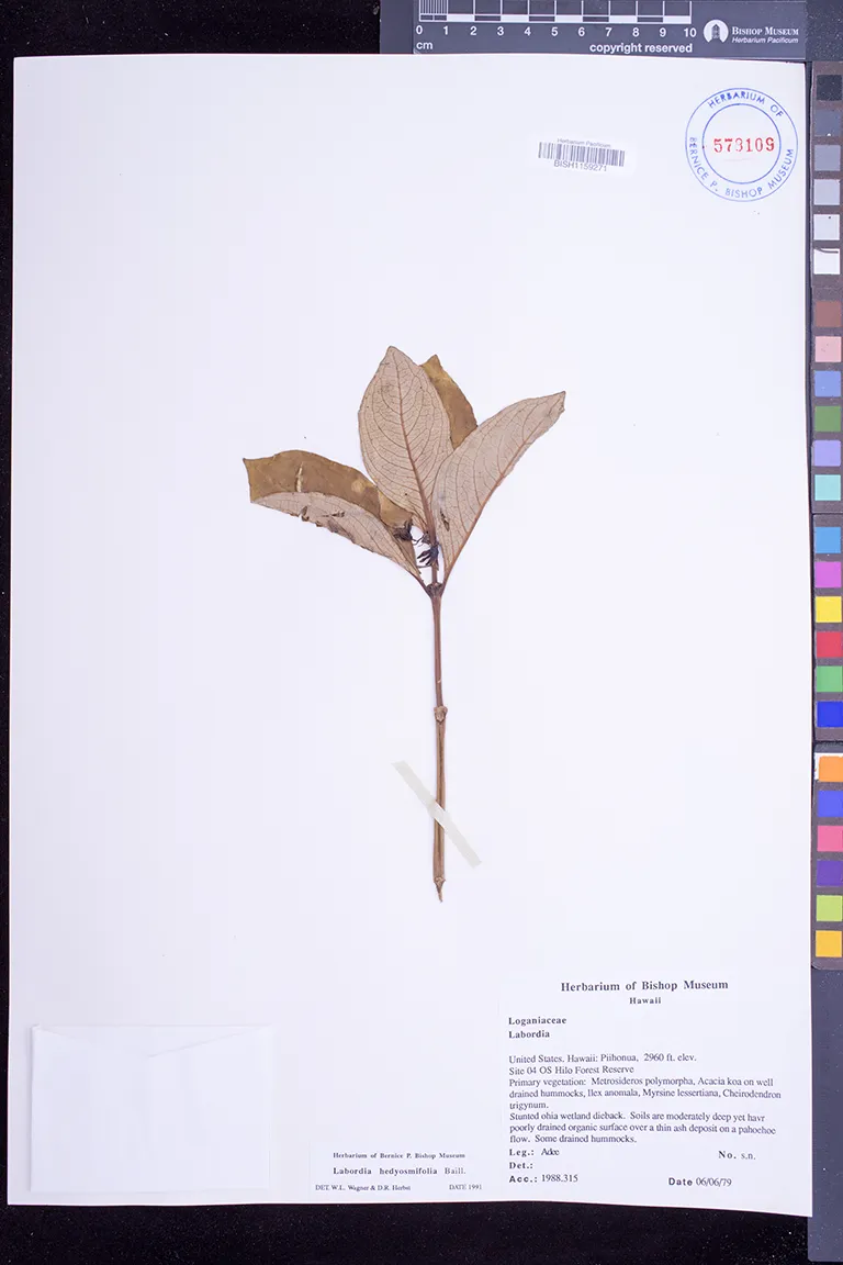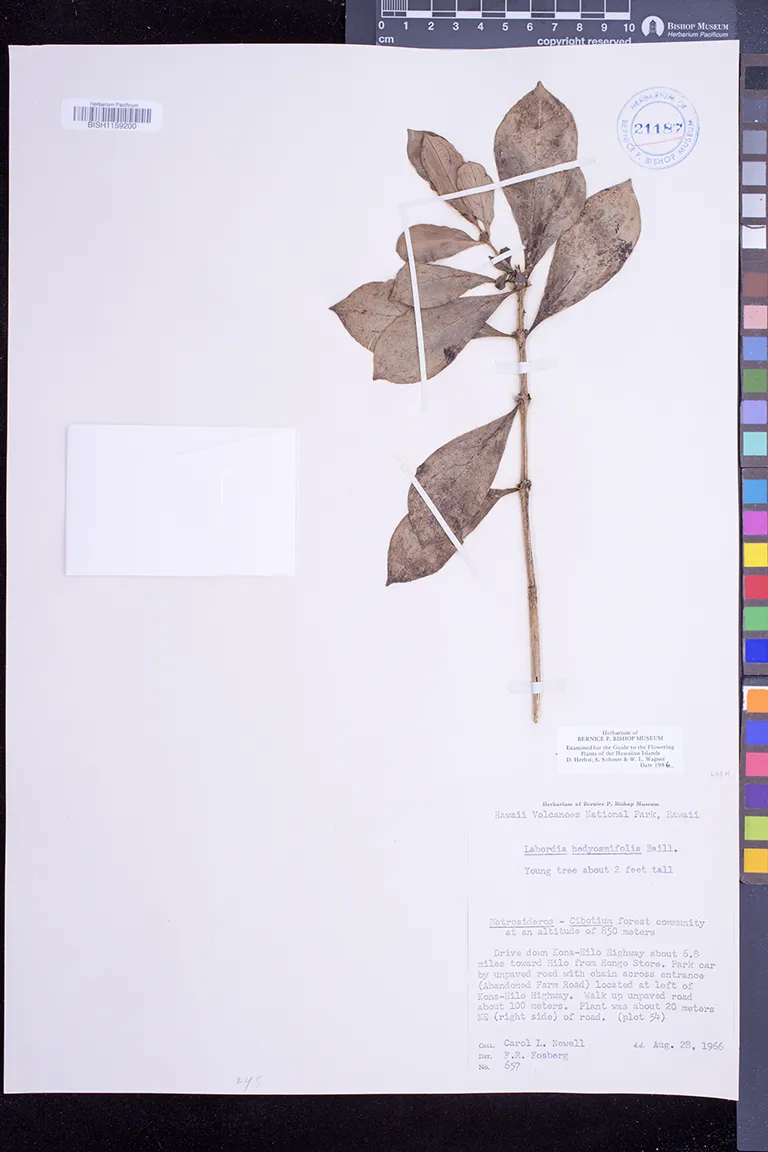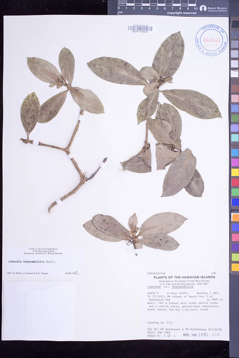 Dry naio scrub forest with other native trees and native shrub-exotic grass understory. Growing on pahoehoe substrate |