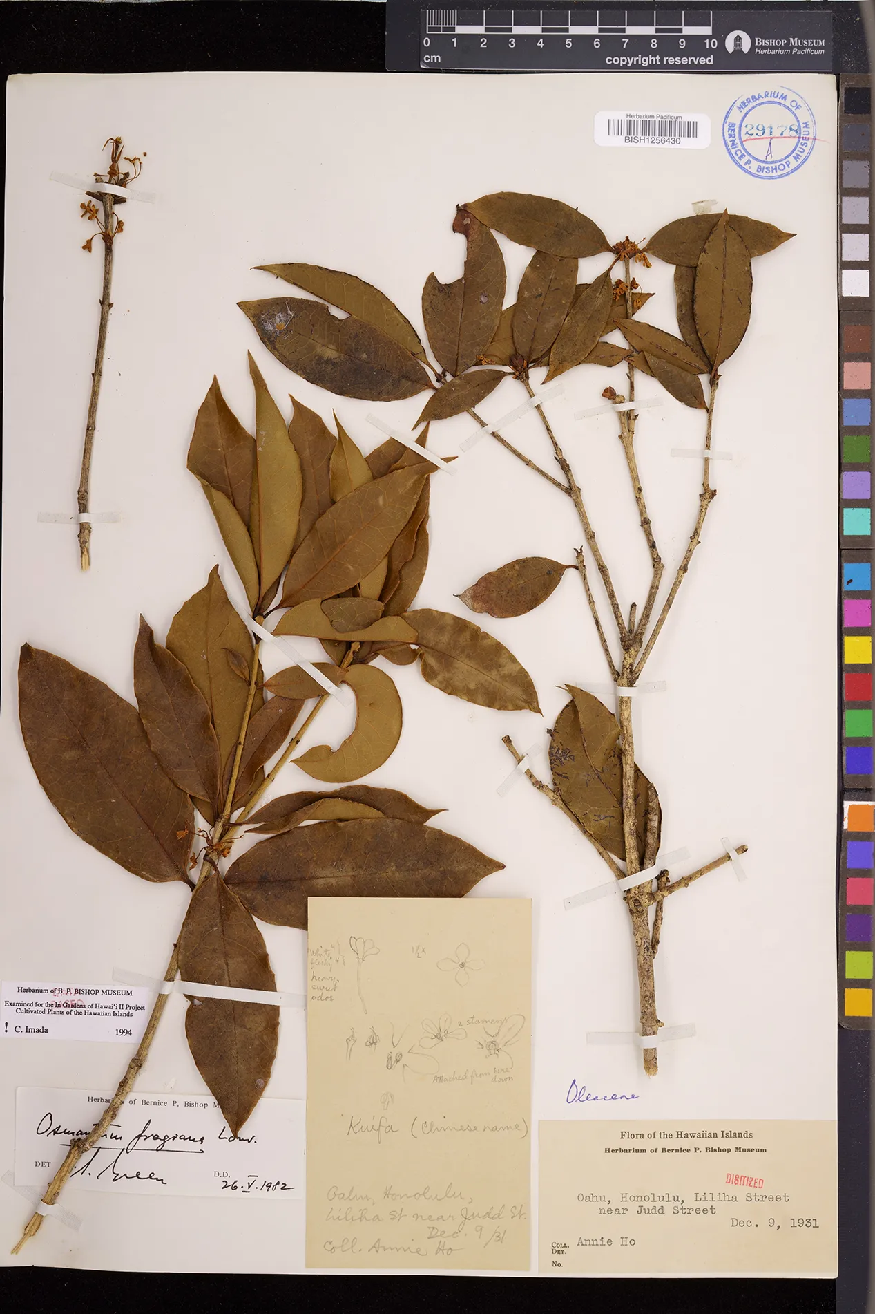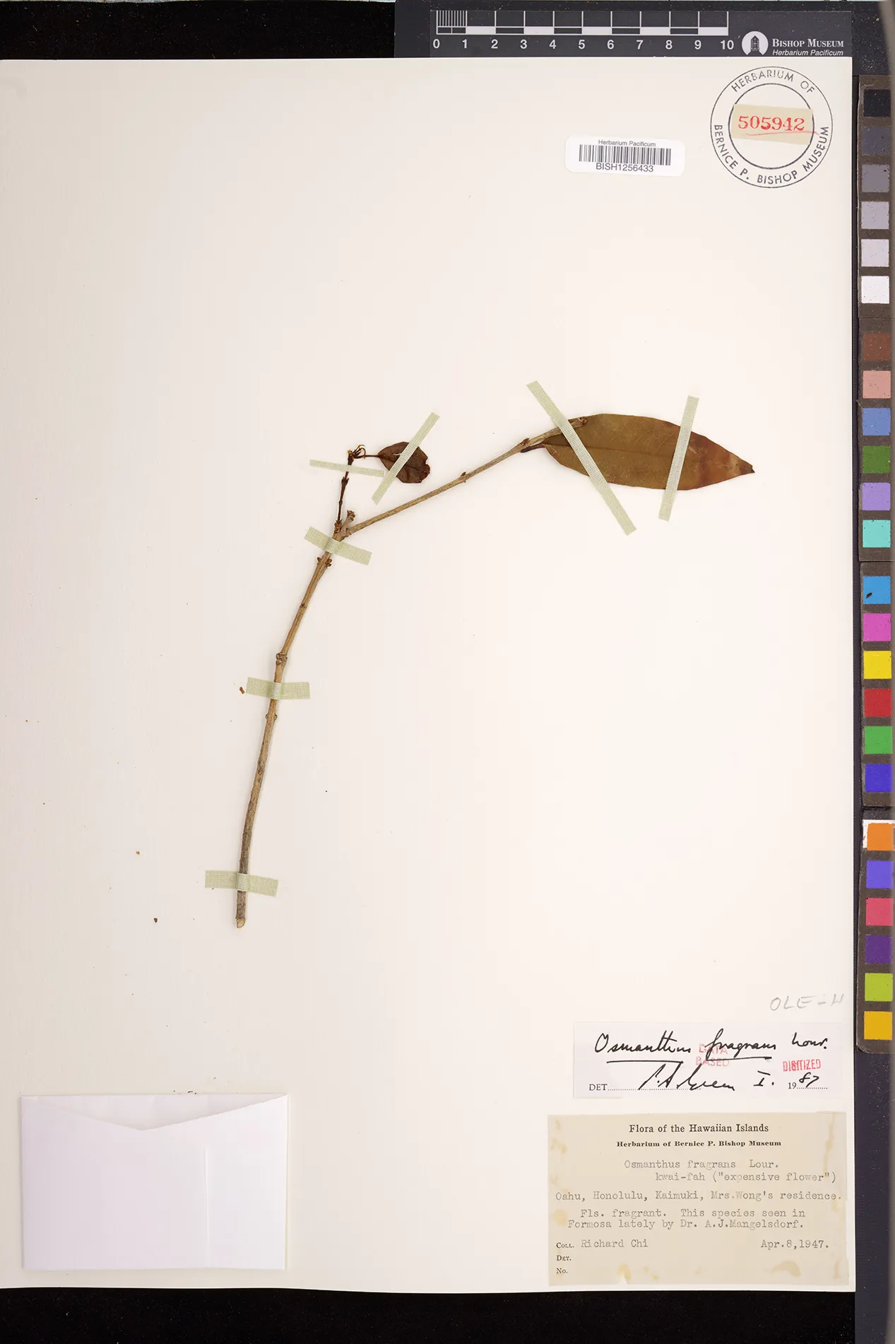 | 13 | Osmanthus fragrans | Lour. | Kaimuki, Wong residence | PRESERVED_SPECIMEN | Chi, R. | s.n. | Oahu | BISH | 4/8/1947 | |