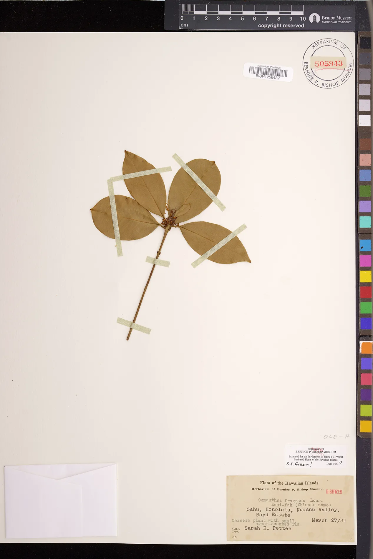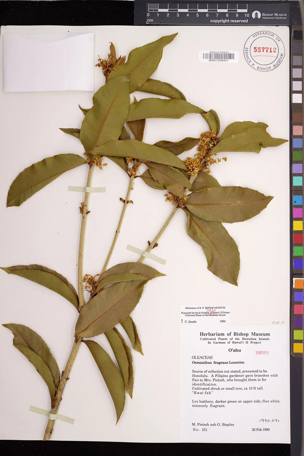 | 12 | Osmanthus fragrans | Lour. | makawao, a. jani's place | garden | PRESERVED_SPECIMEN | degener, o. | collector number: 8197 | Maui | BISH | 1/25/1928 |