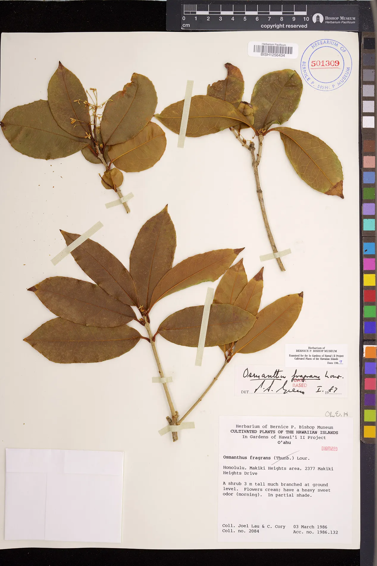 | 10 | Osmanthus fragrans | Lour. | Kaupo, Marciel's garden | PRESERVED_SPECIMEN | Williamson, E. | s.n. | Maui | BISH | 12/1/1961 | |
