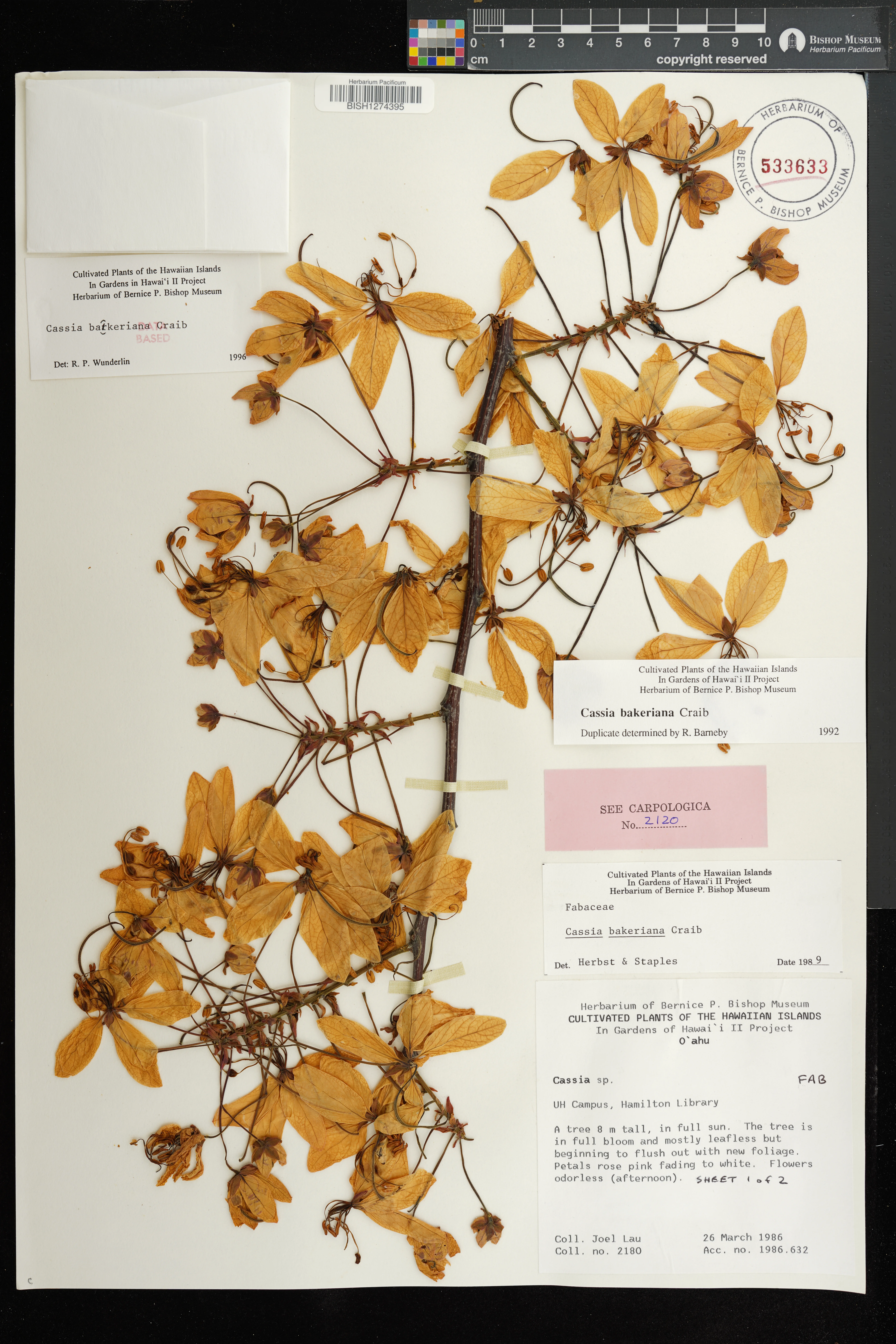 | 5 | Cassia bakeriana | Honolulu, near Kapiolani Park, growing in a private garden at the Diamond Head end of the Park | Preserved_Specimen | Tree. Flws appear while tree is virtually leafless; pet pink, anthers yellow | Rauch, F. | Oahu | BISH | 1992-03-31 |