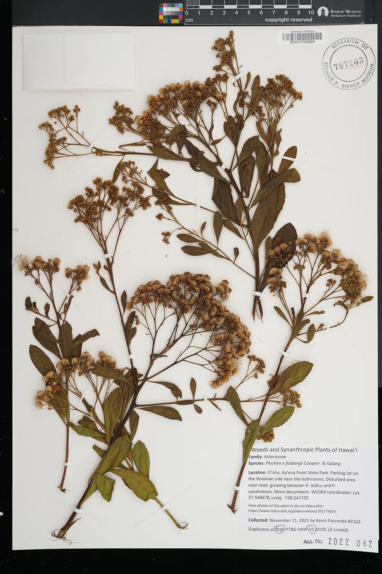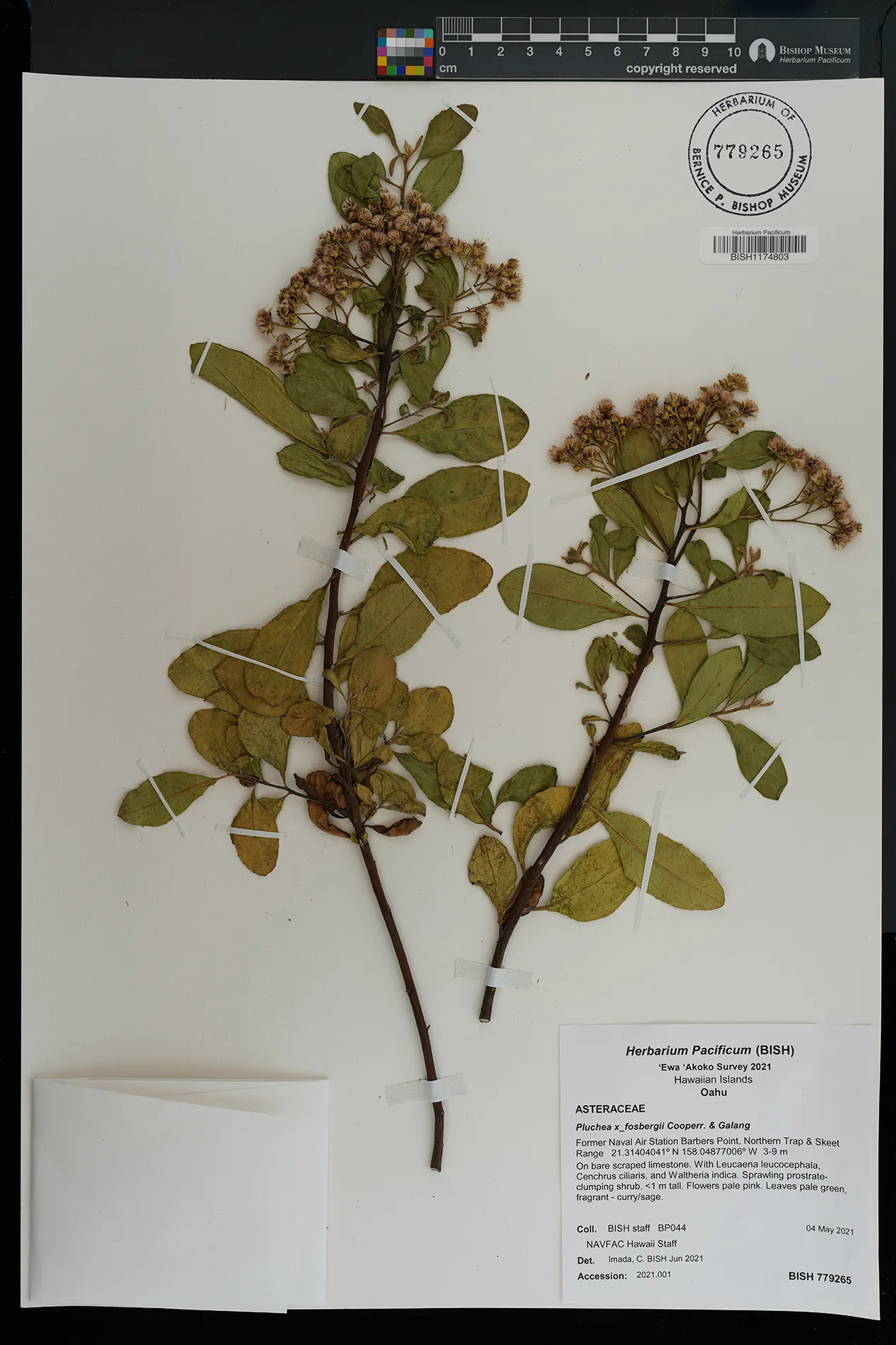 Disturbed roadside, dominated by grasses, Pluchea indica and P. symphytifolia; growing with parents. |