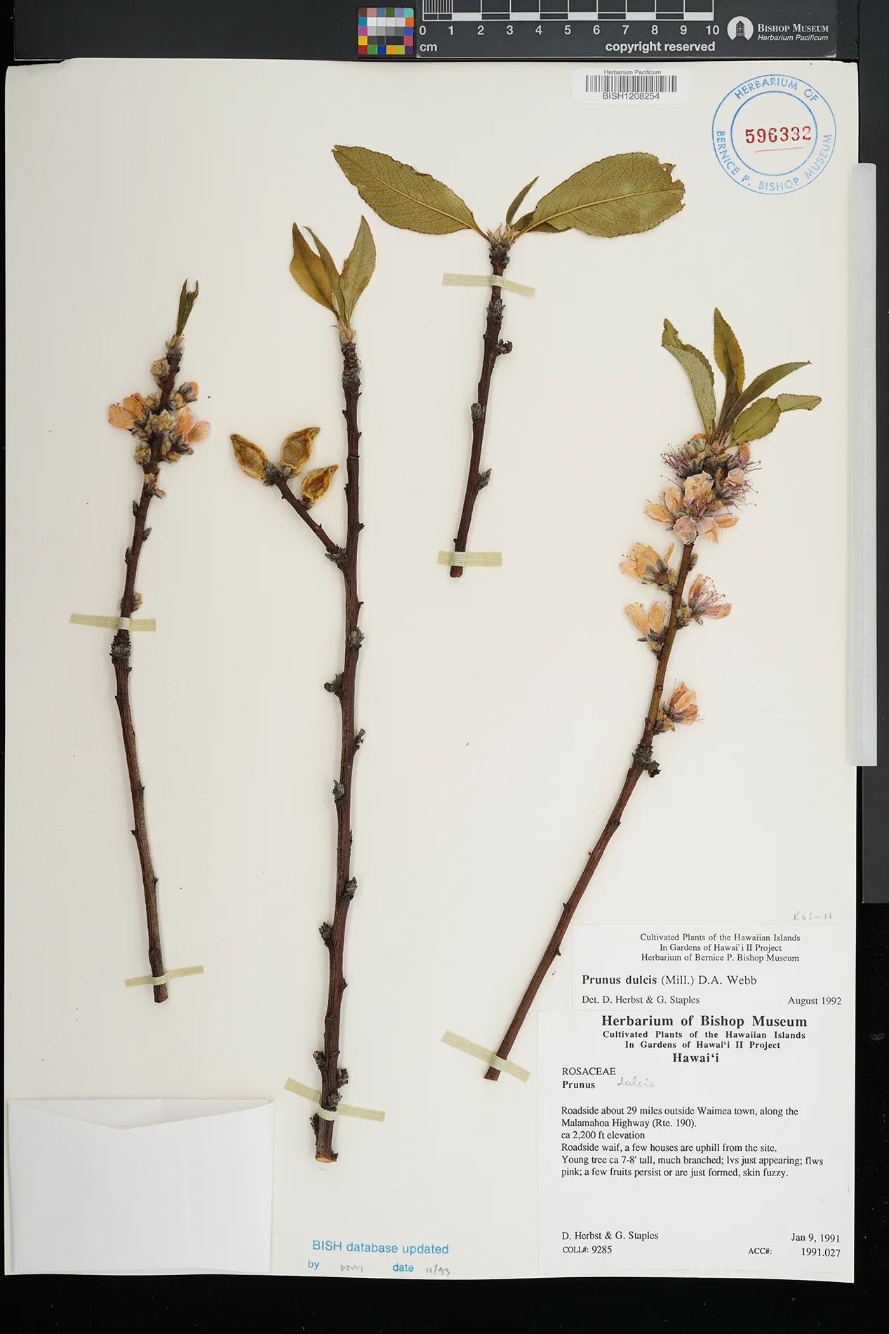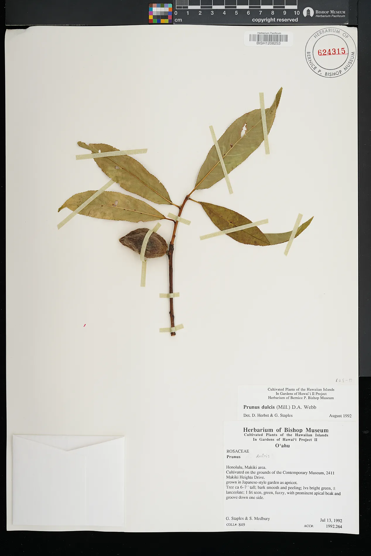 | 2 | Prunus amygdalus | Batsch | S.Kona, Greenwell Ethnobotanical Garden, Captain Cook | beneath large avocado and mango trees | PRESERVED_SPECIMEN | Staples, G. | 629 | Hawaii | BISH | 5/19/1990 |