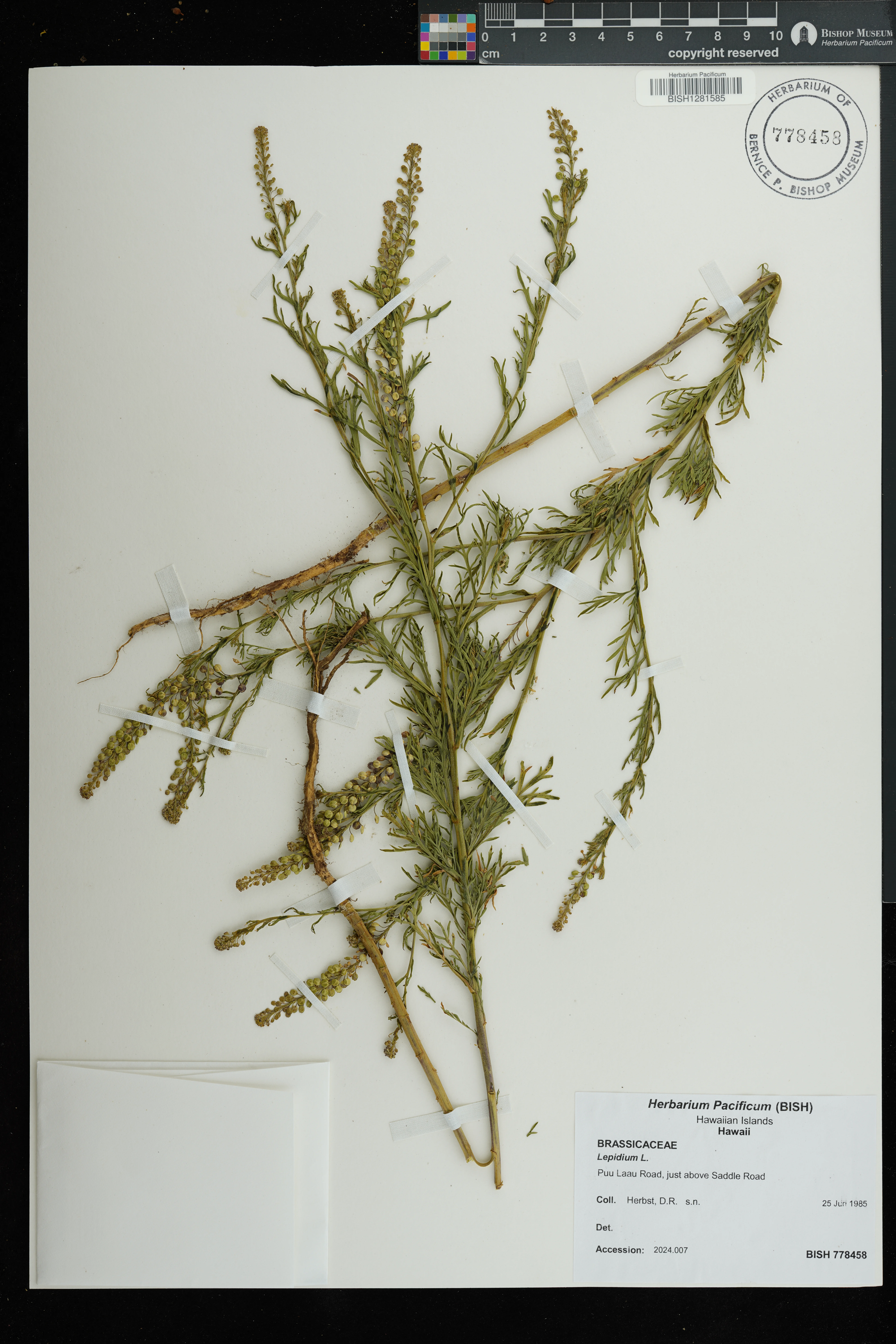 3 Lepidium bonariense L. mauna kea state park, 18.4 mi along saddle road from jct. hawai'i belt rd. PRESERVED_SPECIMEN w. l. wagner, s. w. miller, t. g. lammers, s. g. weller, s. sakai & j. jacobson 5575 Hawaii US 6/25/1985