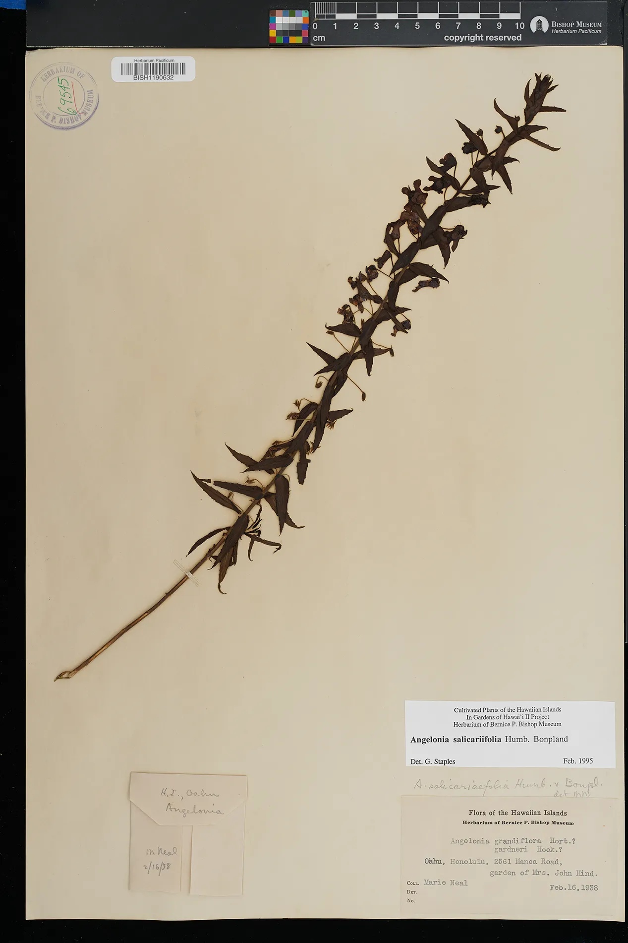 | 2 | Angelonia salicariifolia | Bonpl. | Honolulu, 2561 Manoa Rd., garden of Mrs.John Hind | PRESERVED_SPECIMEN | Neal, M.C. | s.n. | Oahu | BISH | 2/16/1938 | |