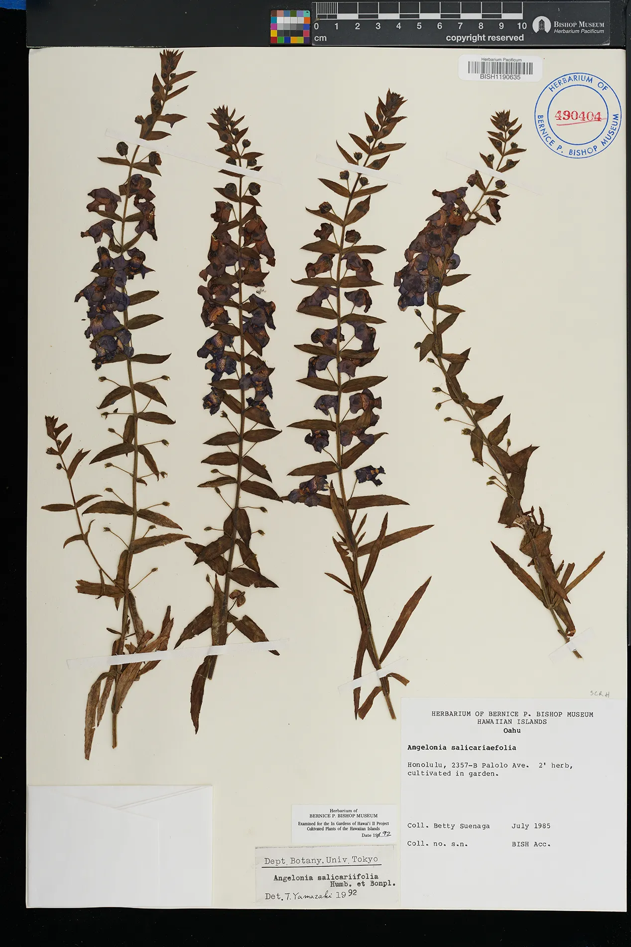 | 9 | Angelonia salicariifolia | Bonpl. | Honolulu, 2357-B Palolo Ave | garden | PRESERVED_SPECIMEN | Suenaga, B. | s.n. | Oahu | BISH | 7/1/1985 |