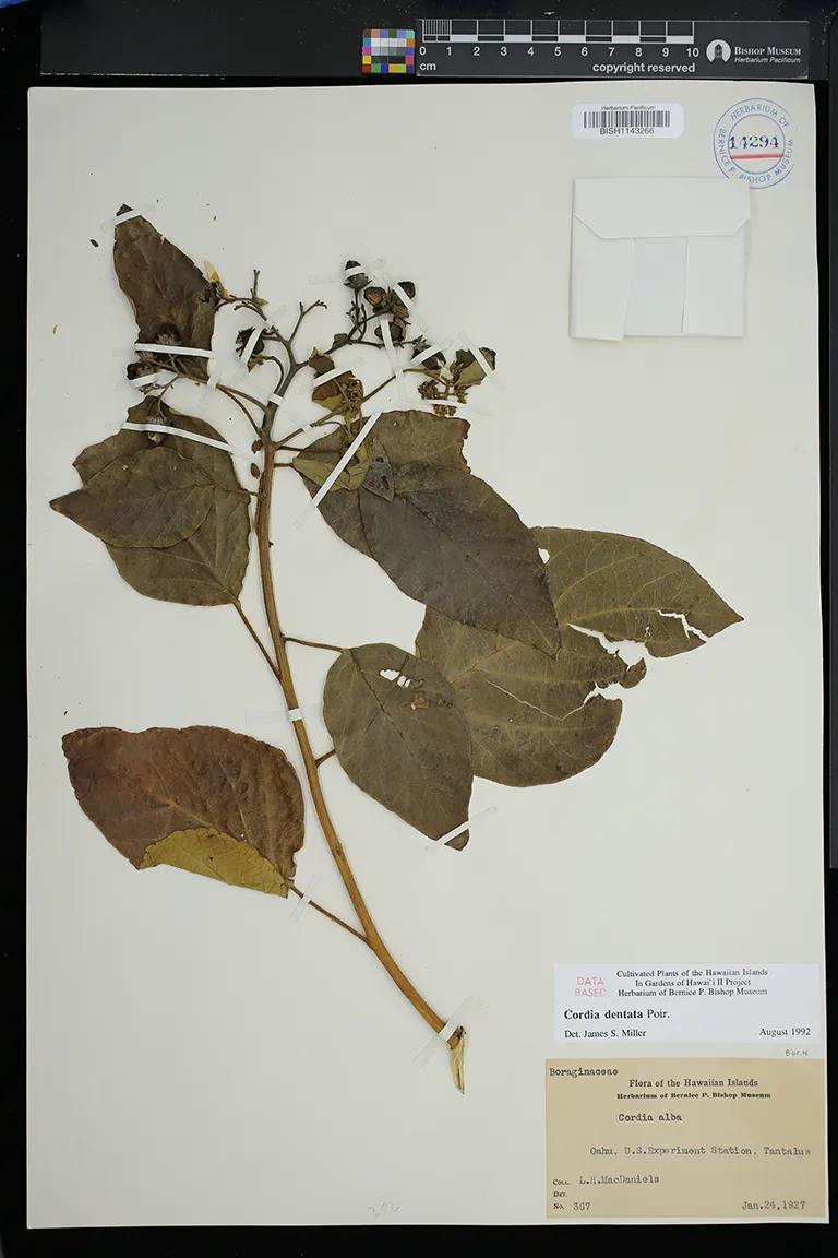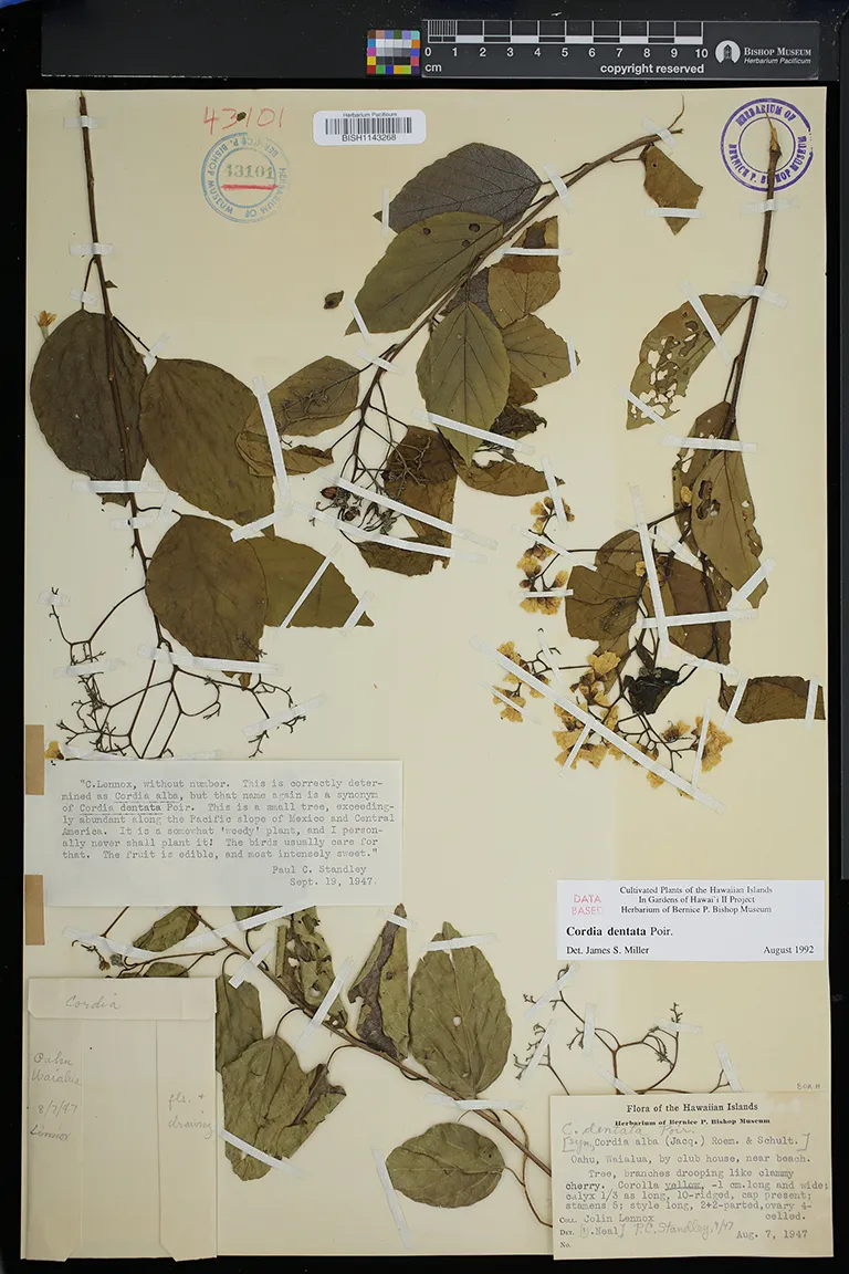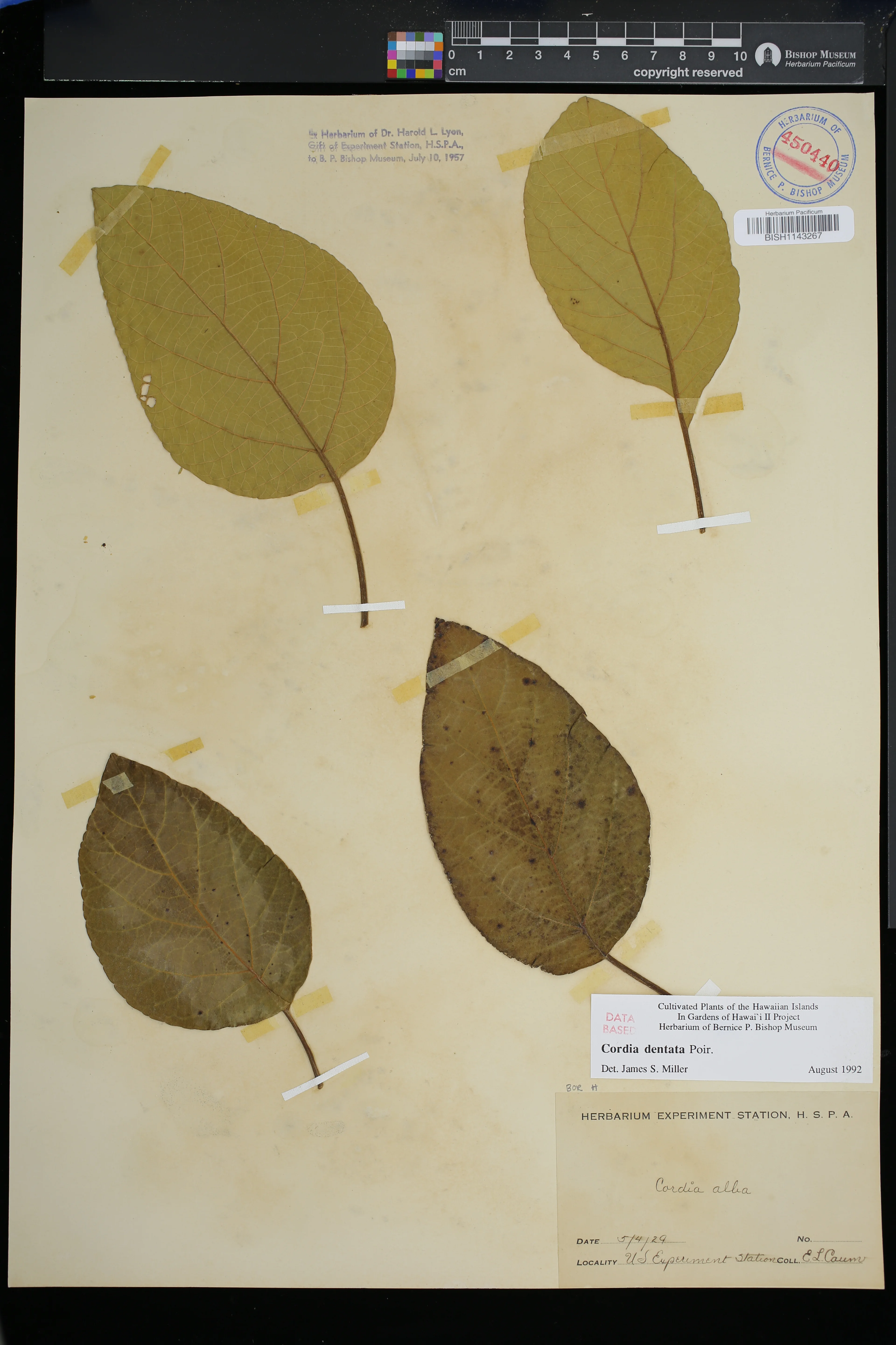 | 7 | Cordia dentata | Poir. | honolulu, u.s. experiment station | PRESERVED_SPECIMEN | caum, e.l. | collector number: s.n. | Maui | BISH | 5/4/1929 | |