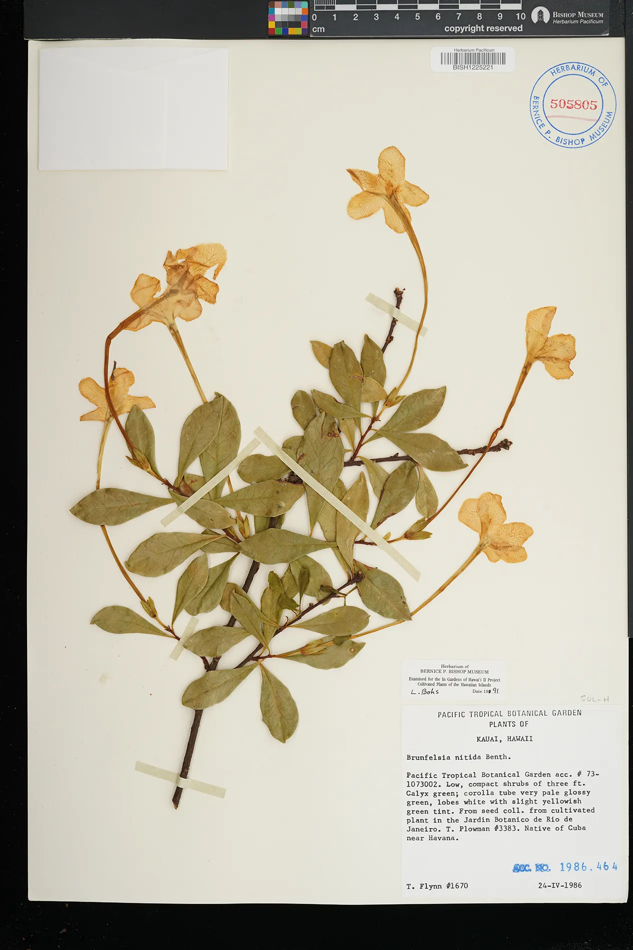 | 5 | Brunfelsia nitida | Benth. | Pacific Tropical Botanical Garden | PRESERVED_SPECIMEN | Flynn, T. | 1670 | Kauai | BISH | 4/24/1986 | |