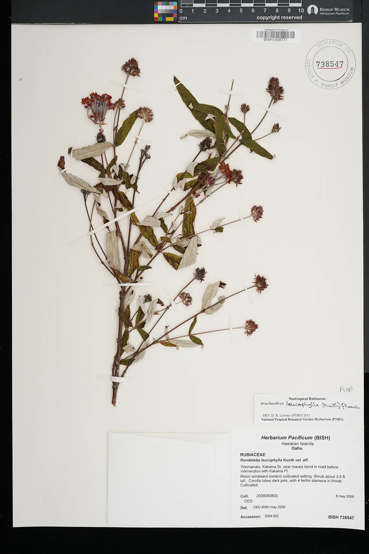 | 5 | Arachnothryx leucophylla | (Kunth) Planch. | Waimanalo, Kakaina St, near mauka bend in road before intersection with Kakaina Pl. | Mesic windward lowland cultivated setting. | PRESERVED_SPECIMEN | OED | 2009050803 | Oahu | BISH | 5/8/2009 |