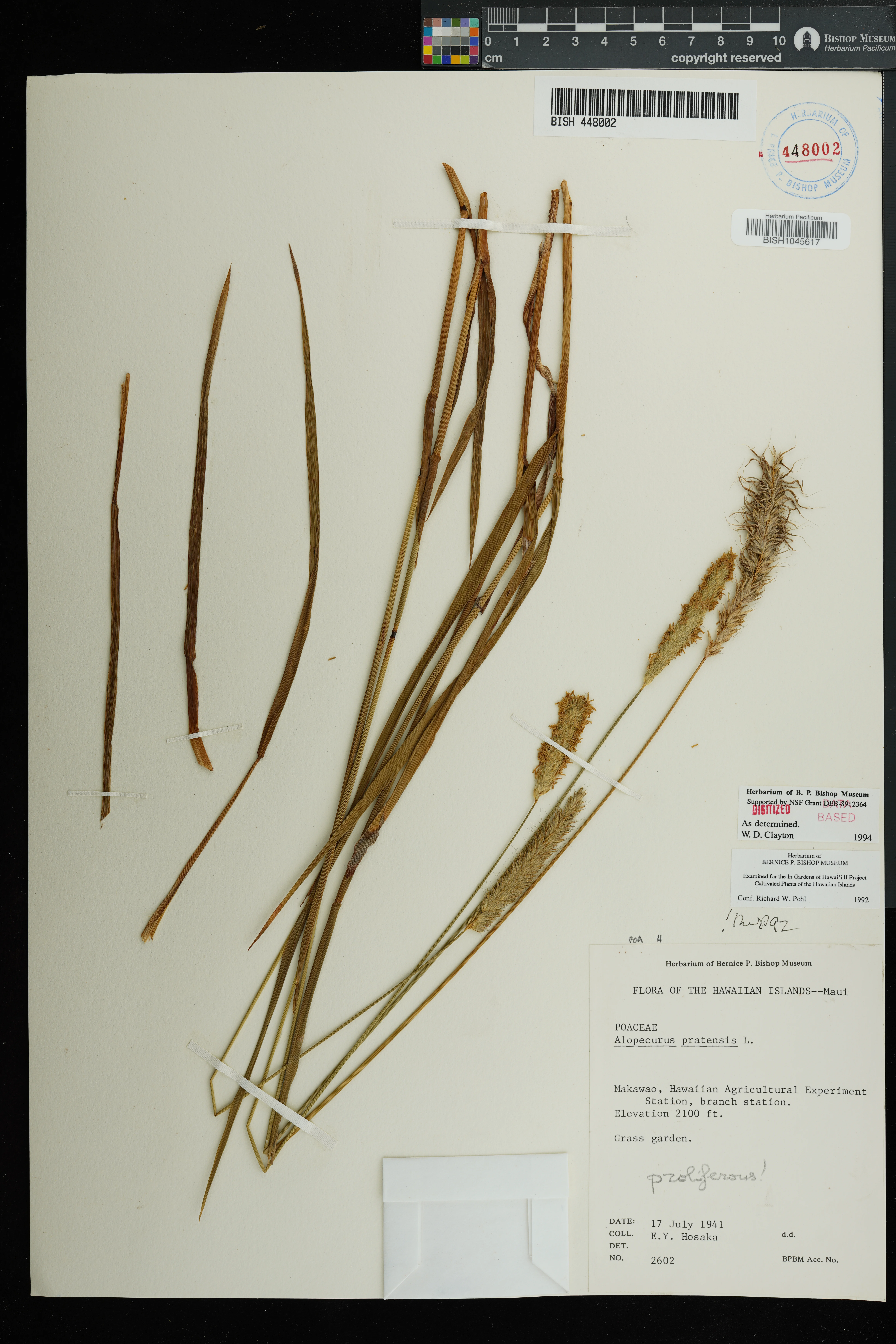 | 2 | Alopecurus pratensis | L. | makawao haleakala br. sta | PRESERVED_SPECIMEN | hosaka, e.y. | collector number: 2670 | Oahu | BISH | 7/23/1943 | |