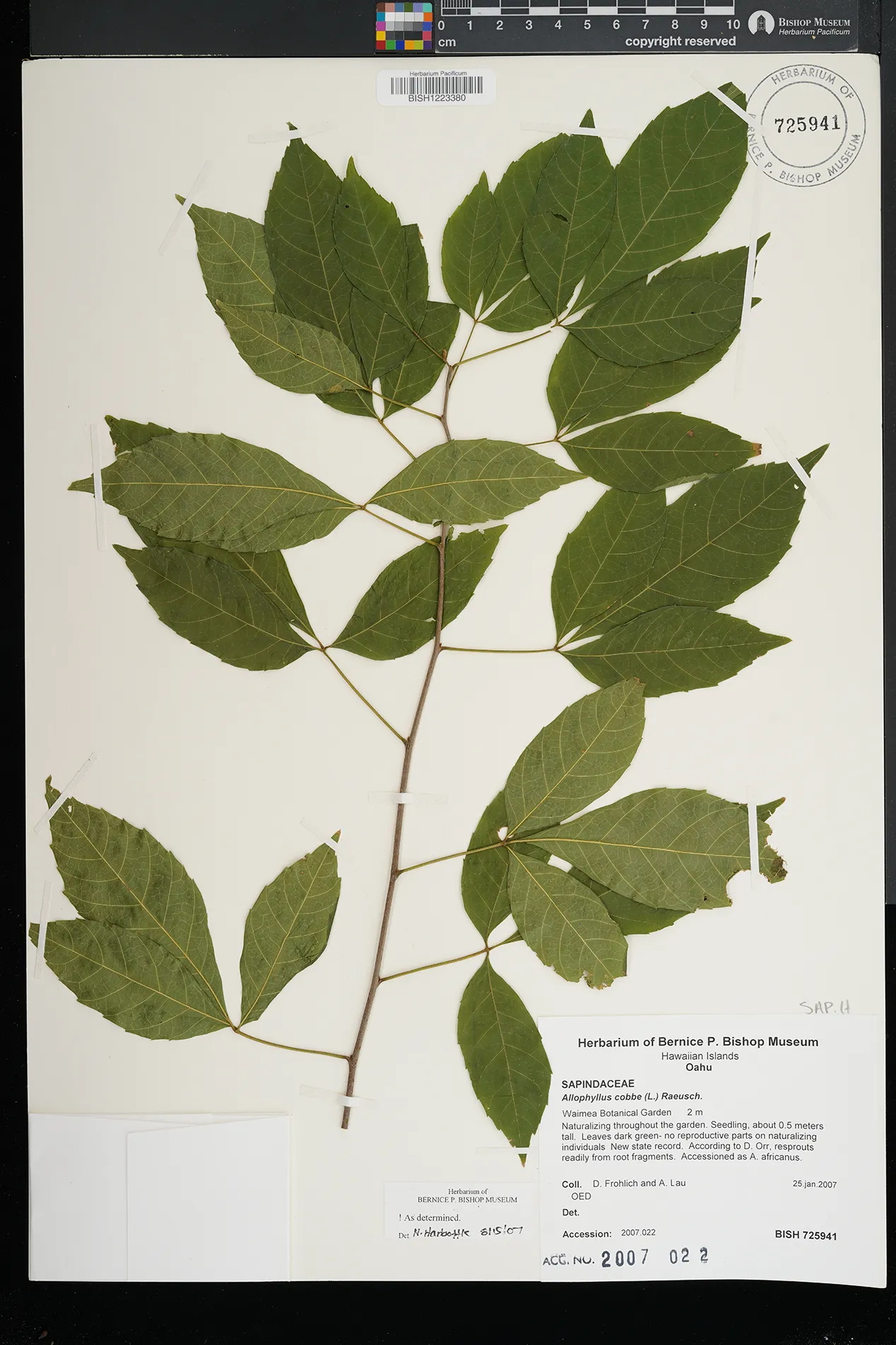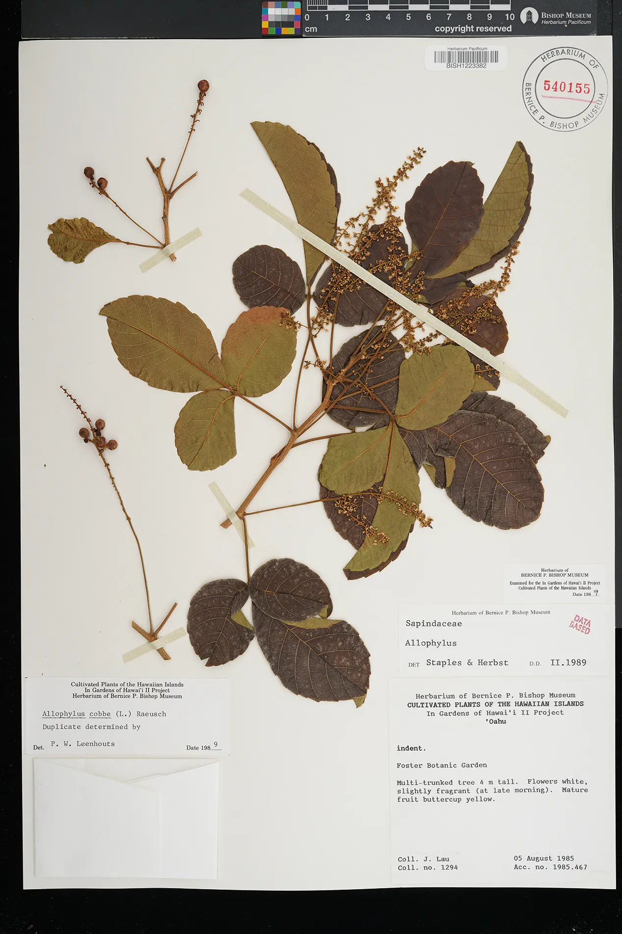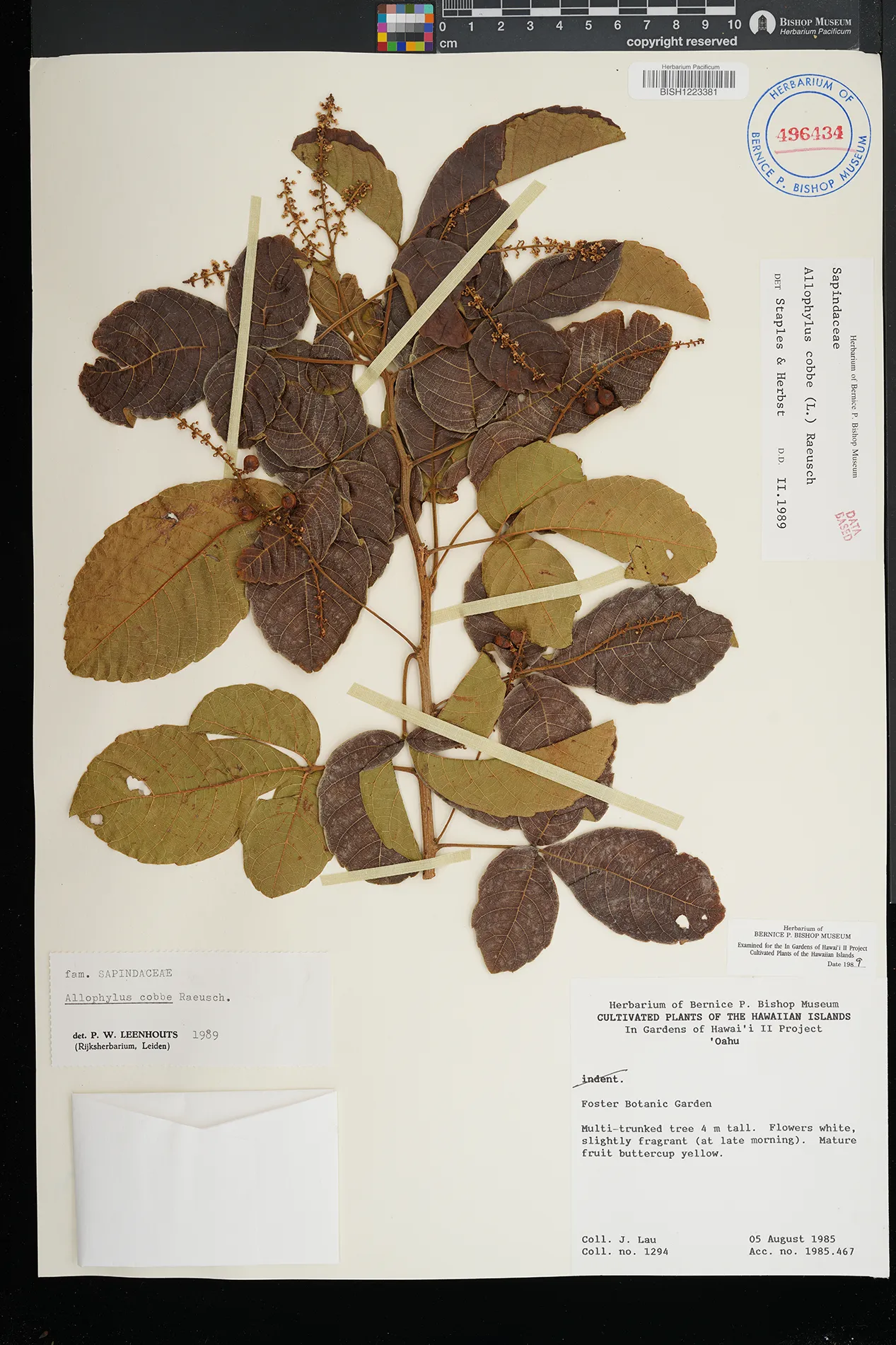 | 5 | Allophylus cobbe | (L.) Forsyth f. | Waimea Botanical Garden | Naturalizing throughout the garden. | PRESERVED_SPECIMEN | OED | s.n. | Oahu | BISH | 1/25/2007 |