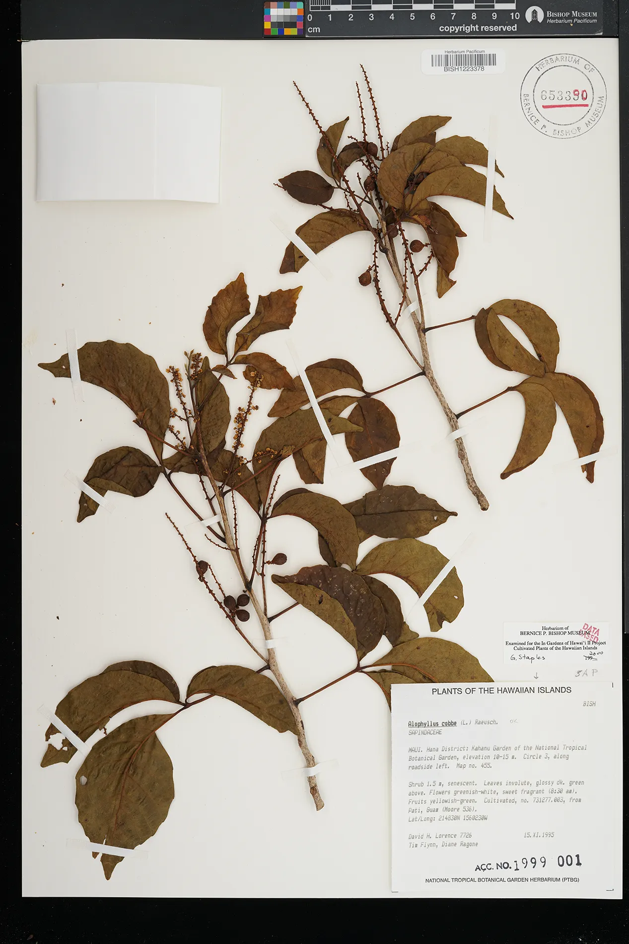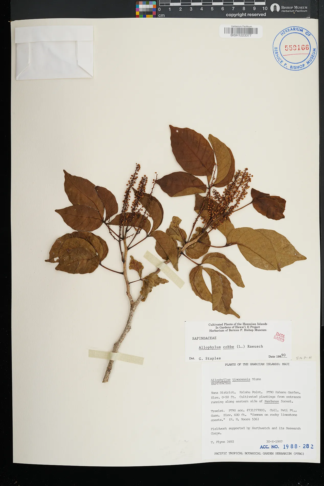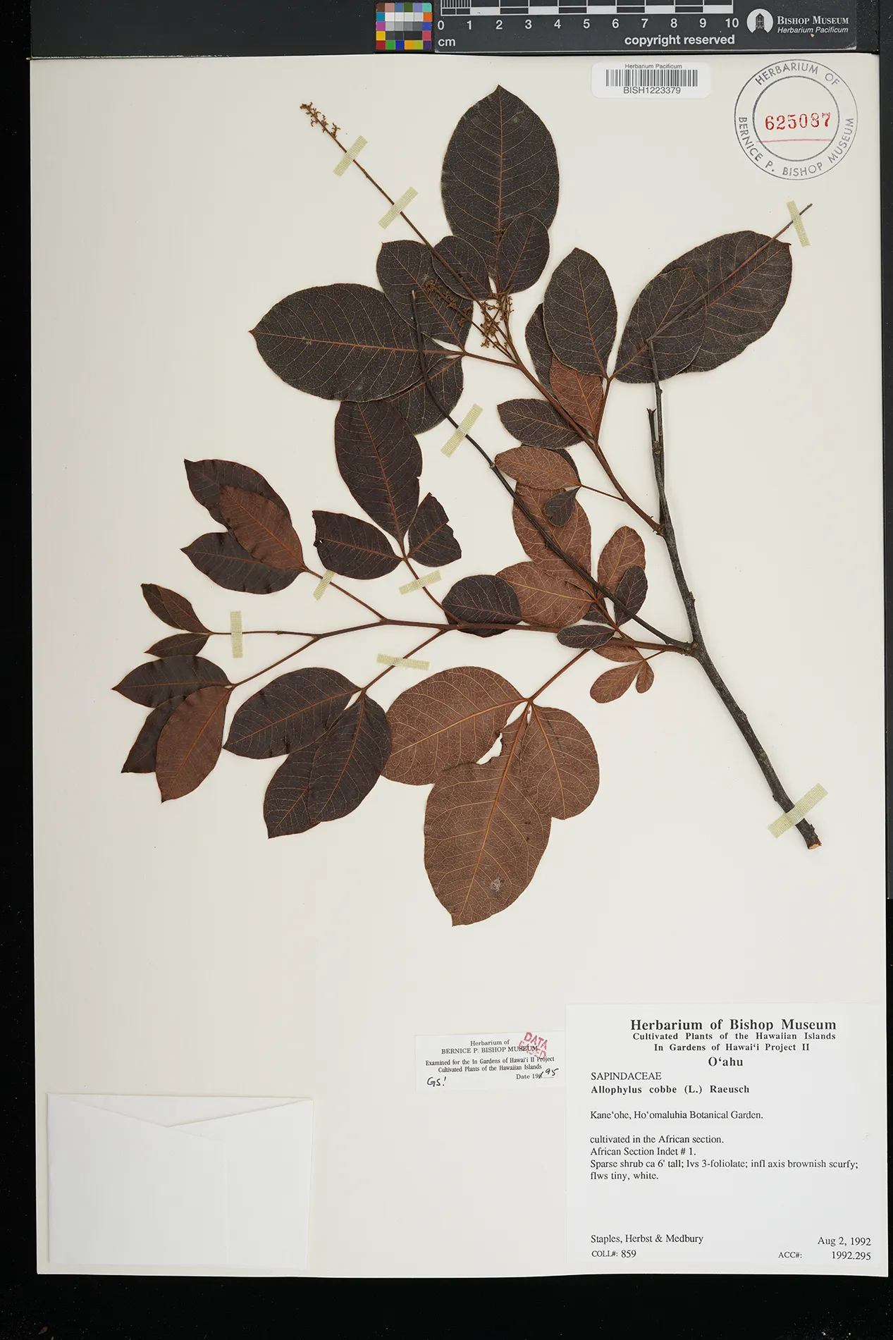 | 5 | Allophylus cobbe | (L.) Forsyth f. | Waimea Botanical Garden | Naturalizing throughout the garden. | PRESERVED_SPECIMEN | OED | s.n. | Oahu | BISH | 1/25/2007 |