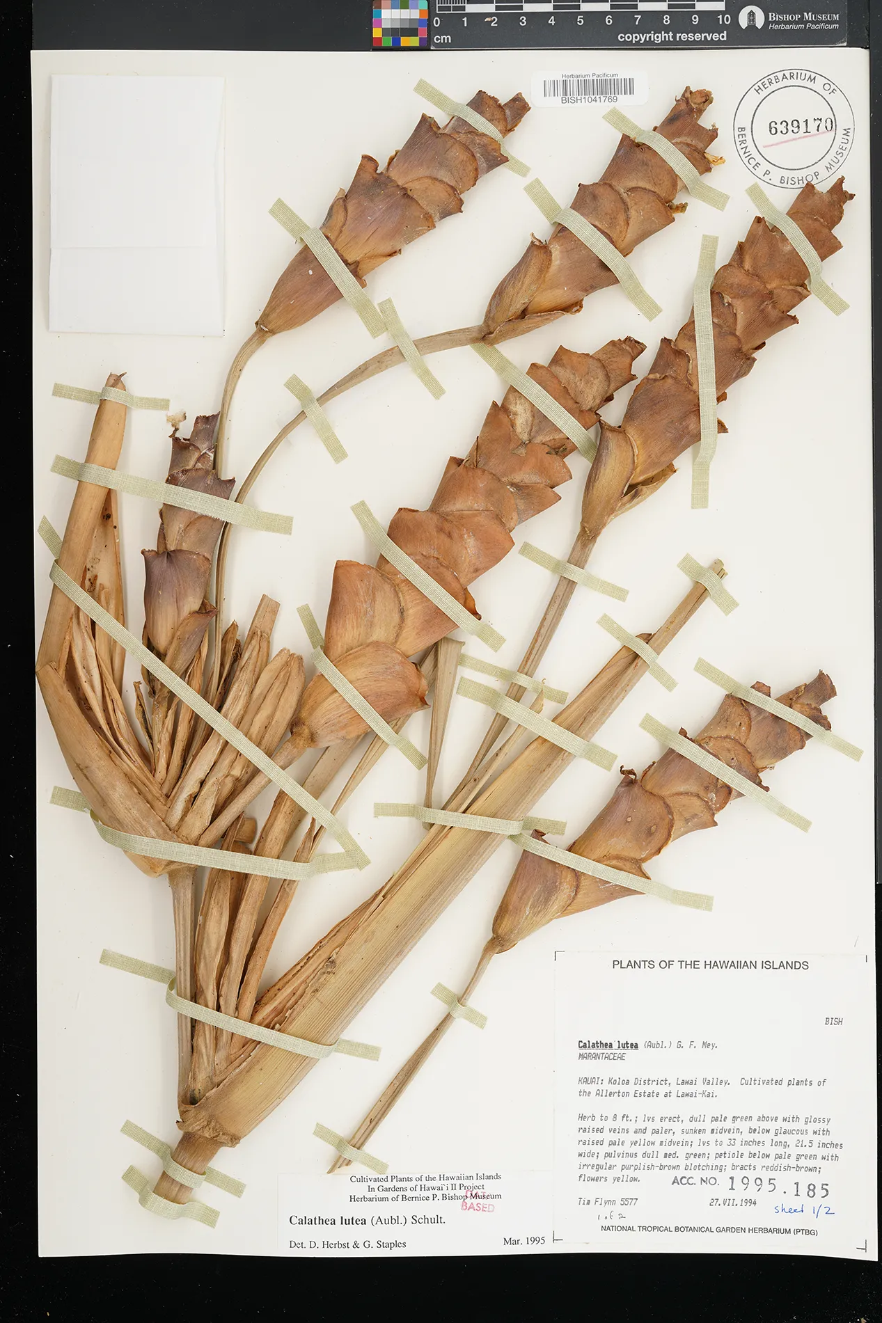 | 8 | Calathea lutea | (Aubl.) E.Mey. ex Schult. | koloa dist.; lawai valley, allerton estate at lawai-kai | PRESERVED_SPECIMEN | flynn, t. | collector number: 5577 | Kauai | BISH | 7/27/1994 |
