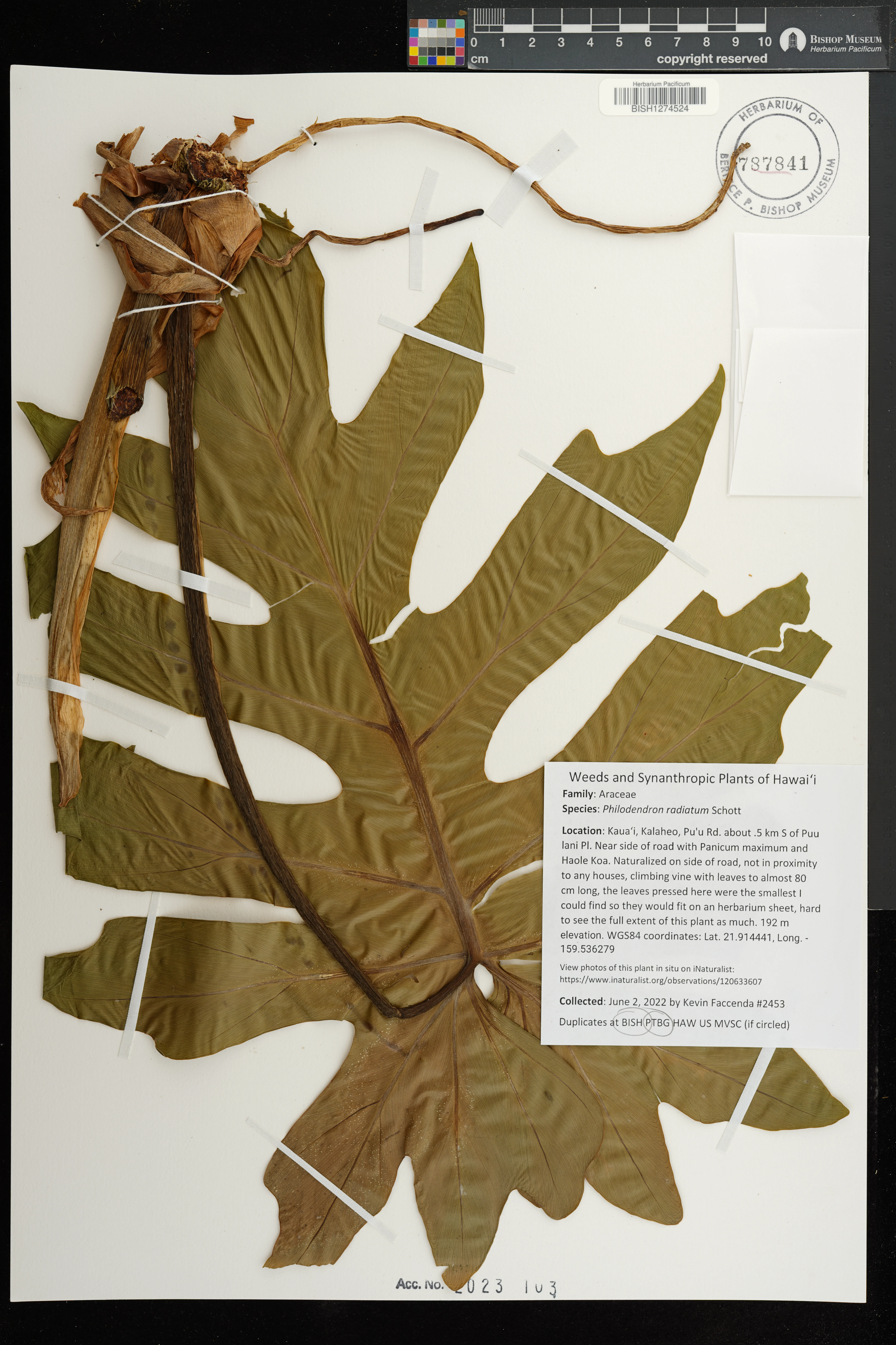 Naturalized on side of road, not in proximity to any houses, climbing vine with leaves to almost 80 cm long, the leaves pressed here were the smallest I could find so they would fit on an herbarium sheet, hard to see the full extent of this plant as much |