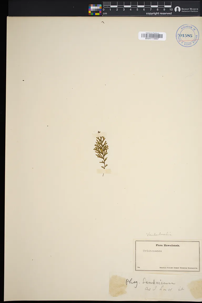 Kingdom: Viridiplantae Phylum: Pteridophyta Class/Clade: Polypodiopsida Order: Hymenophyllales Family: Hymenophyllaceae Genus: Vandenboschia