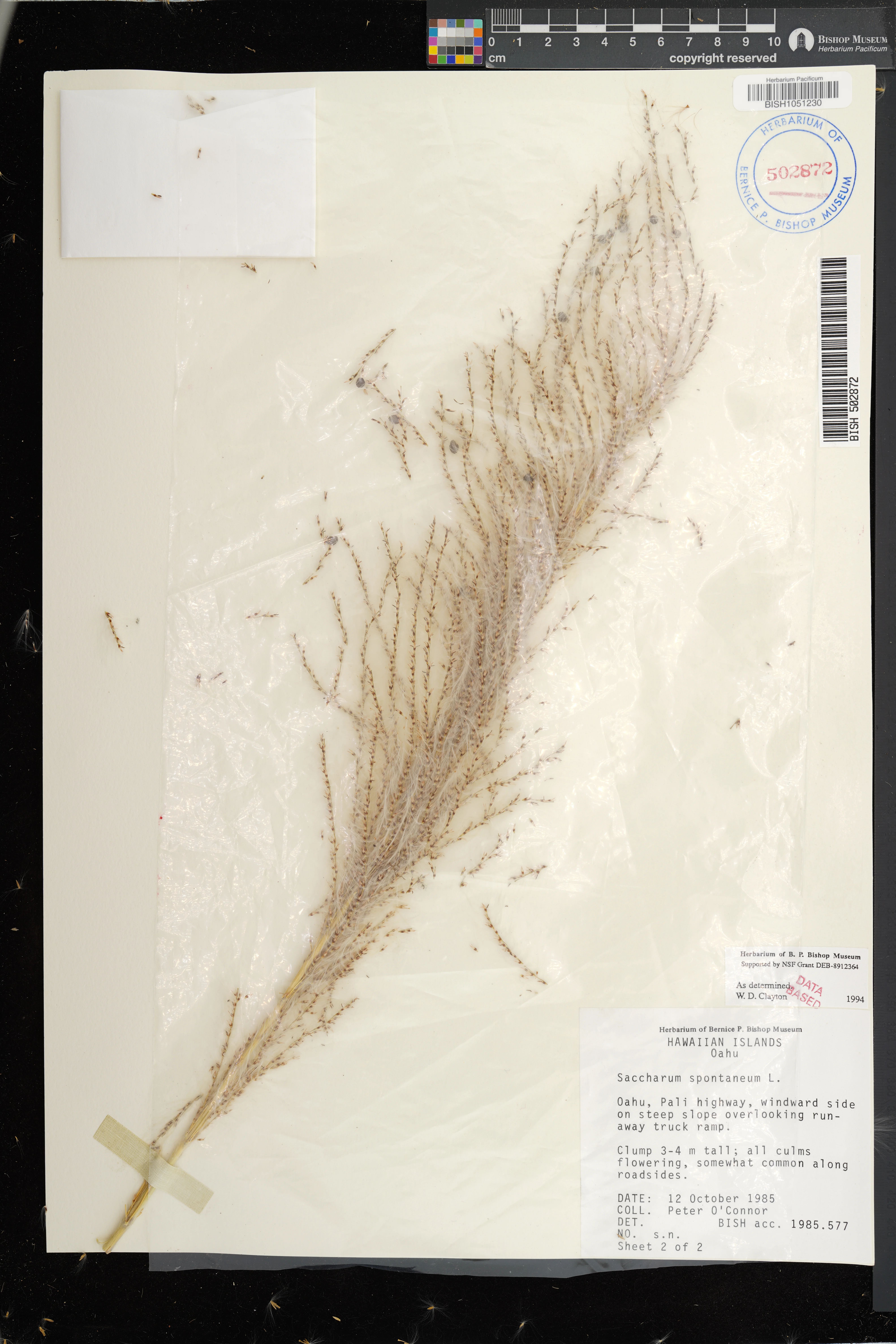| 4 | Saccharum spontaneum | L. | pali hwy, windward side overlooking runaway truck ramp | On steep slope. Somewhat common on roadsides. | PRESERVED_SPECIMEN | o'connor, p.j. | collector number: s.n. | Oahu | BISH | 10/12/1985 |