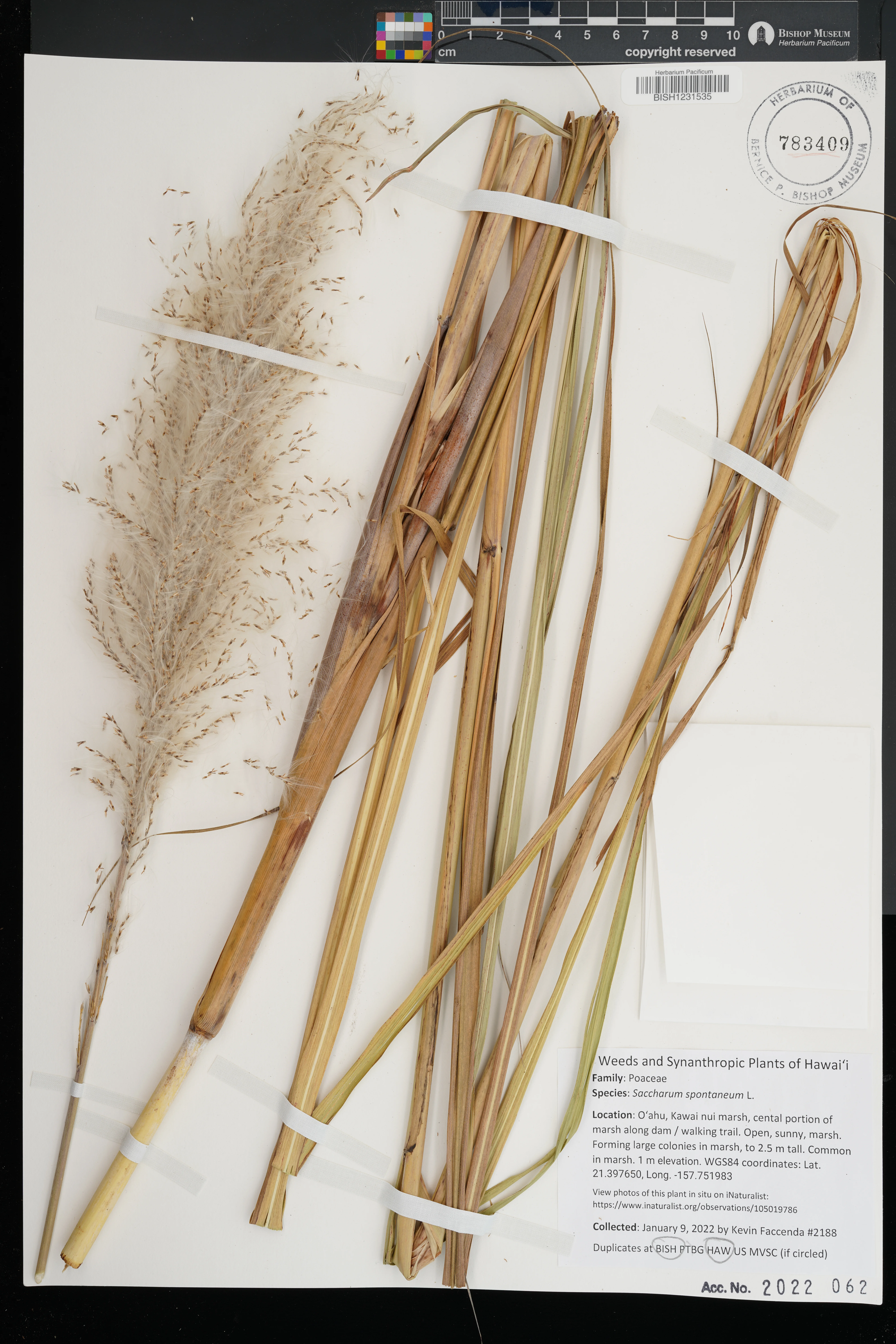 | 3 | Saccharum spontaneum | L. | Streamside near Schofield/ Waikane trailhead. | On riverbank surrounded by rocks. Dicranopteris linearis nearby. | PRESERVED_SPECIMEN | NARS | s.n. | Oahu | BISH | 9/12/2013 |