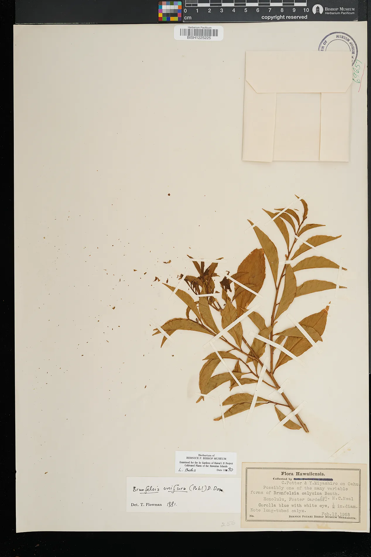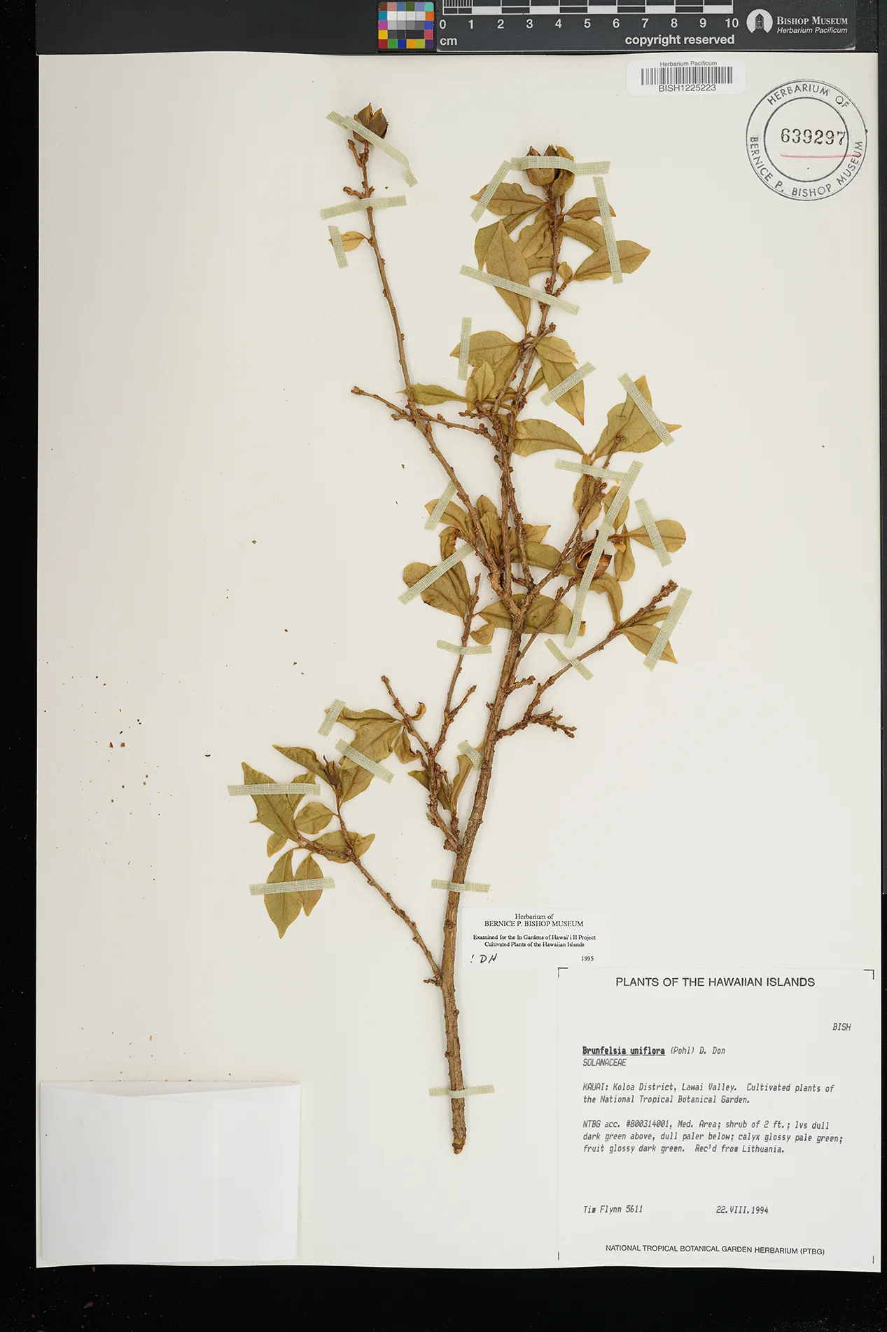 | 5 | Brunfelsia uniflora | (Pohl) D.Don | foster botanic garden | PRESERVED_SPECIMEN | lau, j. | collector number: 1599 | Kauai | BISH | 11/5/1985 |
