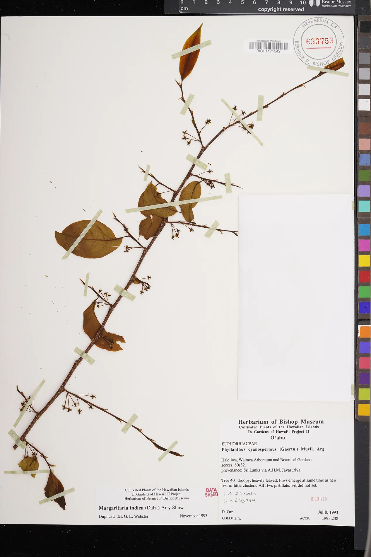 1 Margaritaria indica (Dalzell) Airy Shaw haleiwa, waimea arboretum PRESERVED_SPECIMEN orr, d. Oahu BISH 7/8/1993
