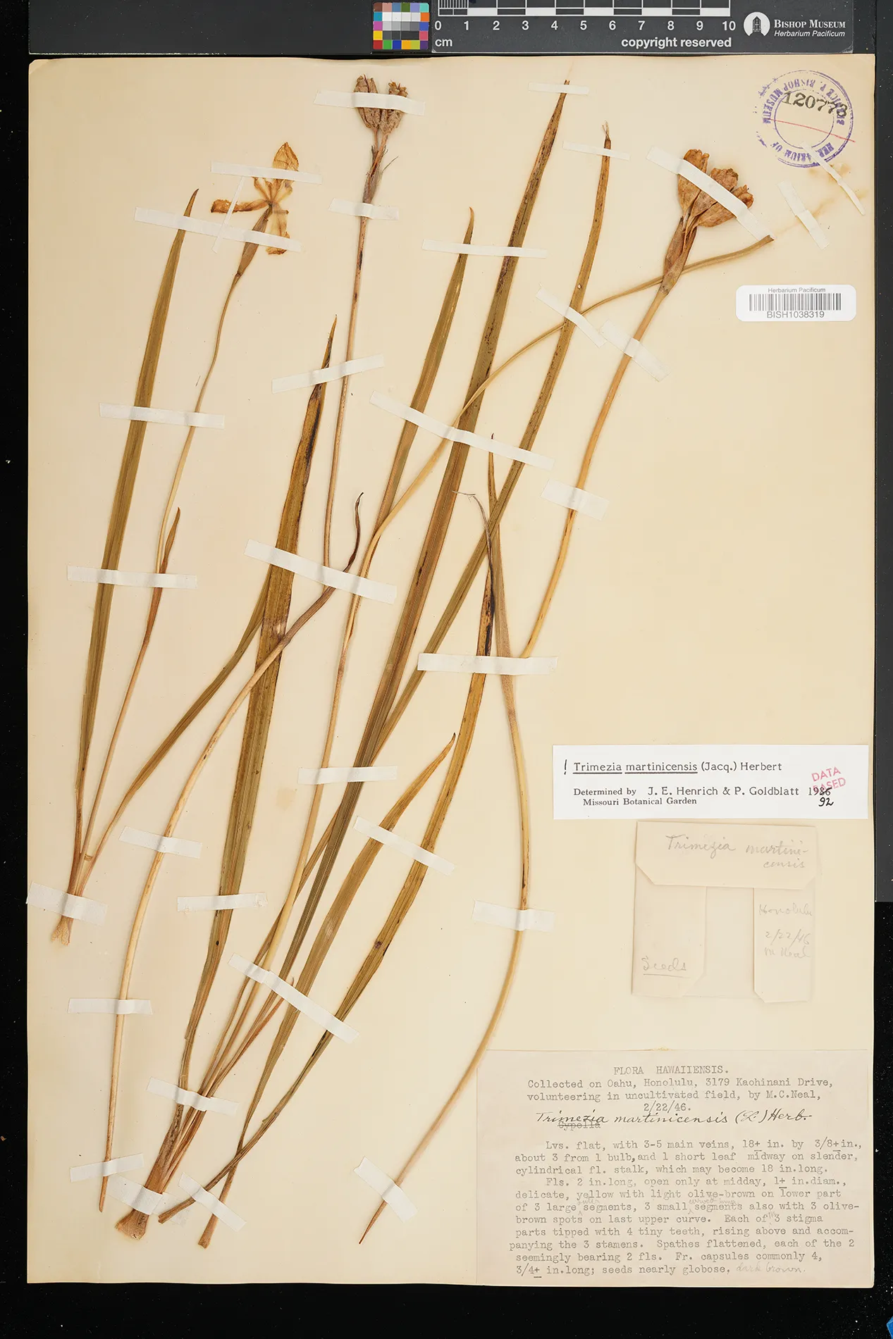 | 21 | Trimezia martinicensis | (Jacq.) Herb. | Honolulu, 3179 Kaohinani Dr | Volunteering in uncultivated field. | PRESERVED_SPECIMEN | Neal, M.C. | s.n. | Oahu | BISH | 2/22/1946 |